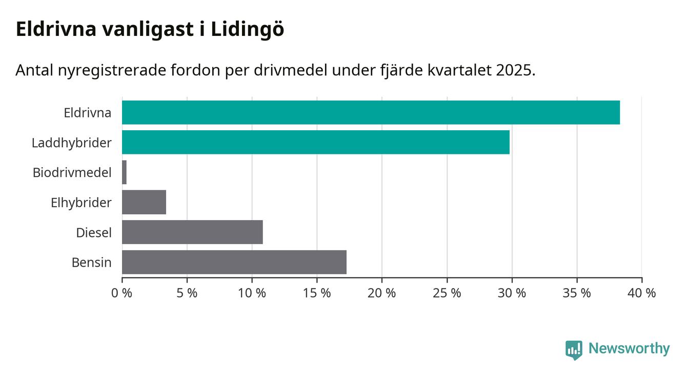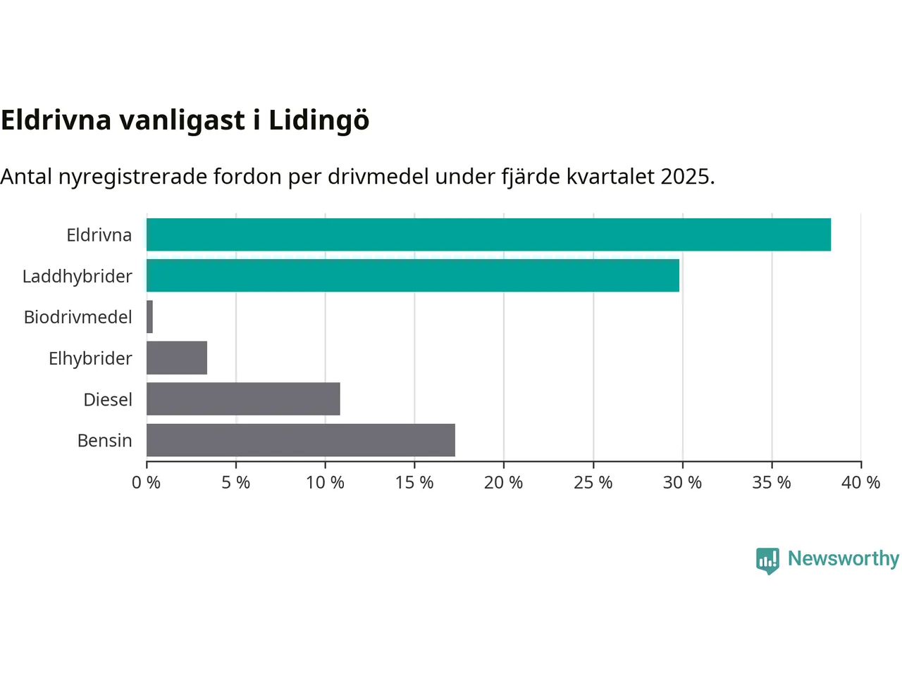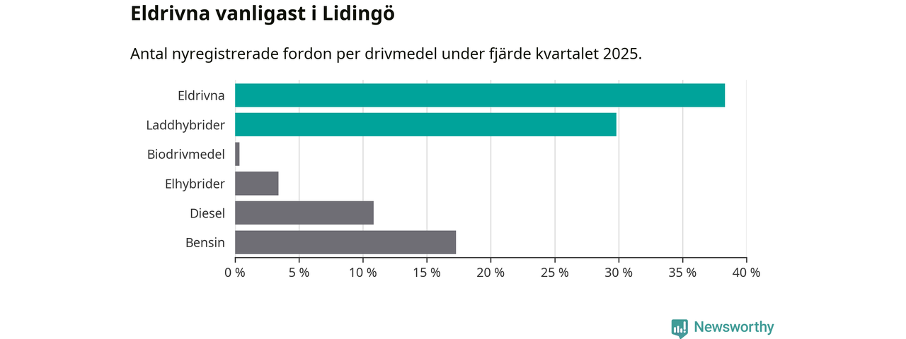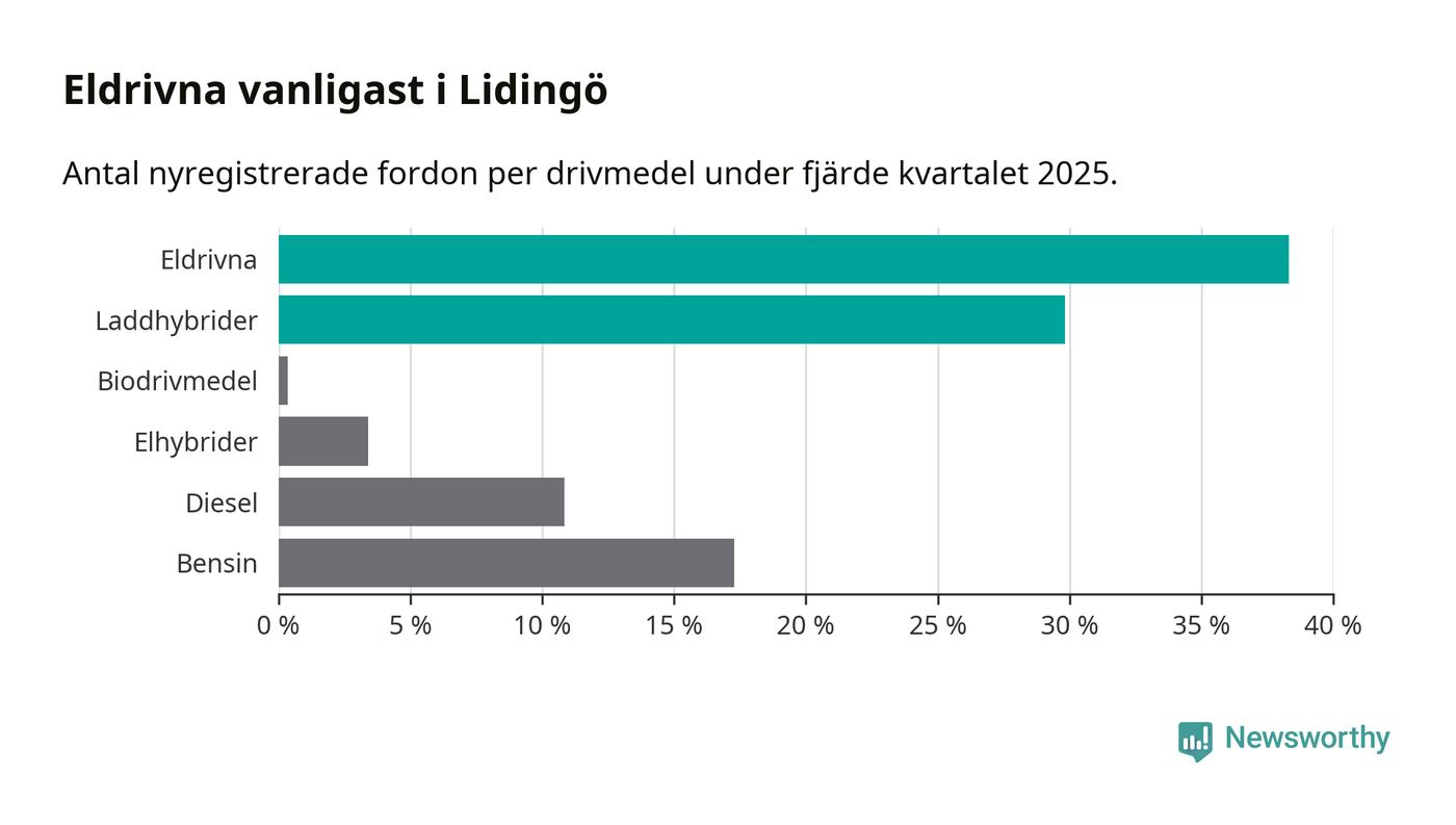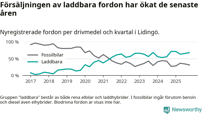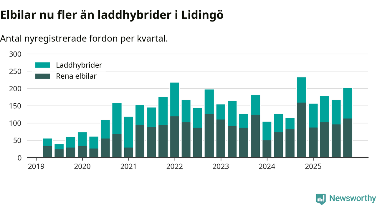 Under fjärde kvartalet 2025 var 68 procent av alla nyregistrerade personbilar på Lidingö laddbara (sammanlagt registrerades 295 nya bilar). Merparten av de laddbara bilarna var rena elbilar (38 procent av alla).