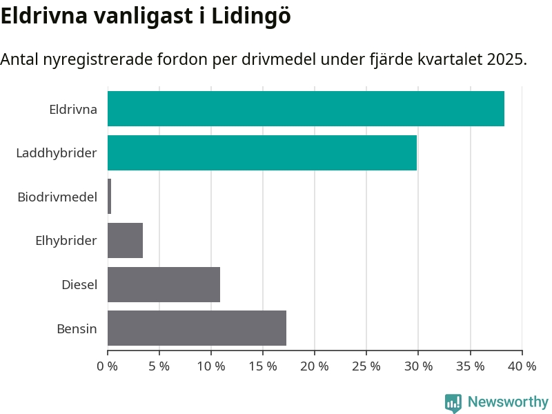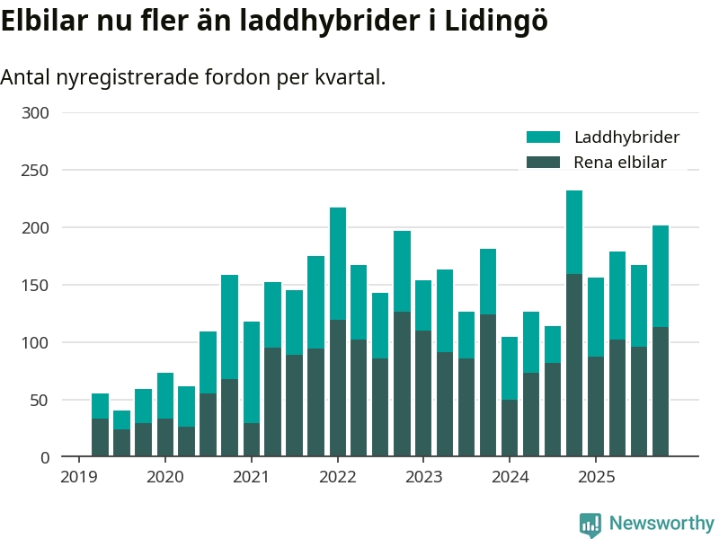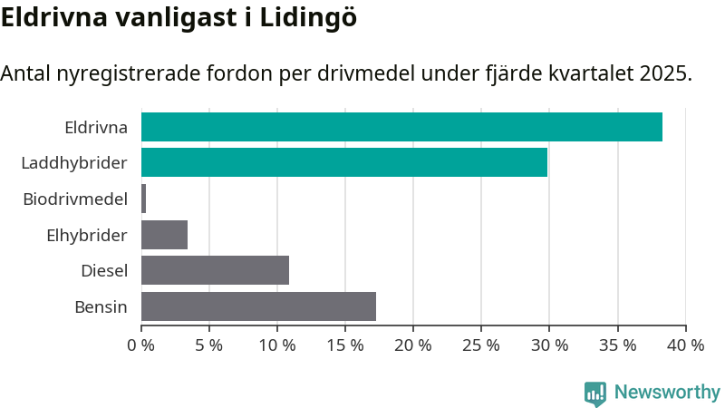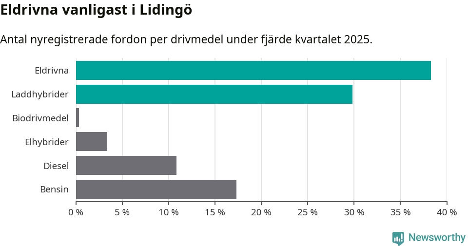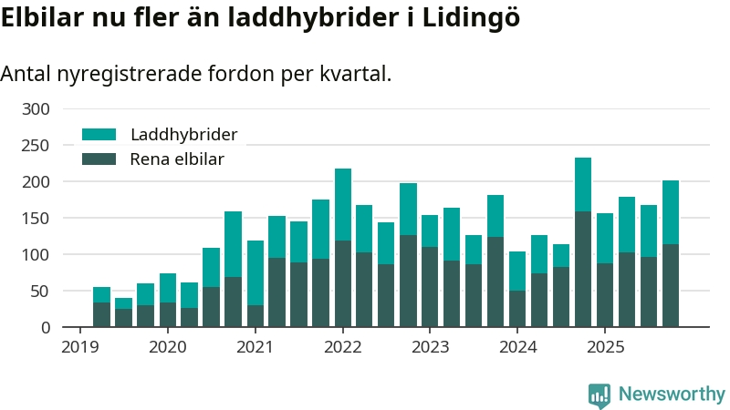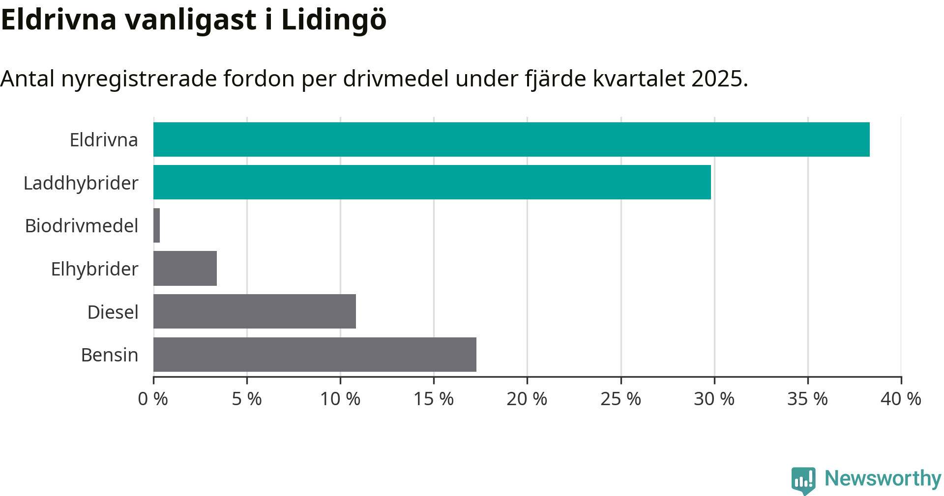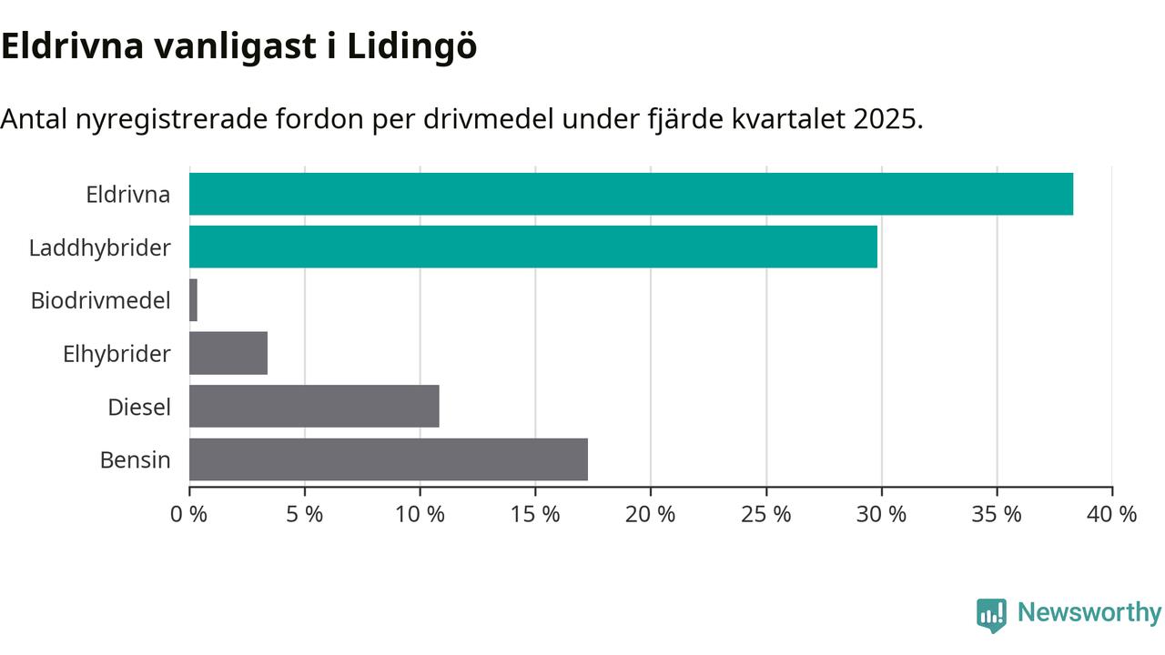 Under fjärde kvartalet 2025 var 68 procent av alla nyregistrerade personbilar på Lidingö laddbara (sammanlagt registrerades 295 nya bilar). Merparten av de laddbara bilarna var rena elbilar (38 procent av alla).