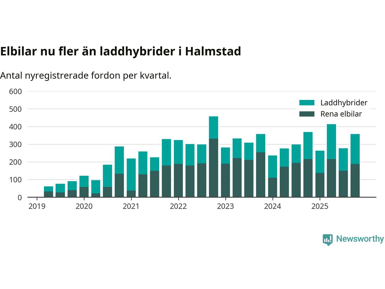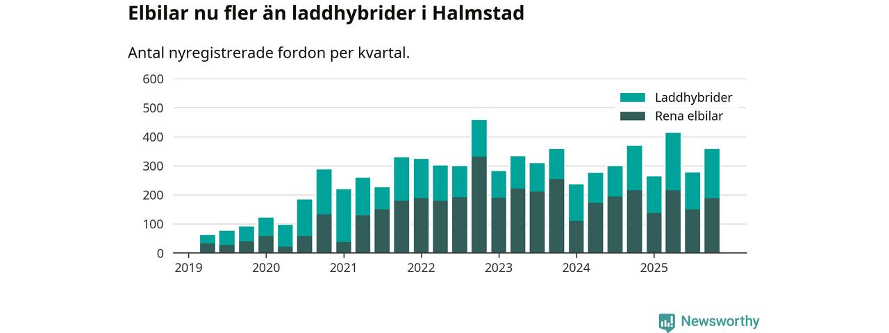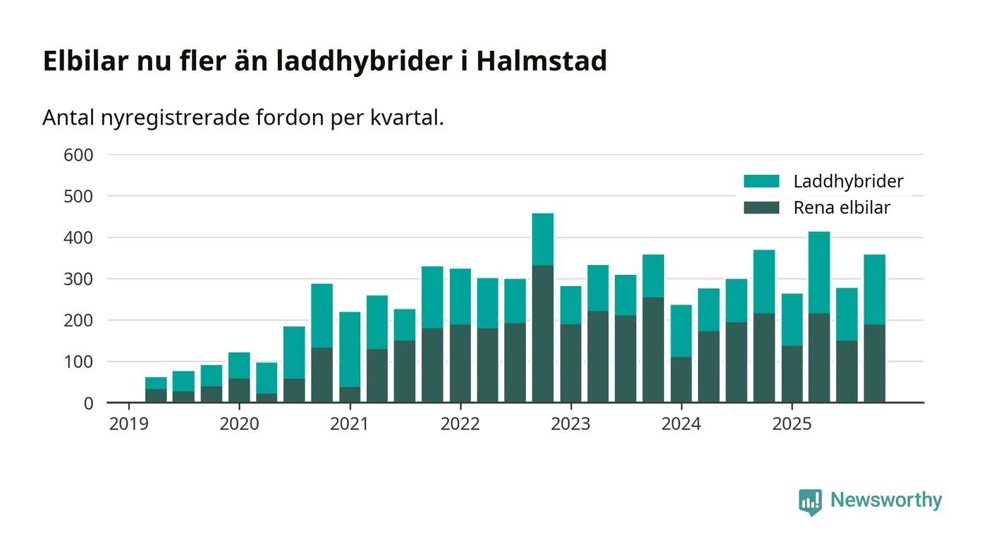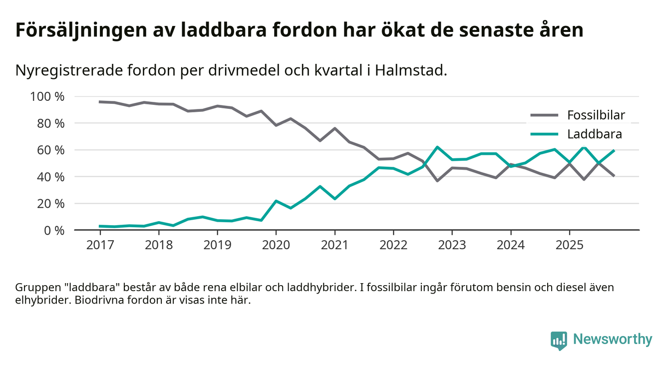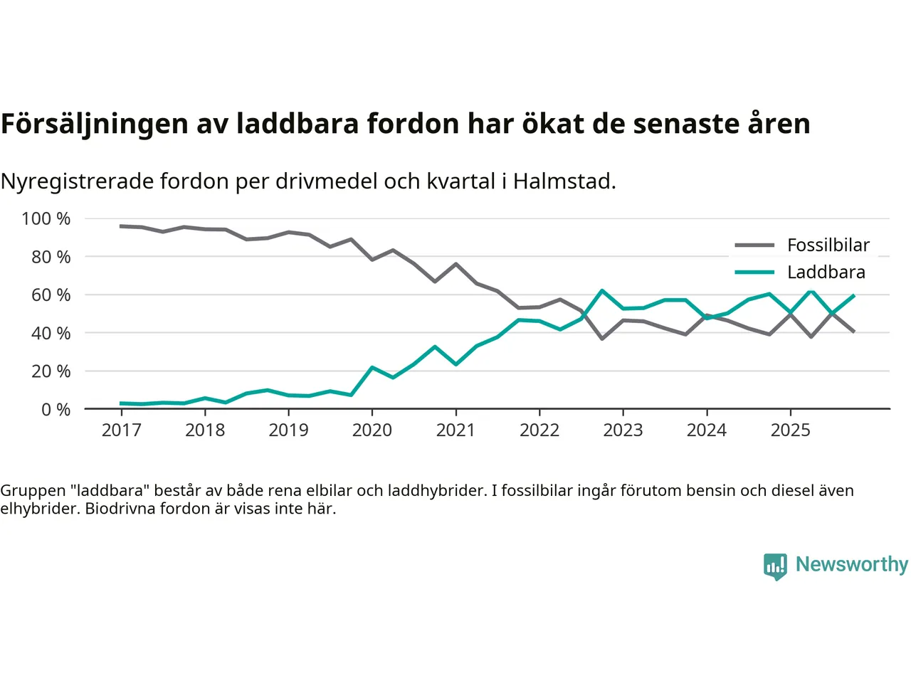 Under fjärde kvartalet 2025 var 59 procent av alla nyregistrerade personbilar i Halmstad laddbara (sammanlagt registrerades 605 nya bilar). Merparten av de laddbara bilarna var rena elbilar (31 procent av alla).