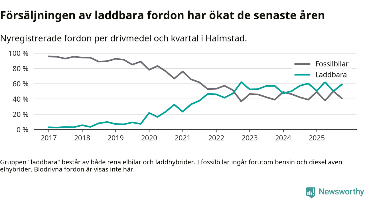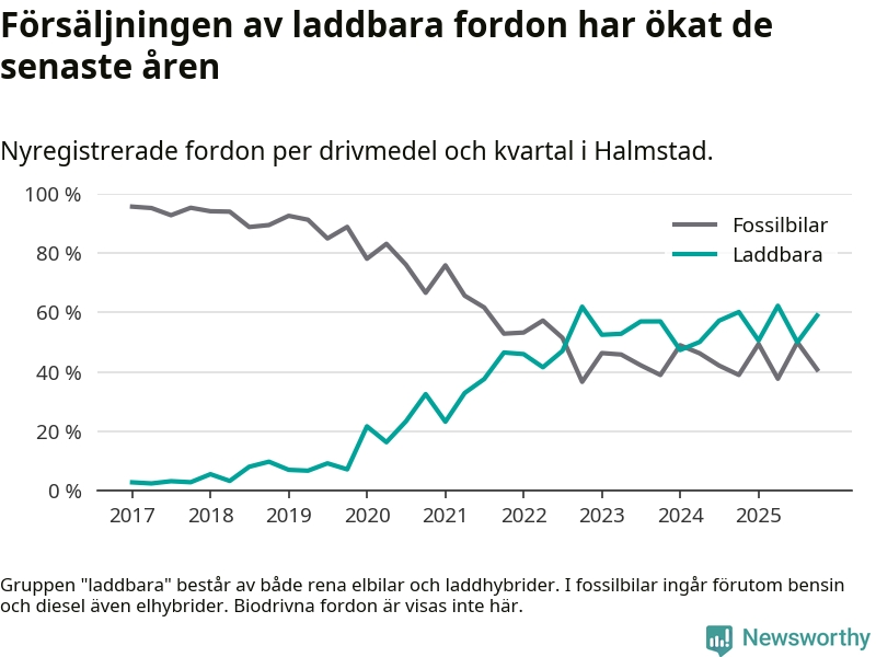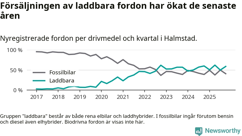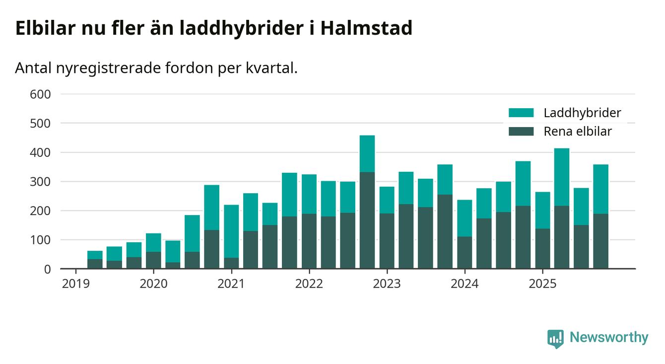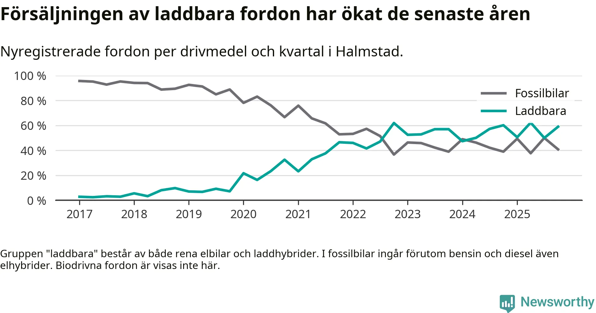 Under fjärde kvartalet 2025 var 59 procent av alla nyregistrerade personbilar i Halmstad laddbara (sammanlagt registrerades 605 nya bilar). Merparten av de laddbara bilarna var rena elbilar (31 procent av alla).