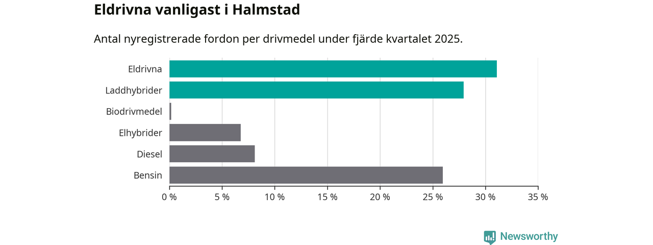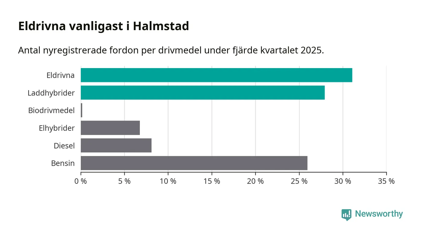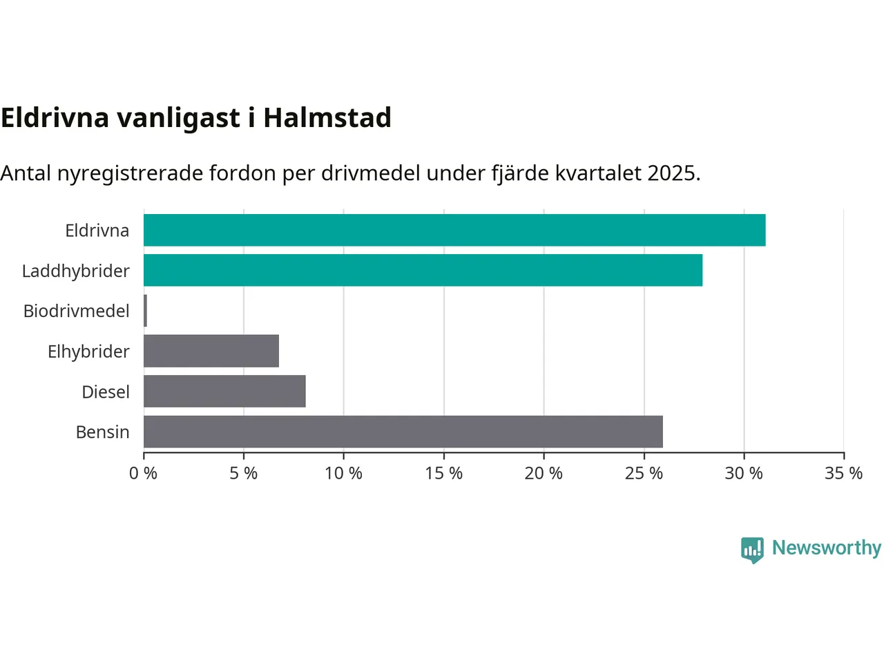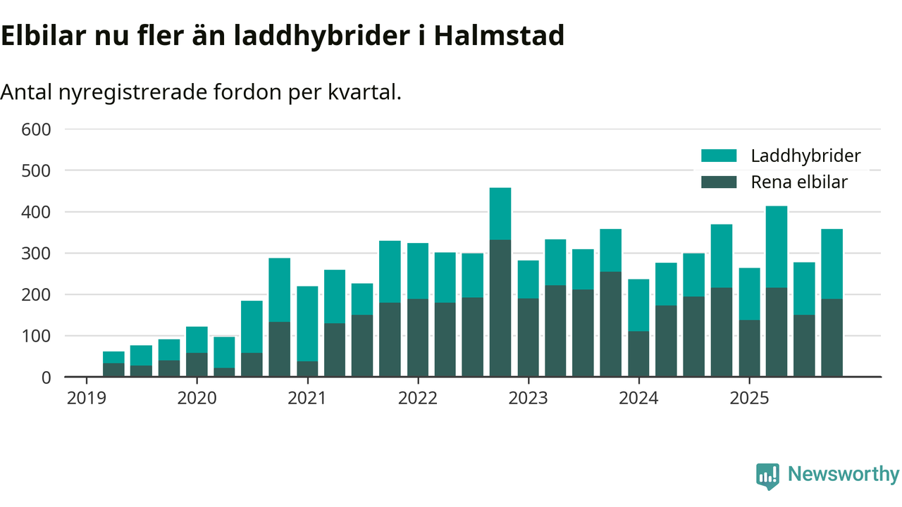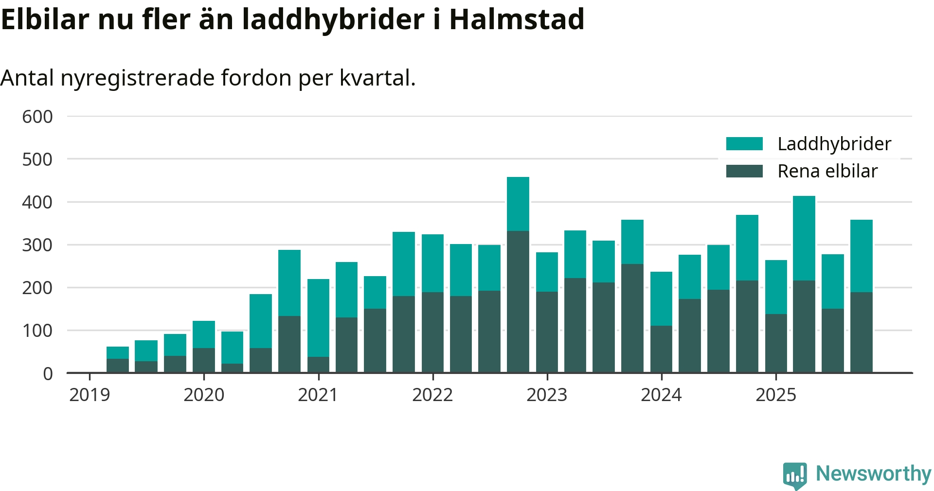 Under fjärde kvartalet 2025 var 59 procent av alla nyregistrerade personbilar i Halmstad laddbara (sammanlagt registrerades 605 nya bilar). Merparten av de laddbara bilarna var rena elbilar (31 procent av alla).