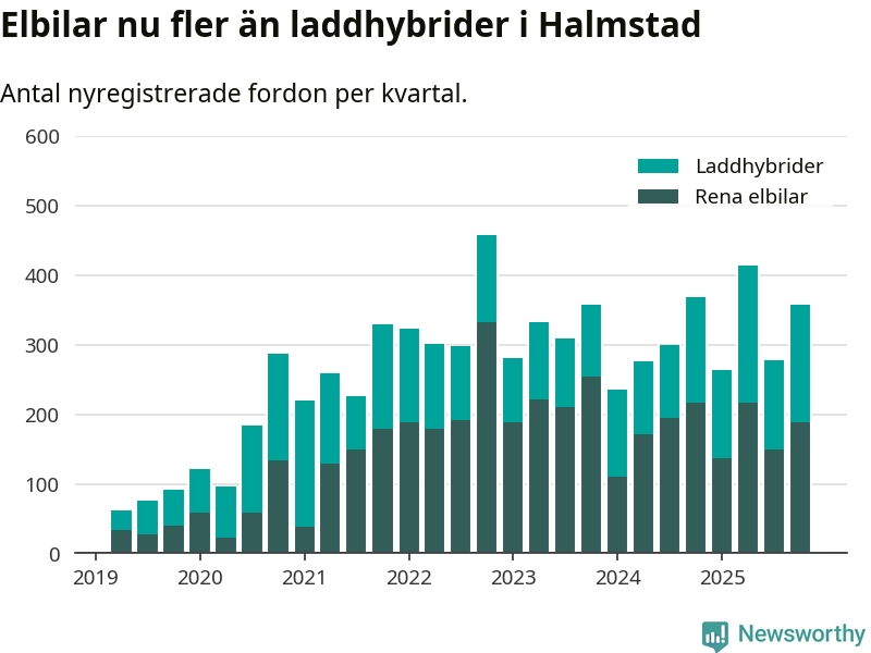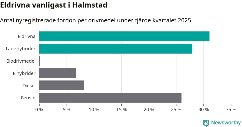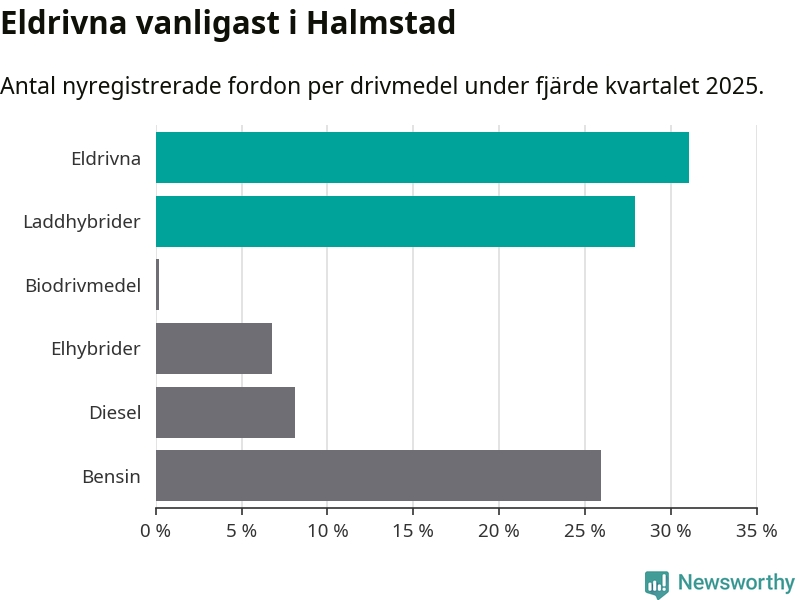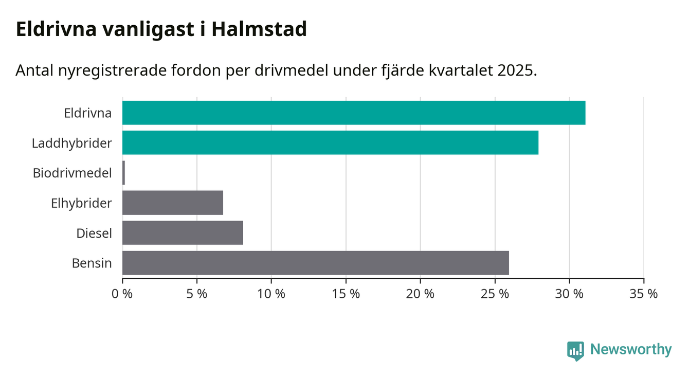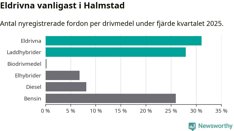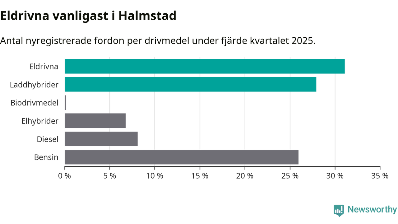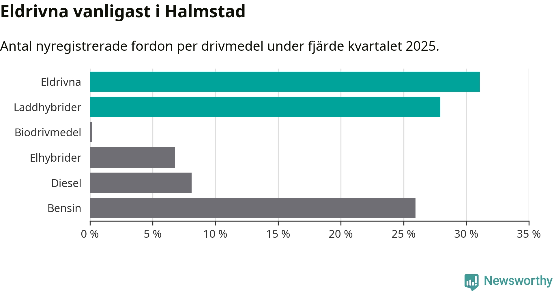 Under fjärde kvartalet 2025 var 59 procent av alla nyregistrerade personbilar i Halmstad laddbara (sammanlagt registrerades 605 nya bilar). Merparten av de laddbara bilarna var rena elbilar (31 procent av alla).