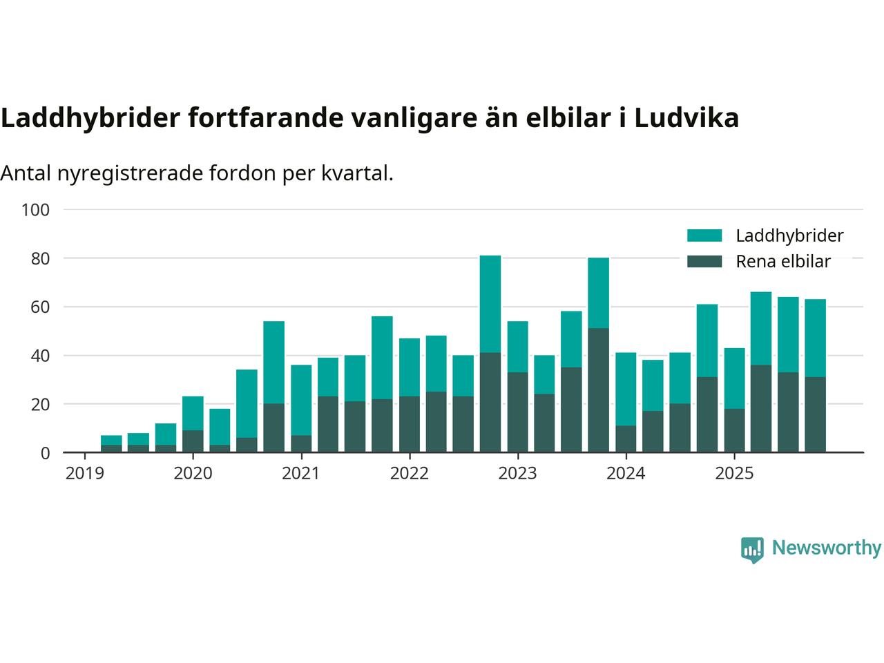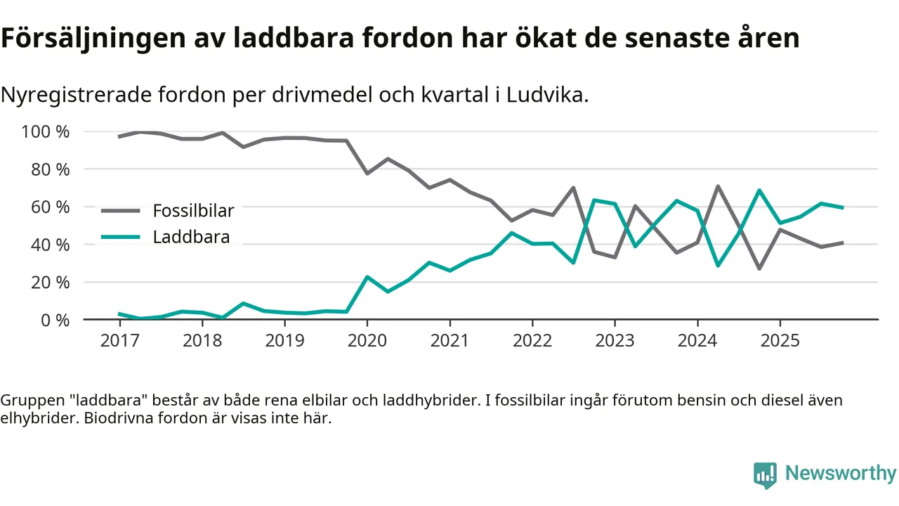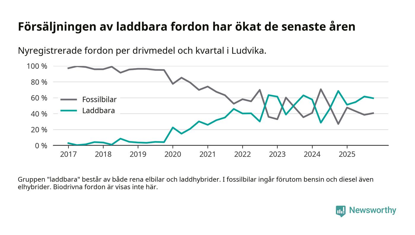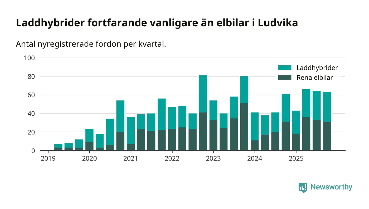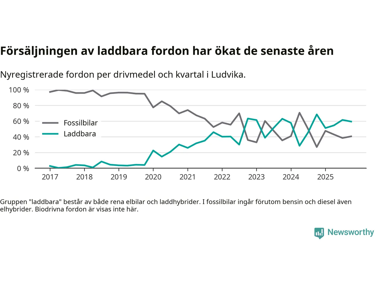 Under fjärde kvartalet 2025 var 59 procent av alla nyregistrerade personbilar i Ludvika laddbara (sammanlagt registrerades 106 nya bilar). Merparten av de laddbara bilarna var så kallade laddhybrider, det vill säga fordon som går att ladda och köra på el, men som även har en förbränningsmotor. 29 procent av alla nya bilar var rena elbilar.