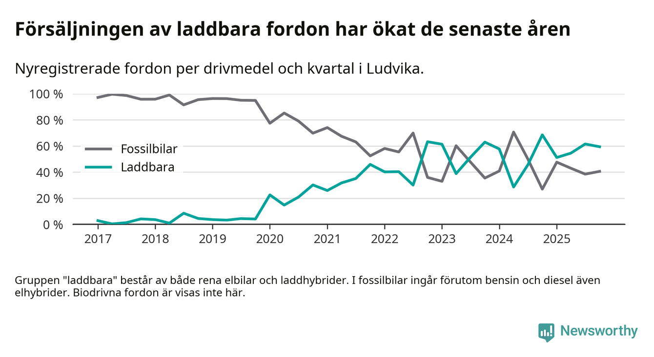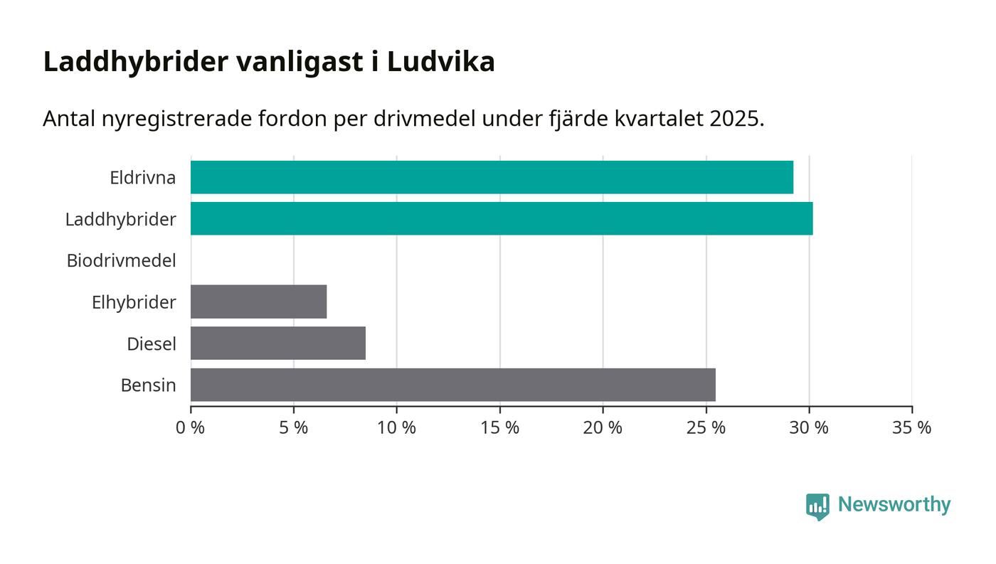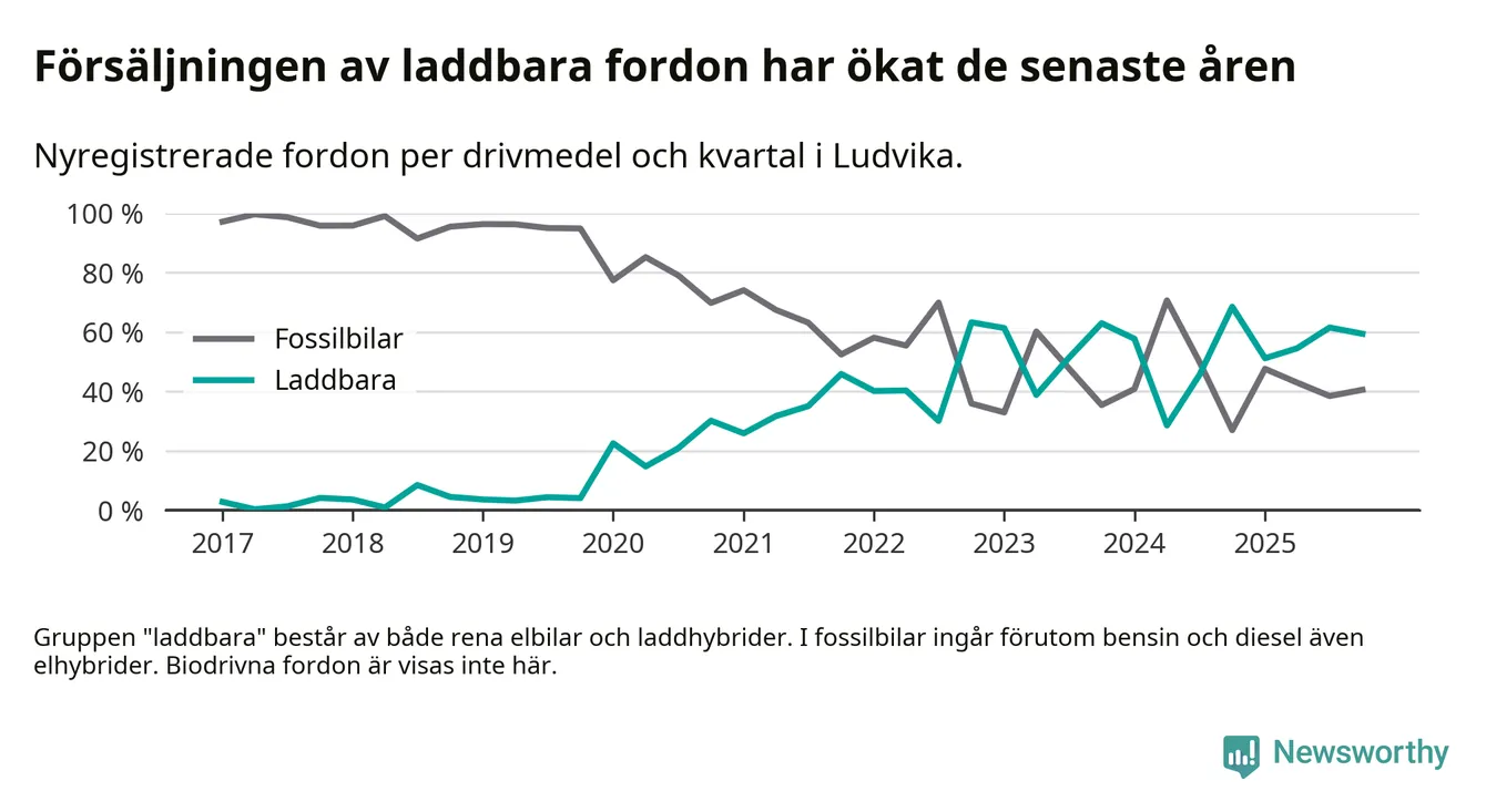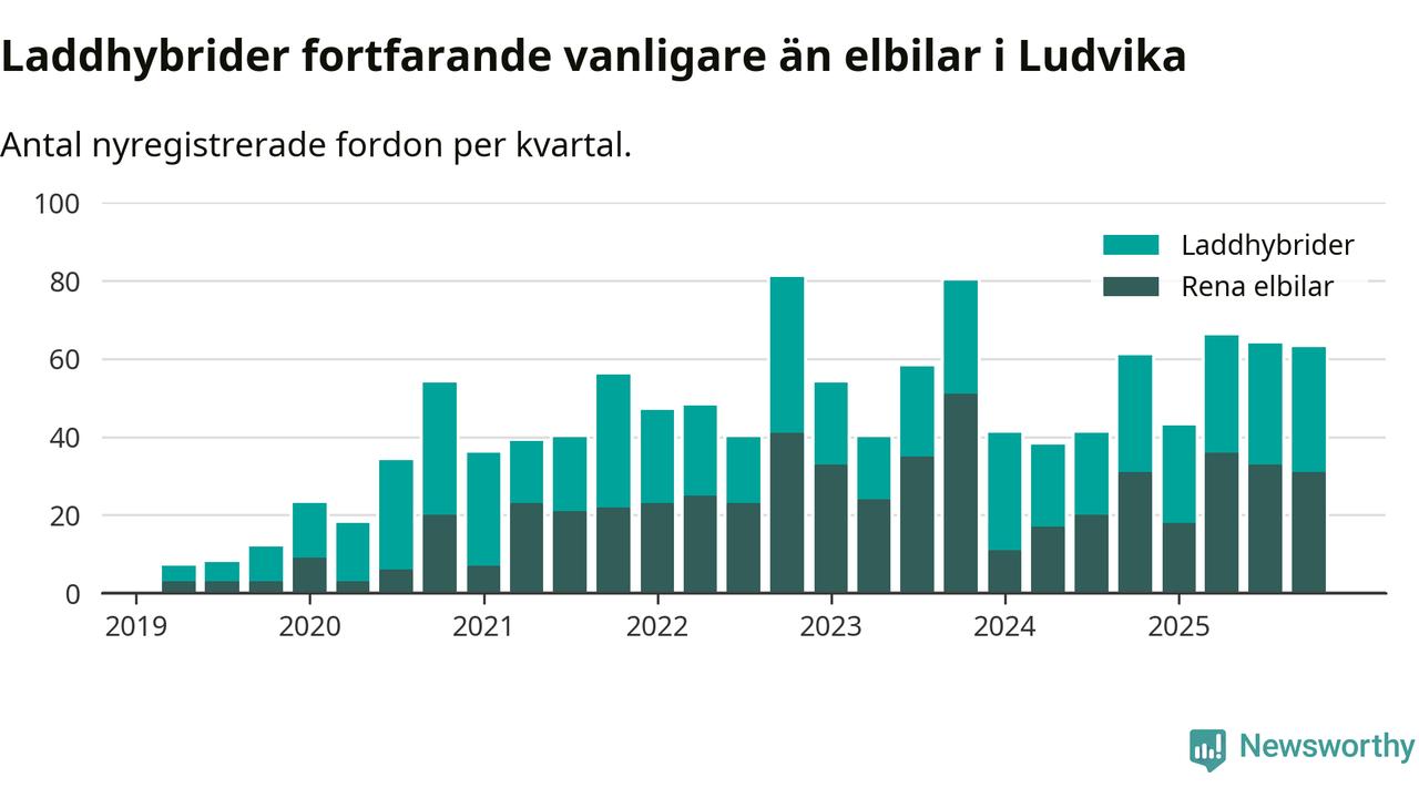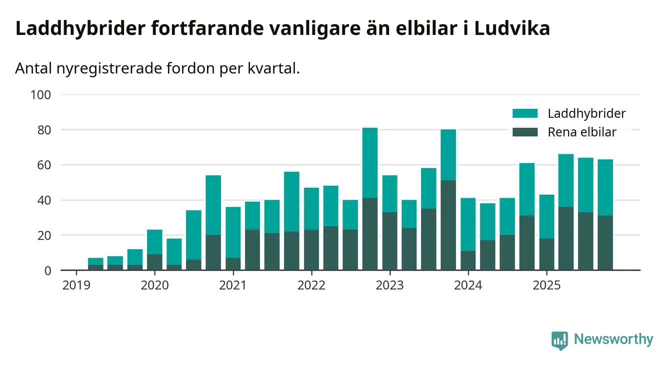Under fjärde kvartalet 2025 var 59 procent av alla nyregistrerade personbilar i Ludvika laddbara (sammanlagt registrerades 106 nya bilar). Merparten av de laddbara bilarna var så kallade laddhybrider, det vill säga fordon som går att ladda och köra på el, men som även har en förbränningsmotor. 29 procent av alla nya bilar var rena elbilar.