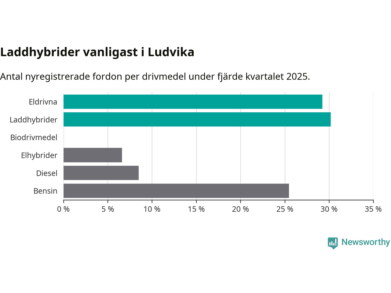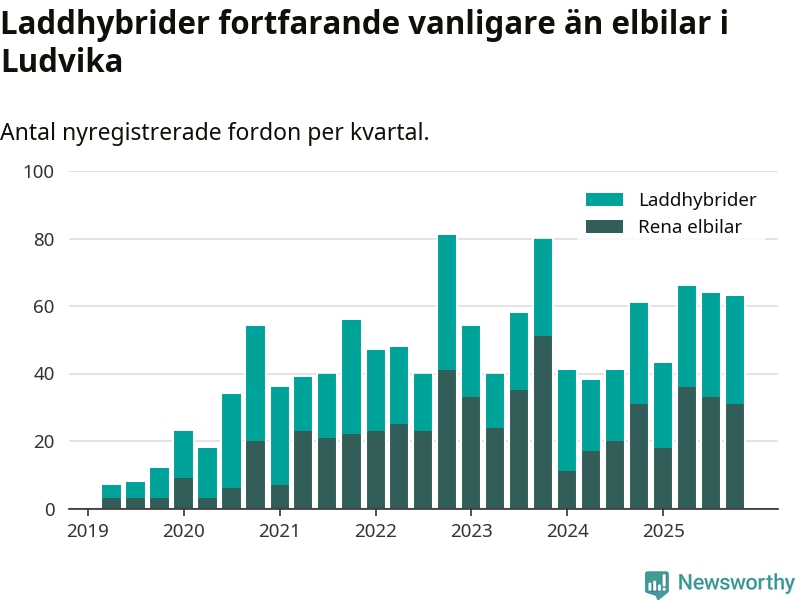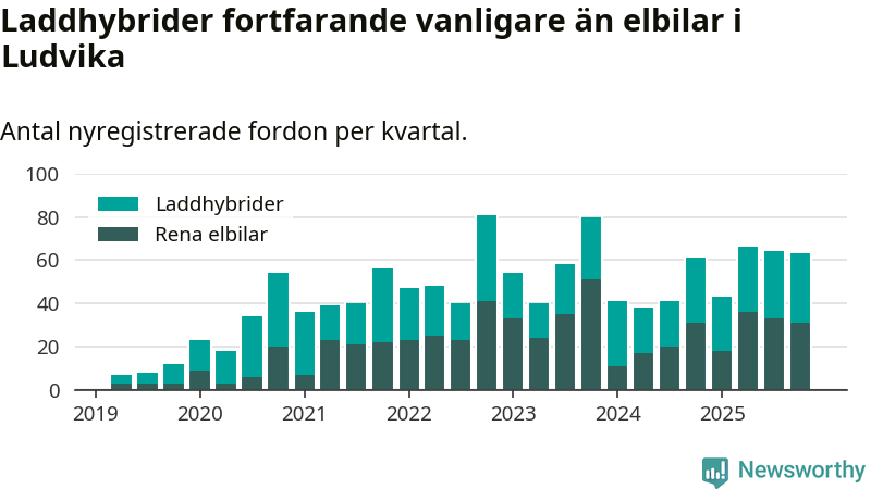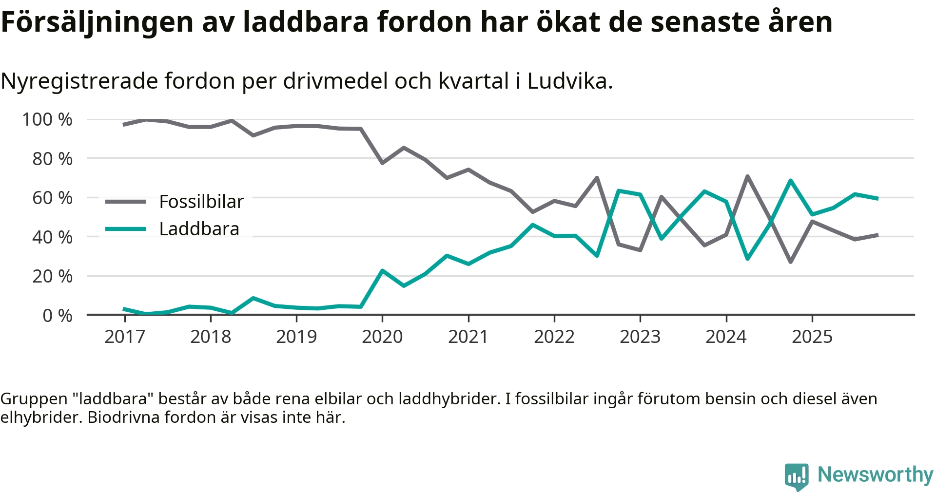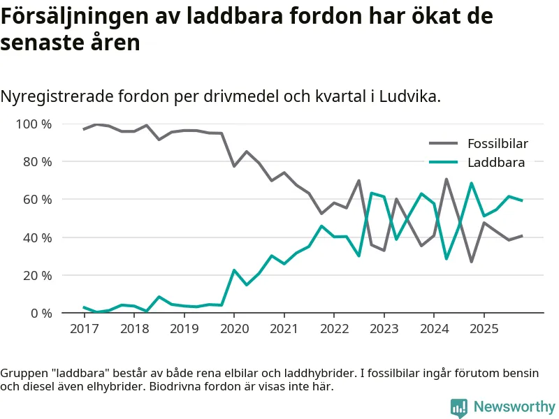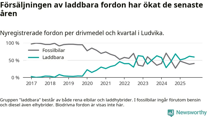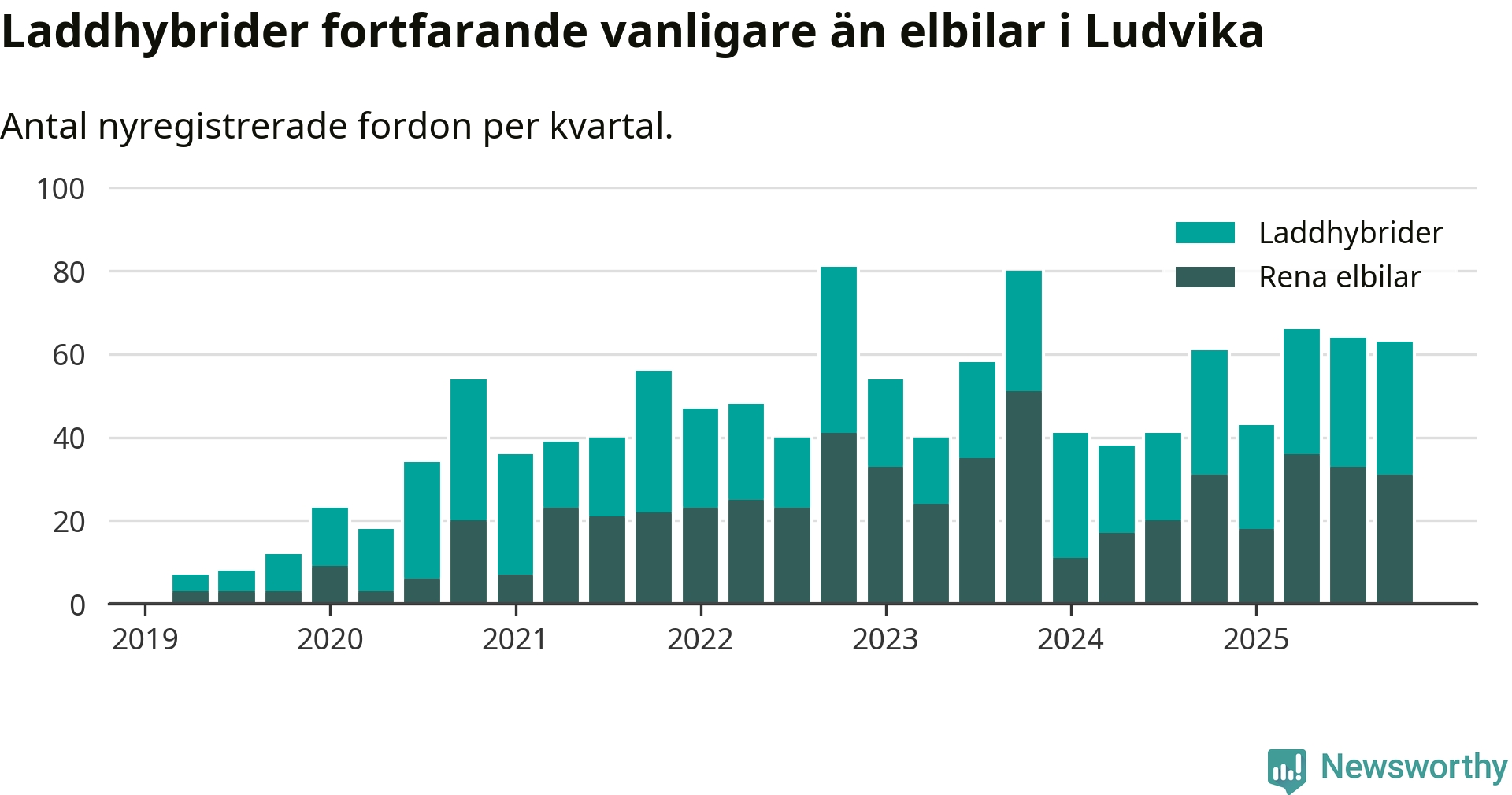 Under fjärde kvartalet 2025 var 59 procent av alla nyregistrerade personbilar i Ludvika laddbara (sammanlagt registrerades 106 nya bilar). Merparten av de laddbara bilarna var så kallade laddhybrider, det vill säga fordon som går att ladda och köra på el, men som även har en förbränningsmotor. 29 procent av alla nya bilar var rena elbilar.