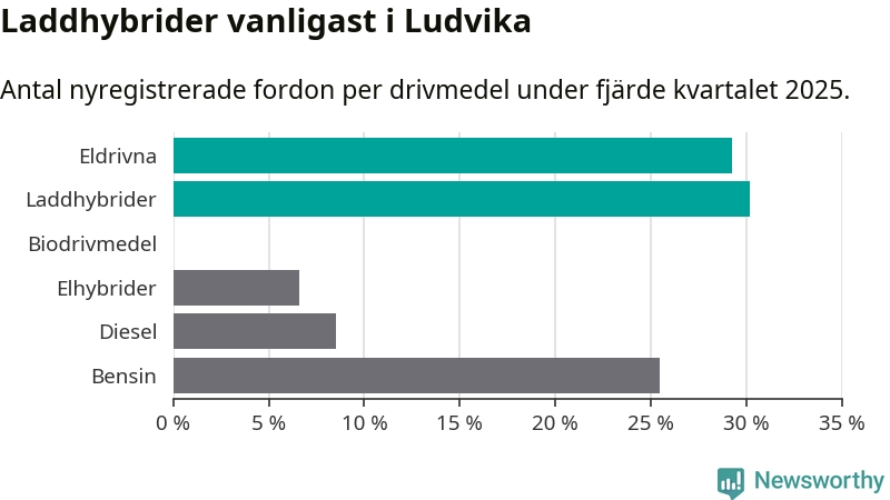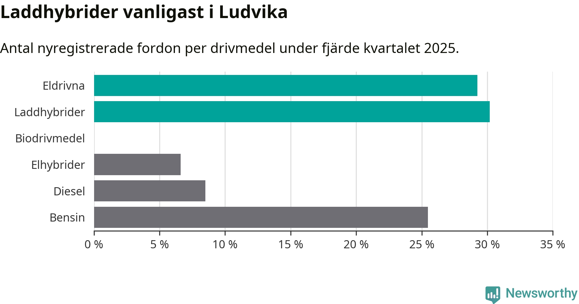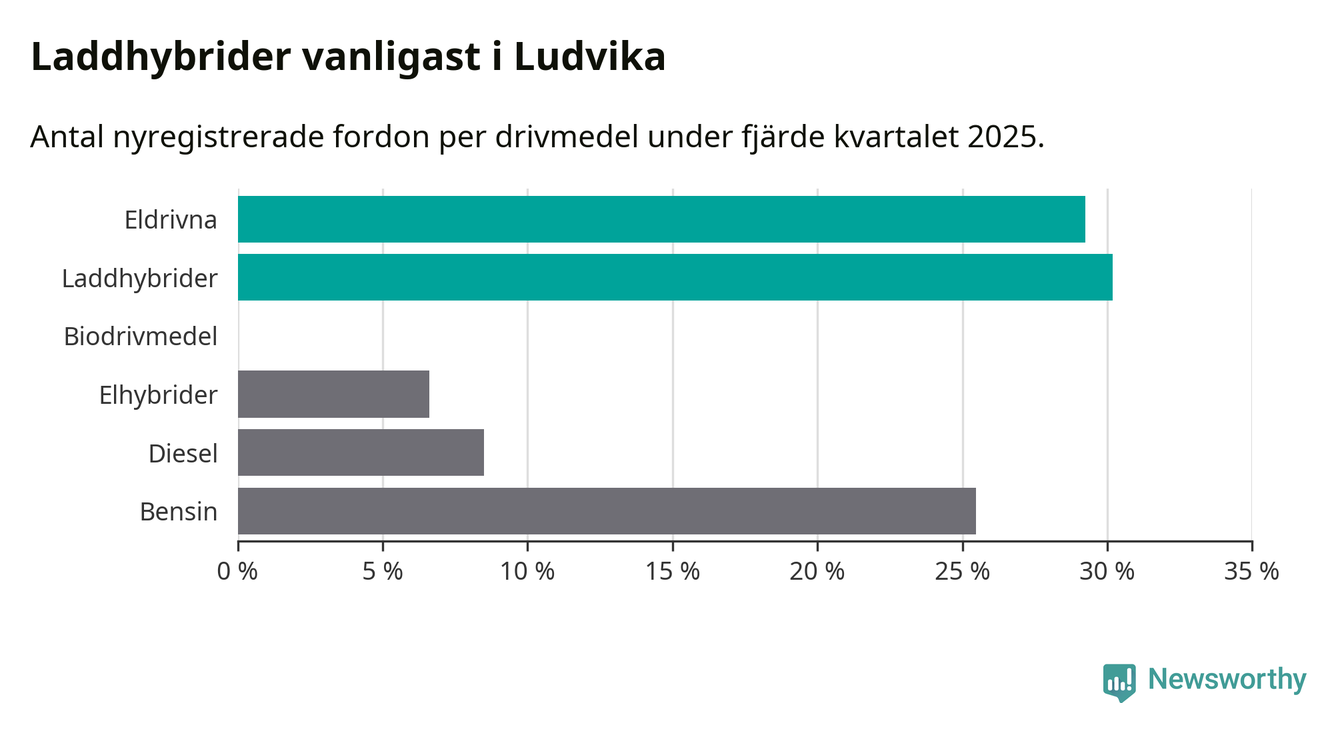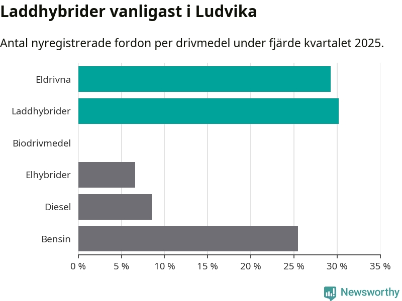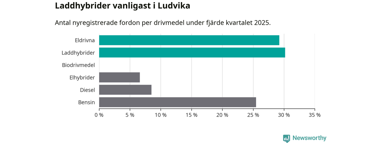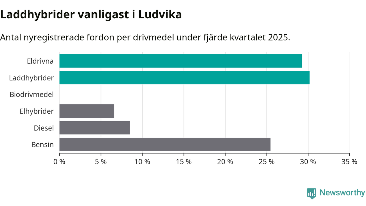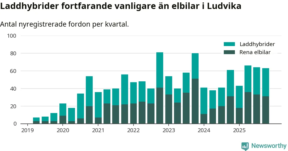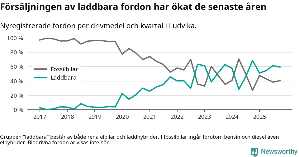 Under fjärde kvartalet 2025 var 59 procent av alla nyregistrerade personbilar i Ludvika laddbara (sammanlagt registrerades 106 nya bilar). Merparten av de laddbara bilarna var så kallade laddhybrider, det vill säga fordon som går att ladda och köra på el, men som även har en förbränningsmotor. 29 procent av alla nya bilar var rena elbilar.