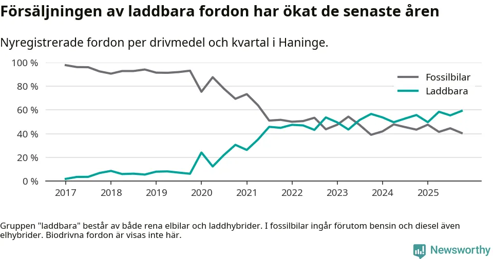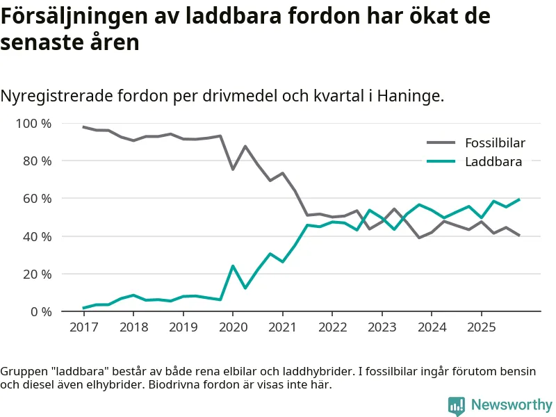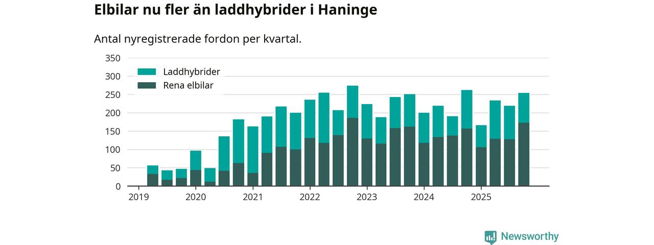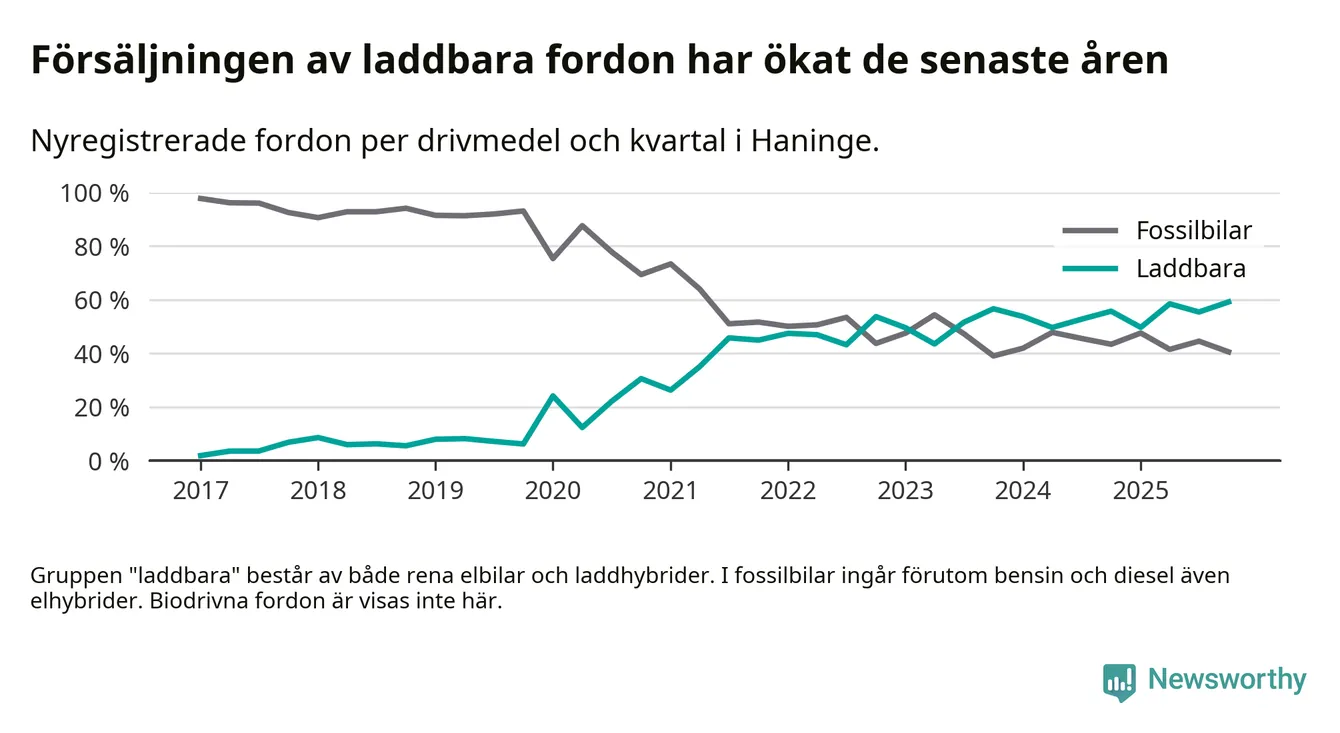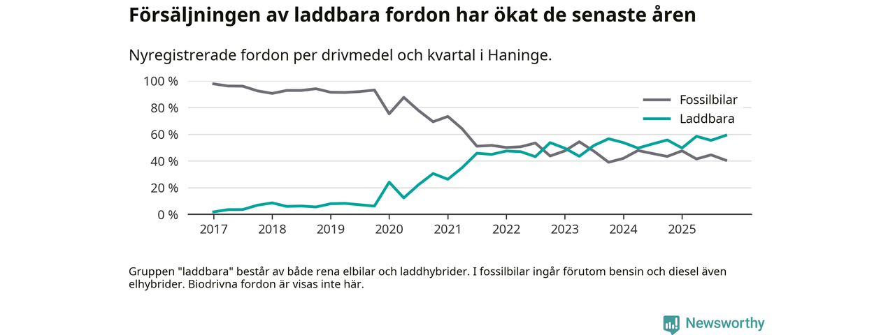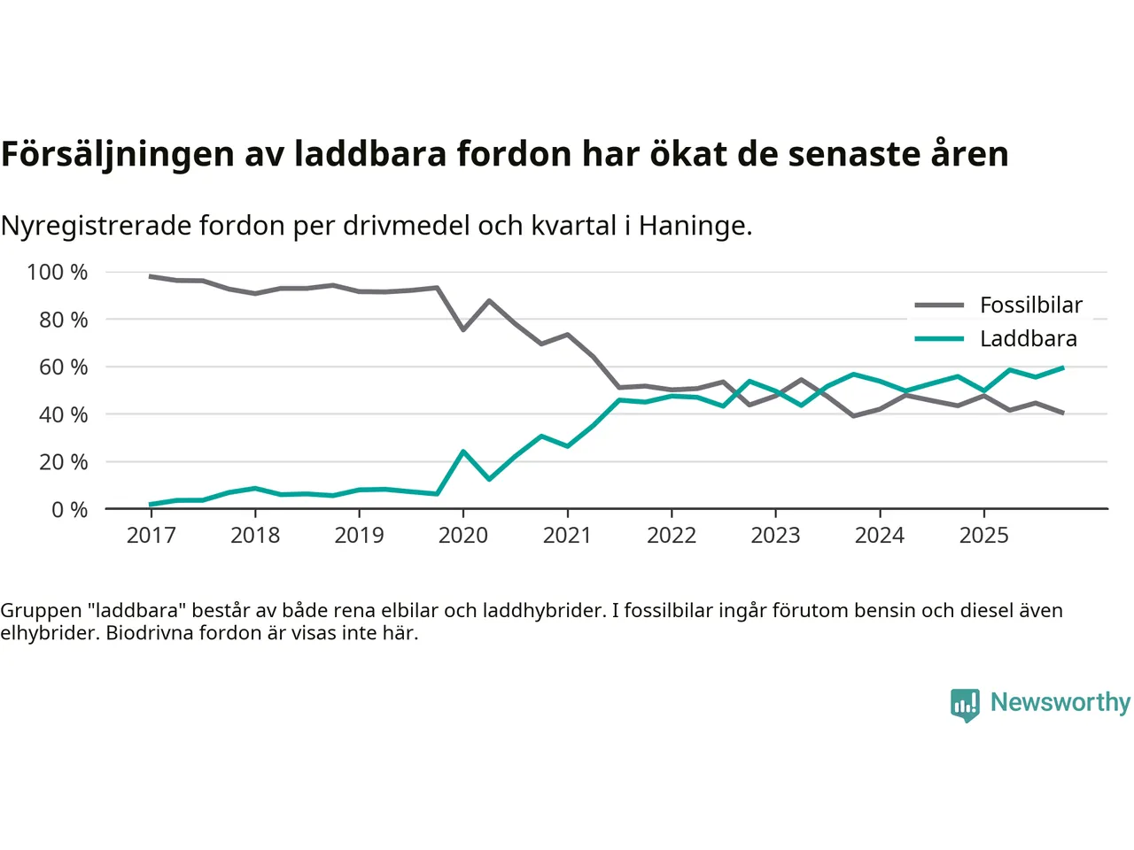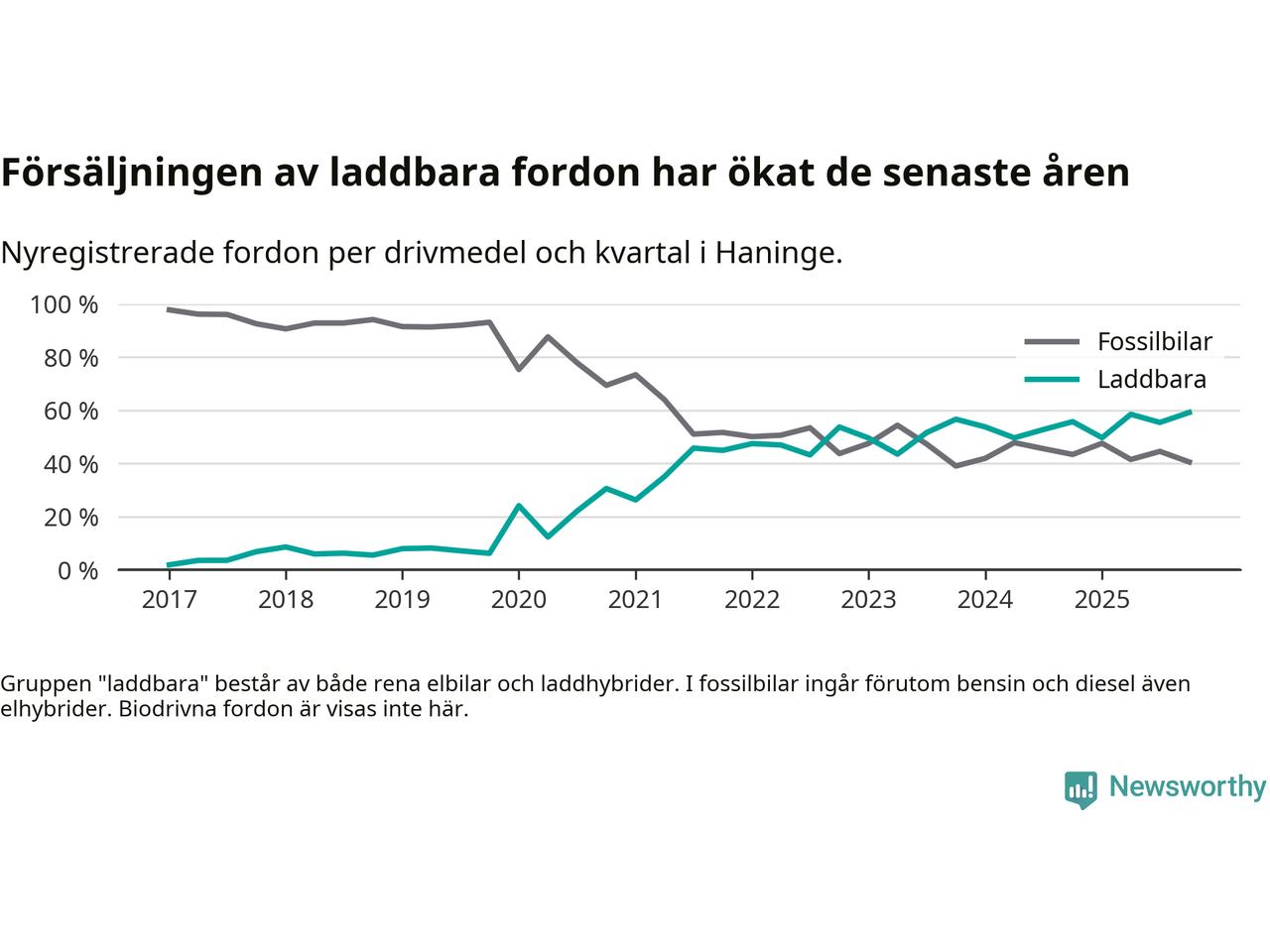 Under fjärde kvartalet 2025 var 59 procent av alla nyregistrerade personbilar i Haninge laddbara (sammanlagt registrerades 429 nya bilar). Merparten av de laddbara bilarna var rena elbilar (40 procent av alla).