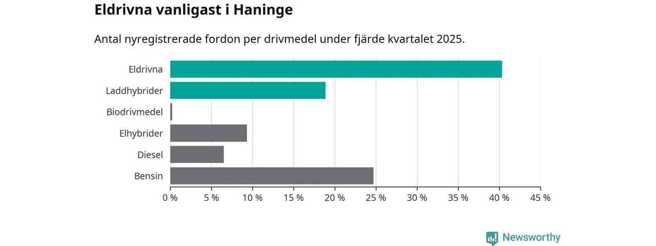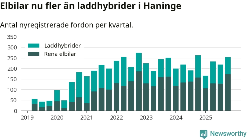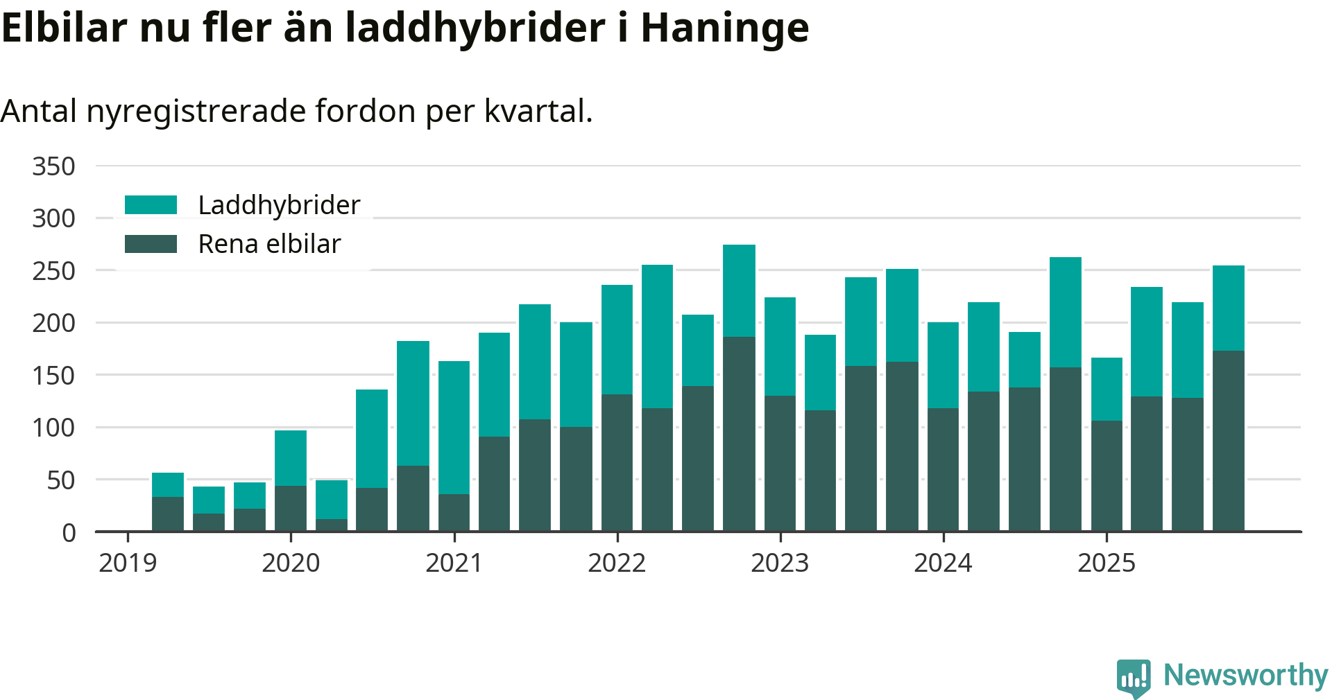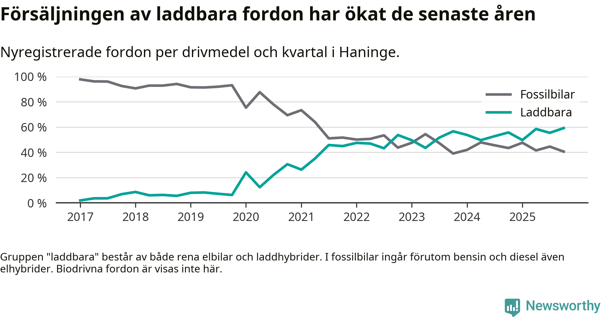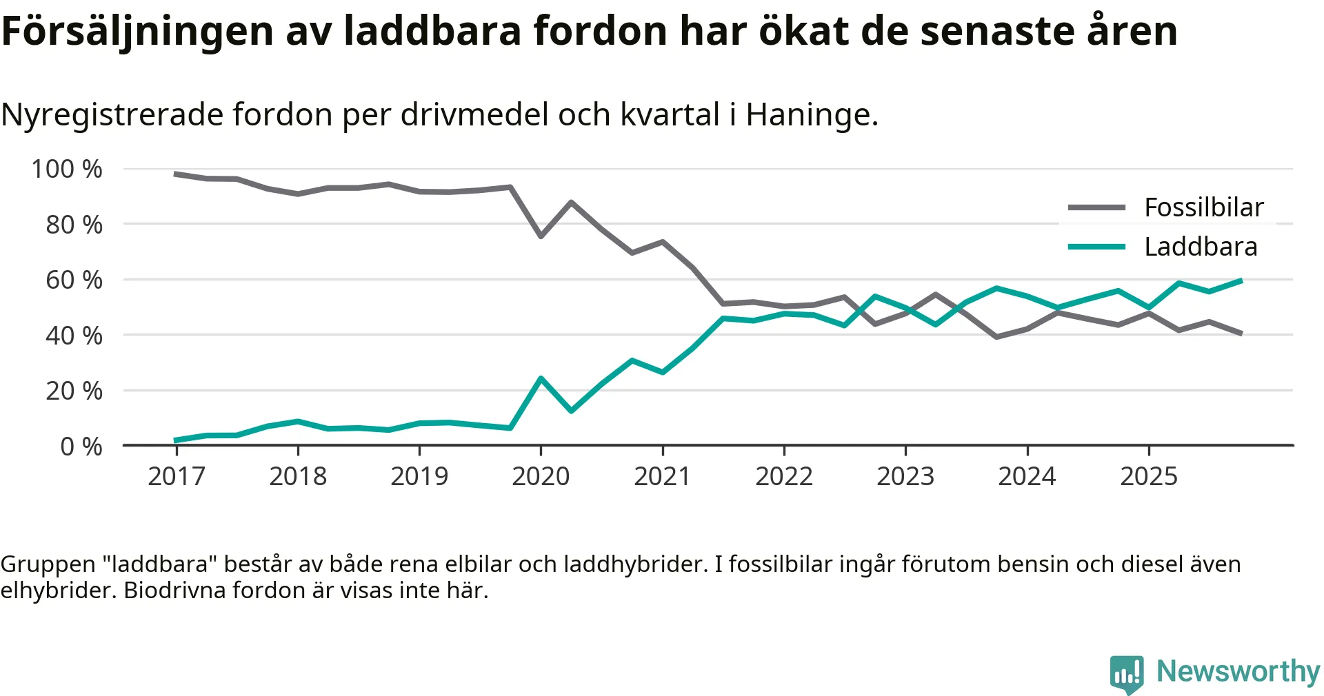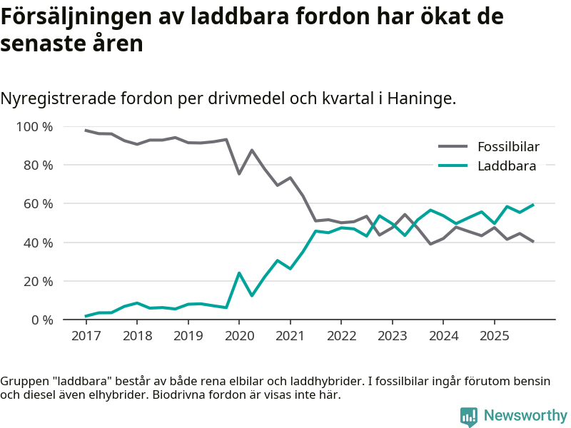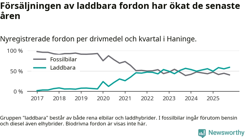 Under fjärde kvartalet 2025 var 59 procent av alla nyregistrerade personbilar i Haninge laddbara (sammanlagt registrerades 429 nya bilar). Merparten av de laddbara bilarna var rena elbilar (40 procent av alla).