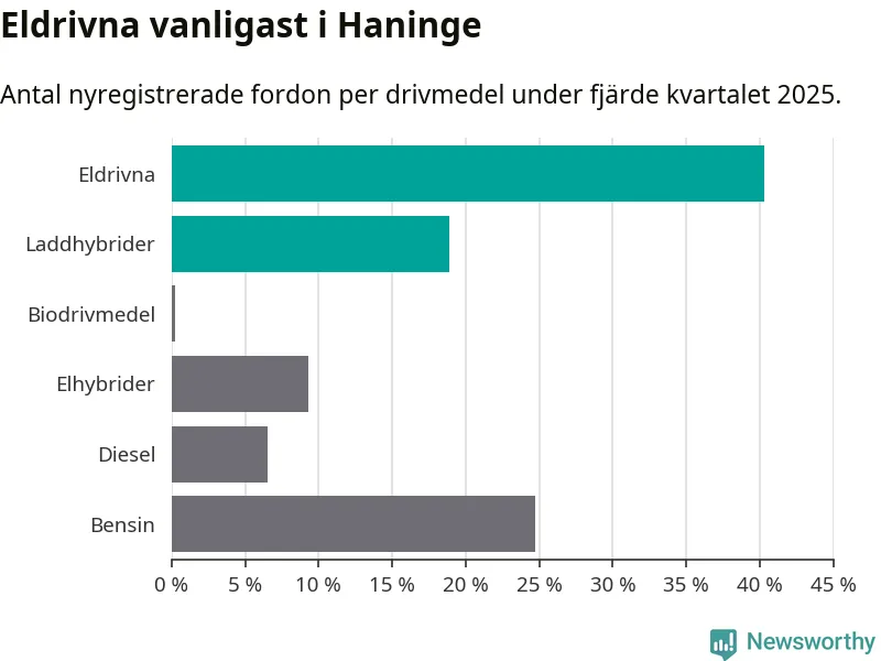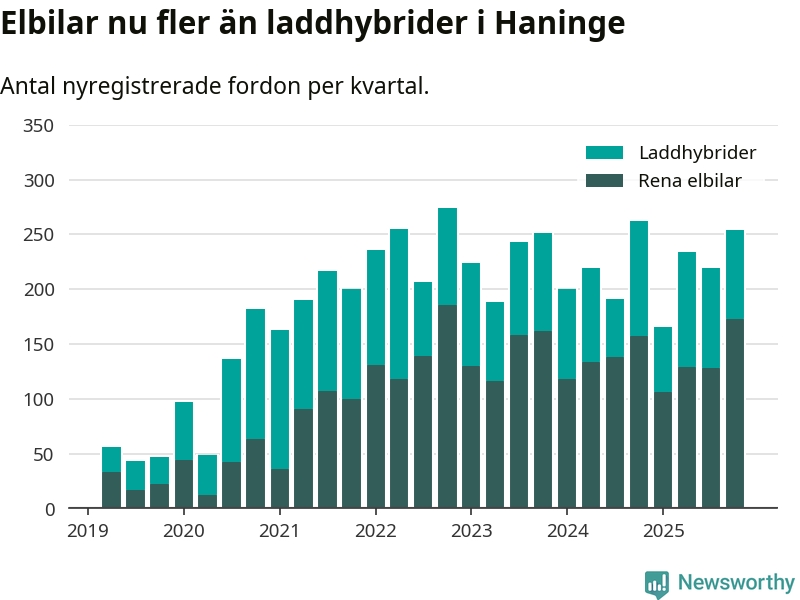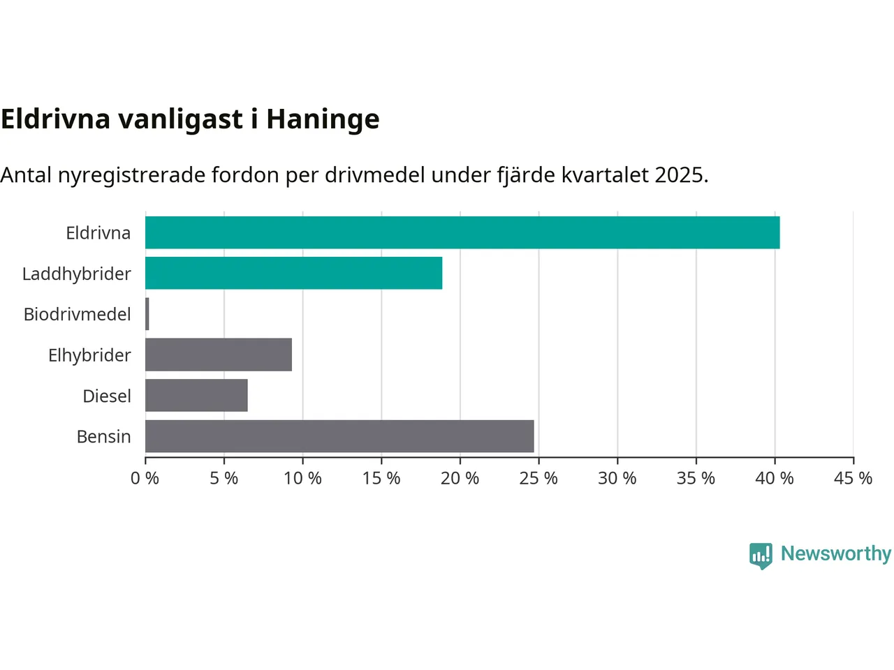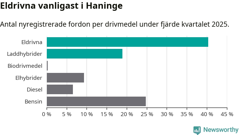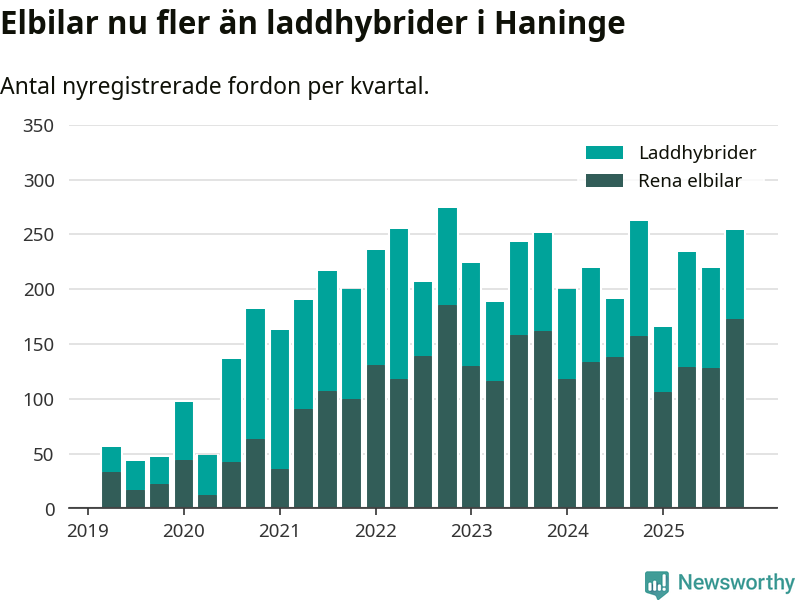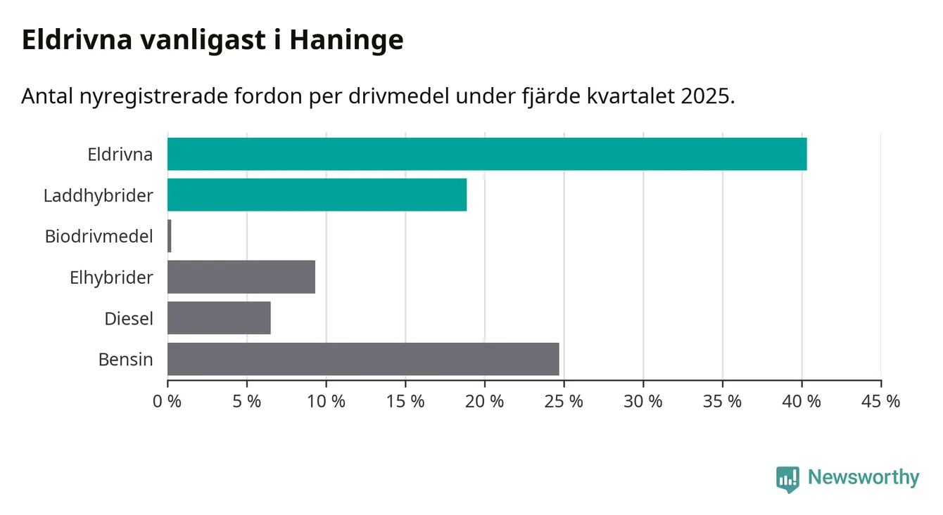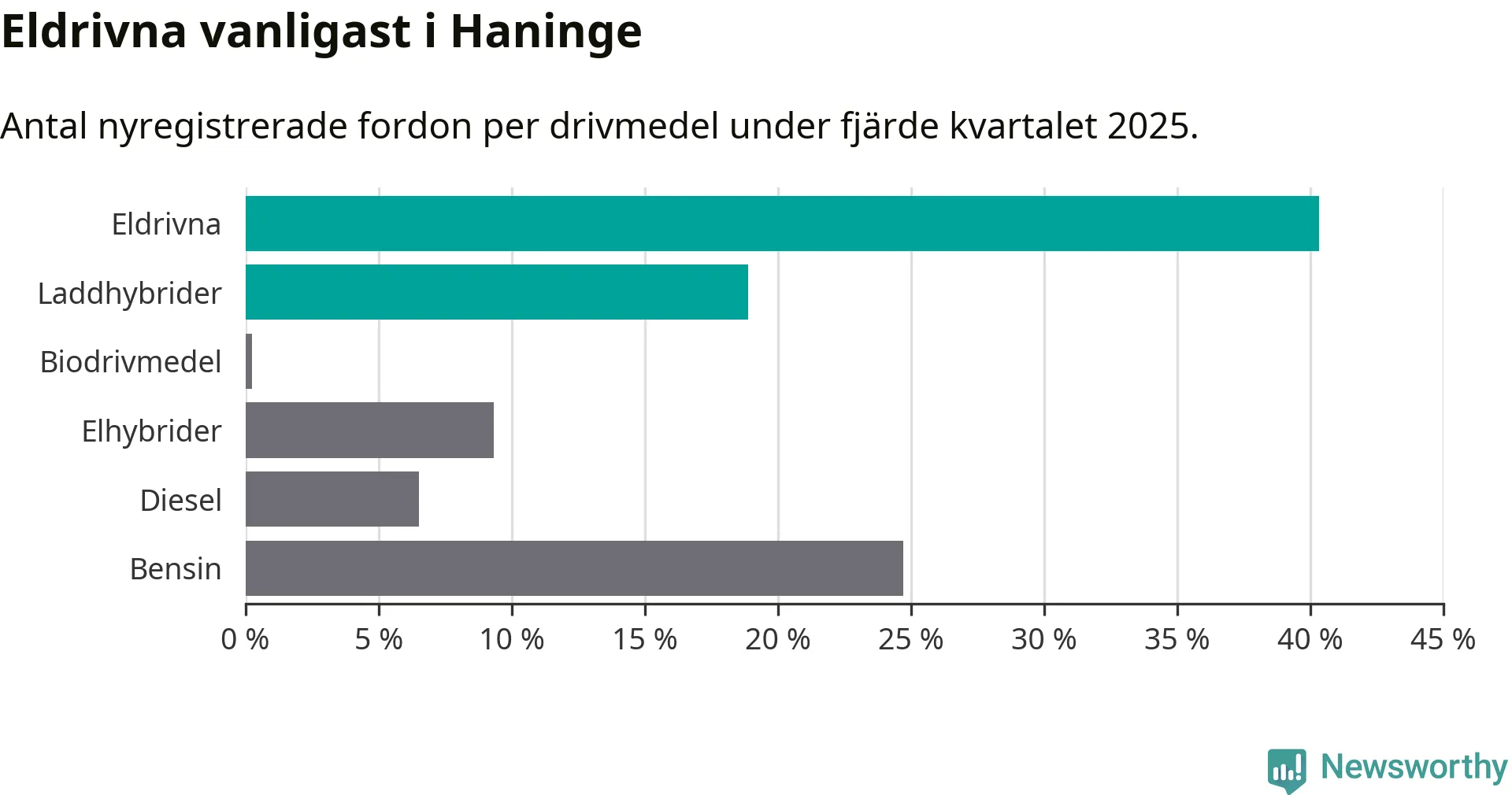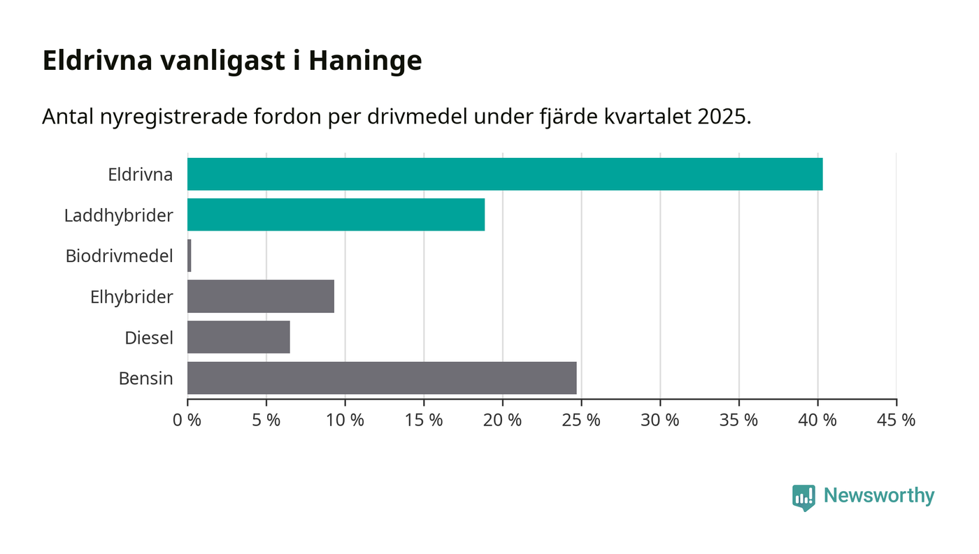 Under fjärde kvartalet 2025 var 59 procent av alla nyregistrerade personbilar i Haninge laddbara (sammanlagt registrerades 429 nya bilar). Merparten av de laddbara bilarna var rena elbilar (40 procent av alla).