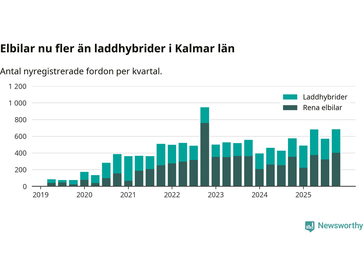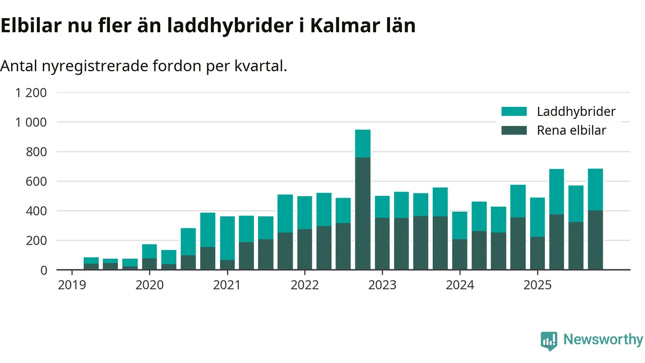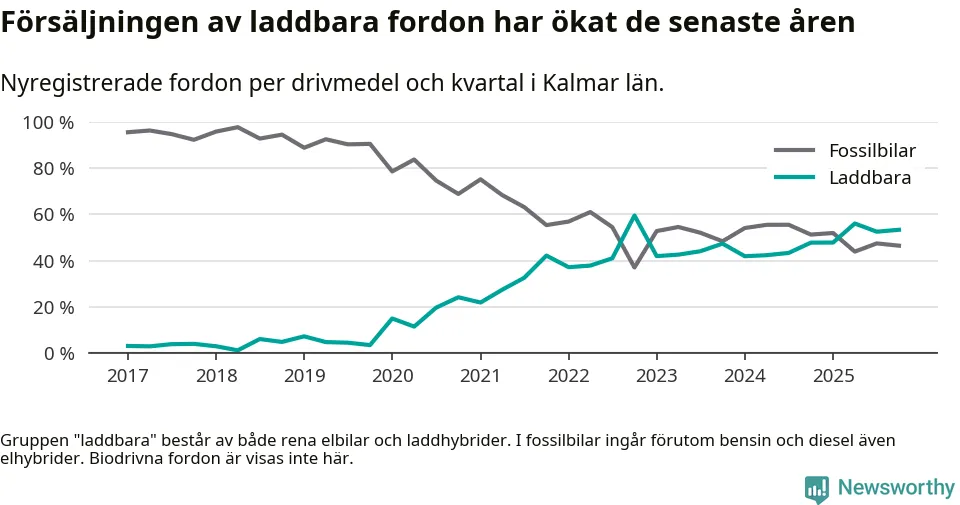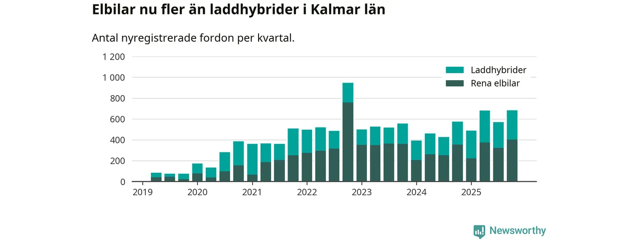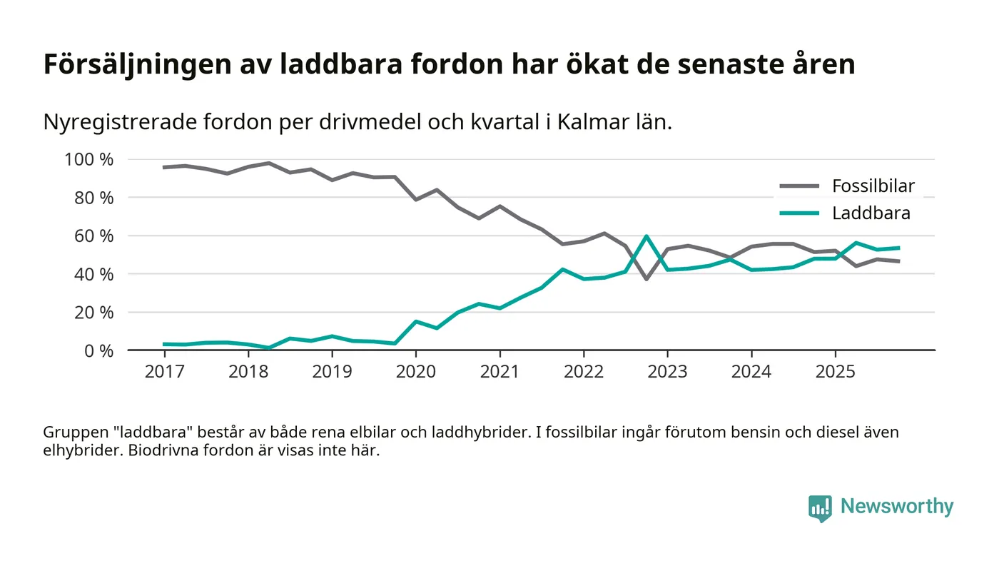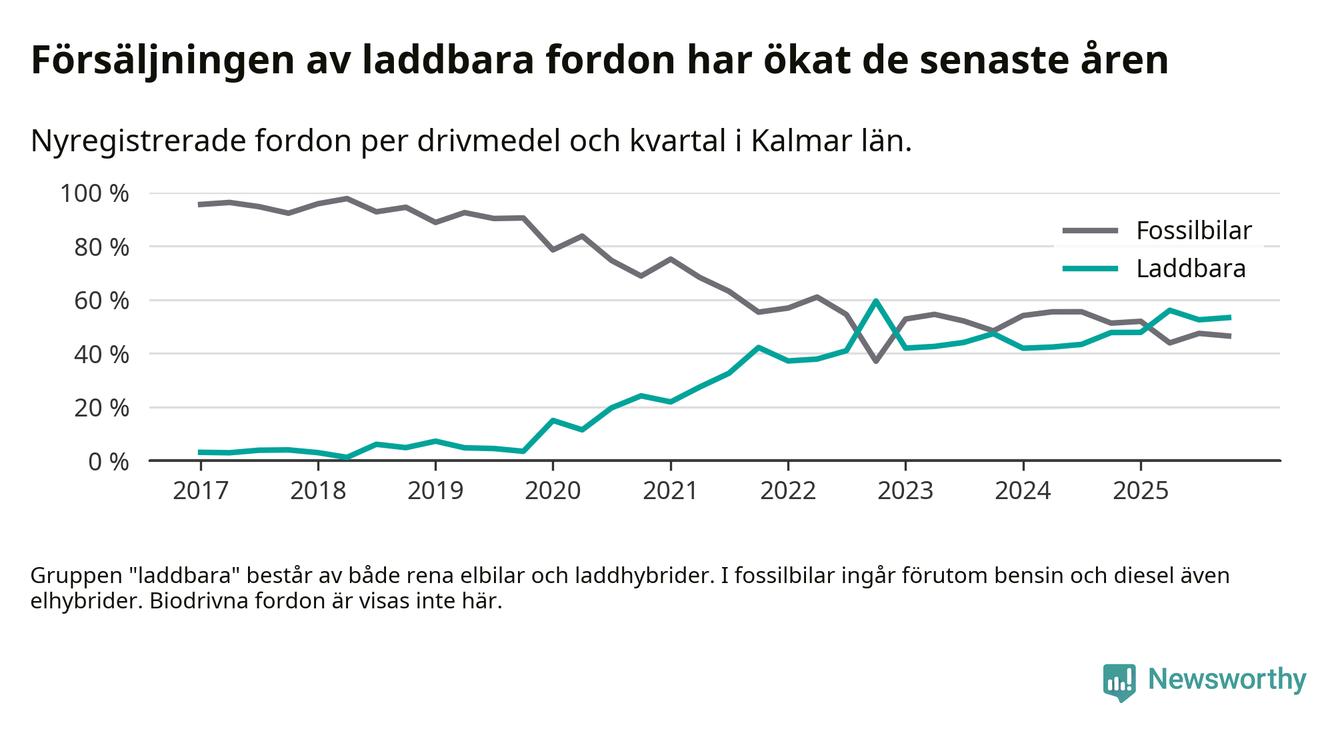 Under fjärde kvartalet 2025 var 53 procent av alla nyregistrerade personbilar i Kalmar län laddbara (sammanlagt registrerades 1 280 nya bilar). Merparten av de laddbara bilarna var rena elbilar (31 procent av alla).