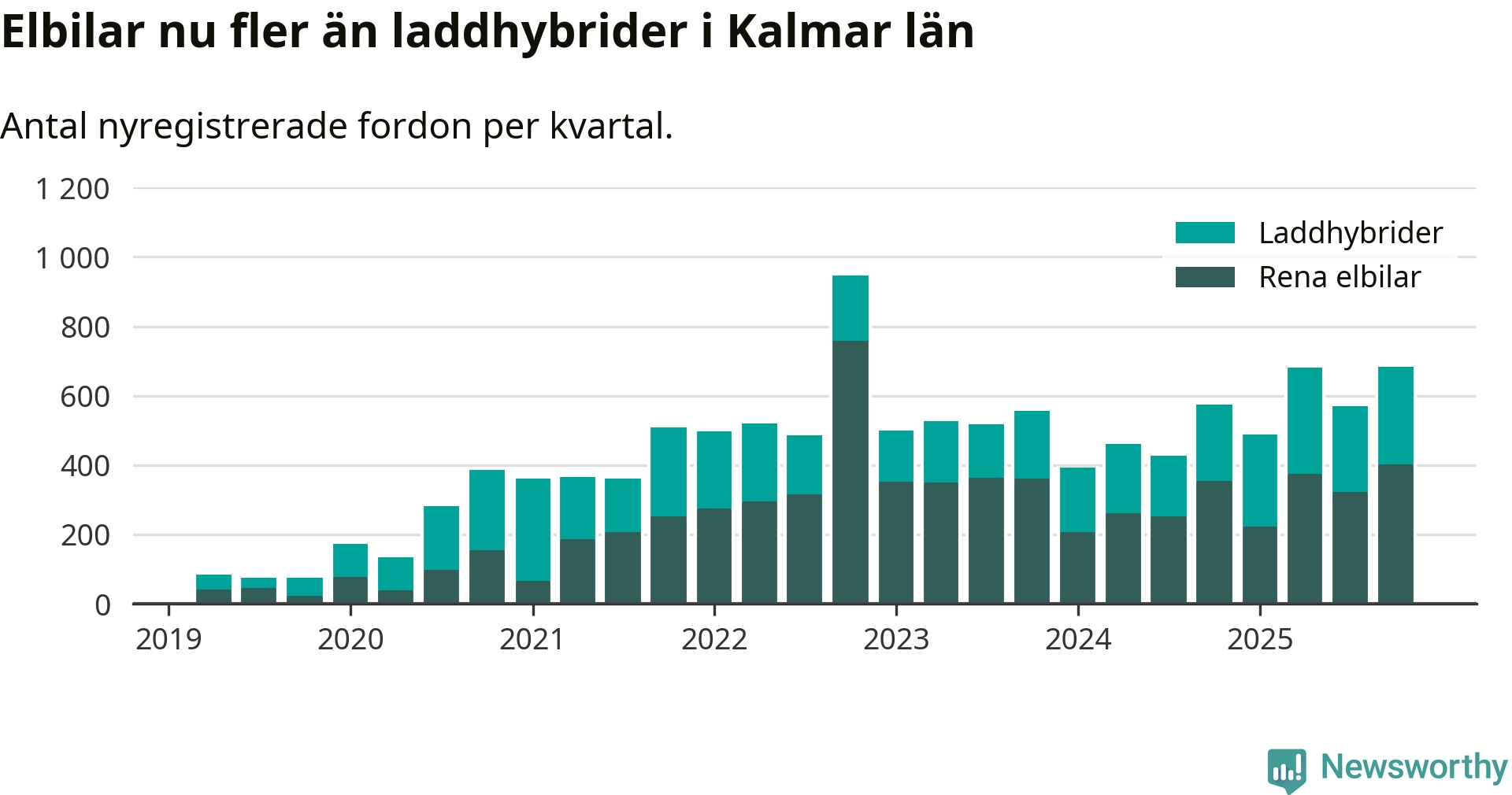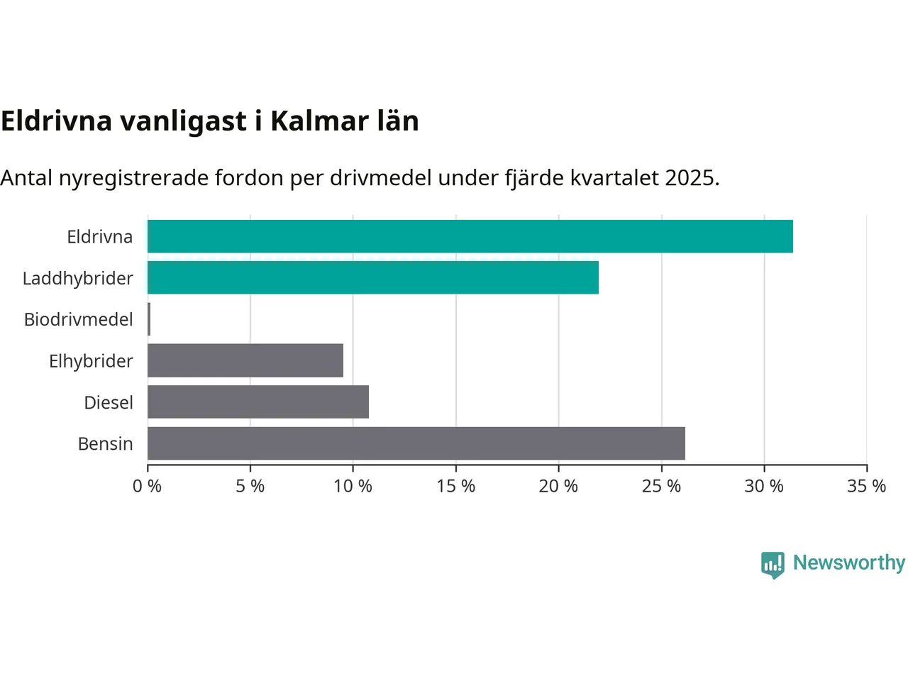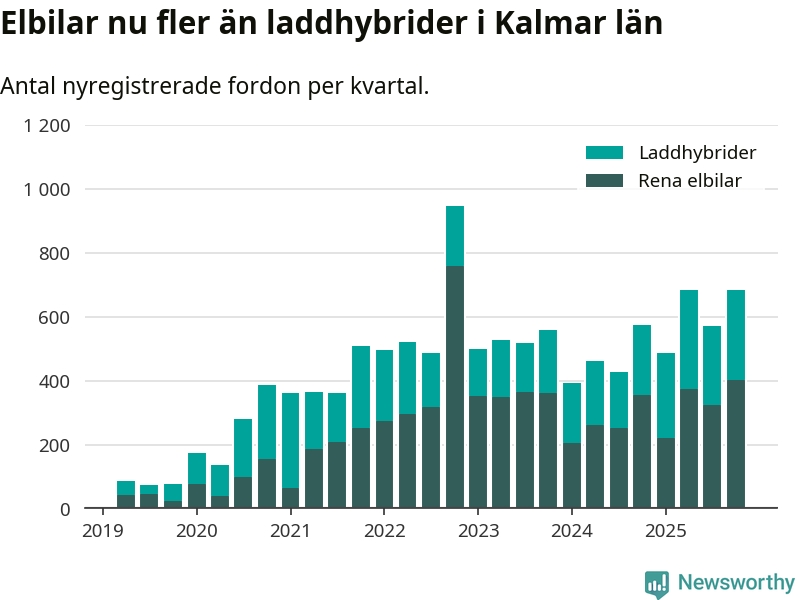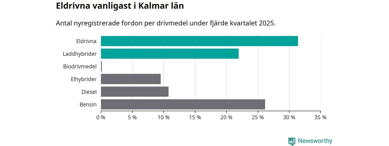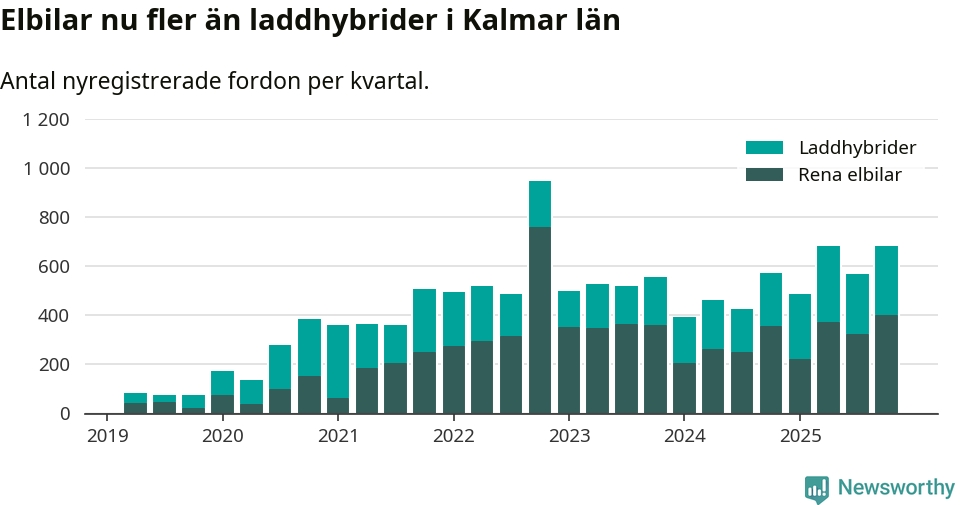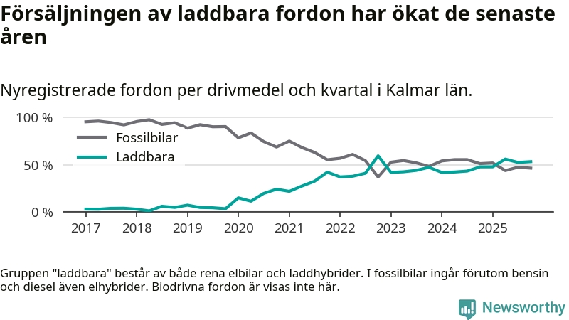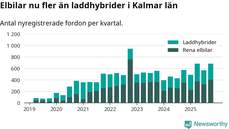 Under fjärde kvartalet 2025 var 53 procent av alla nyregistrerade personbilar i Kalmar län laddbara (sammanlagt registrerades 1 280 nya bilar). Merparten av de laddbara bilarna var rena elbilar (31 procent av alla).