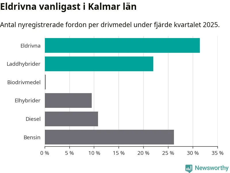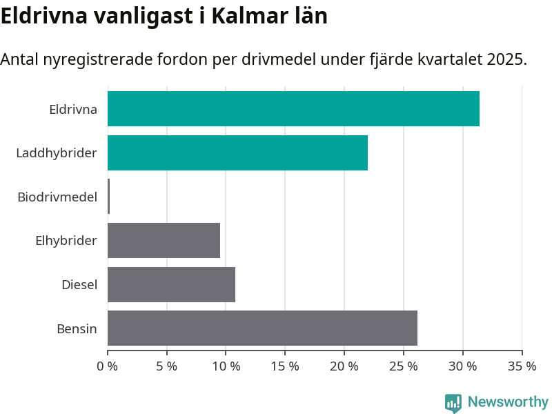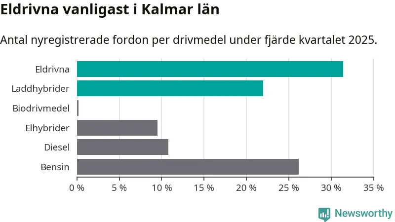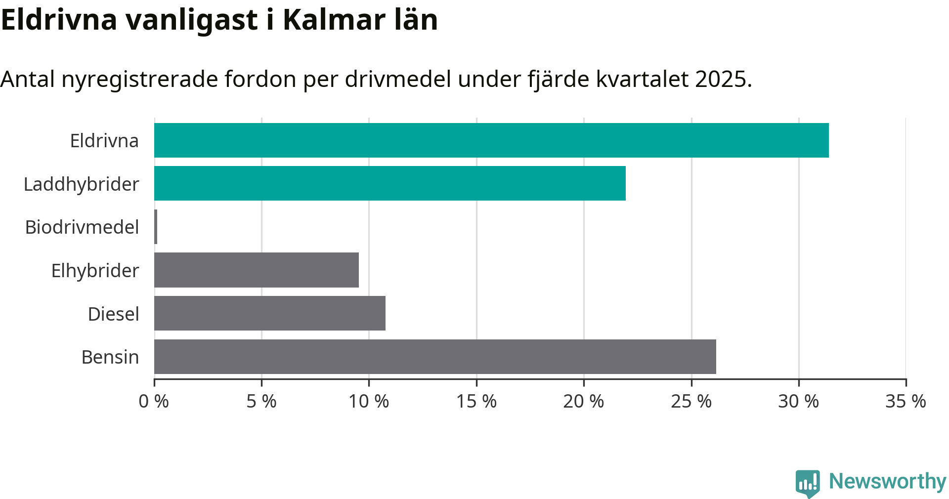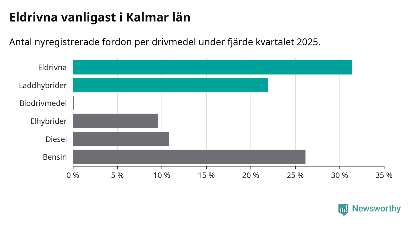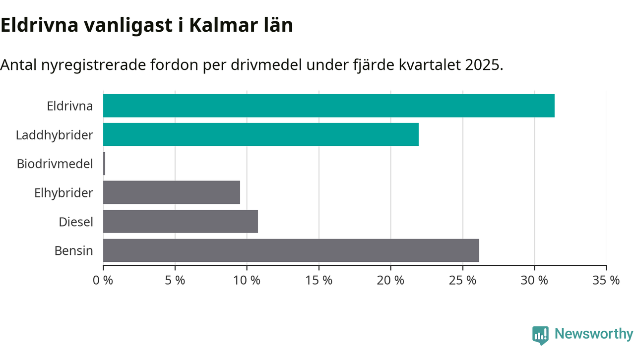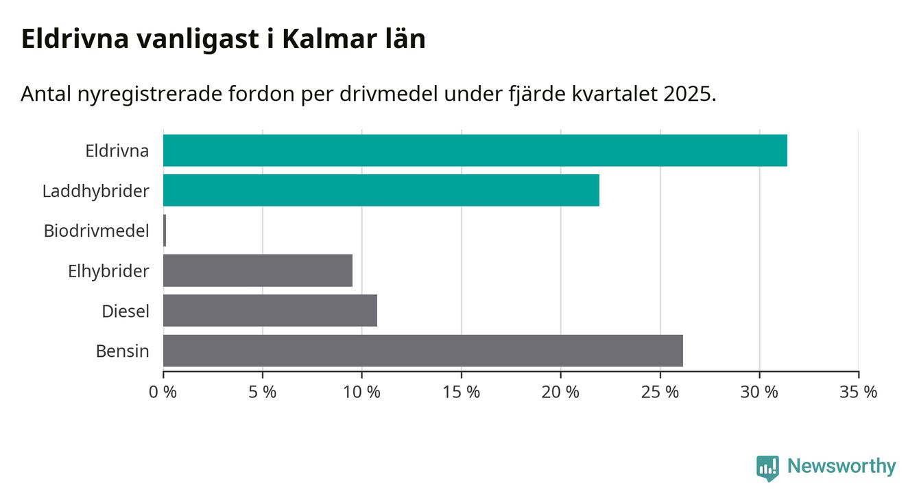 Under fjärde kvartalet 2025 var 53 procent av alla nyregistrerade personbilar i Kalmar län laddbara (sammanlagt registrerades 1 280 nya bilar). Merparten av de laddbara bilarna var rena elbilar (31 procent av alla).