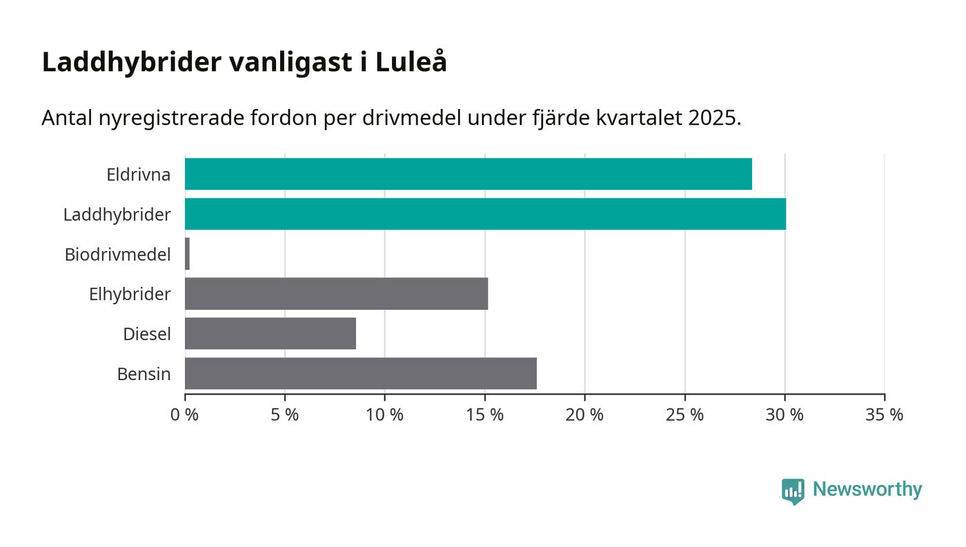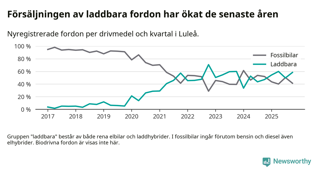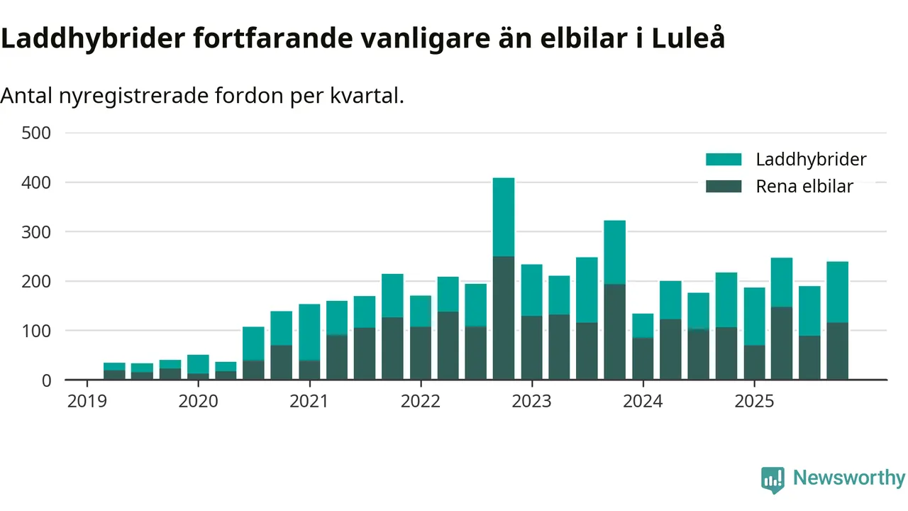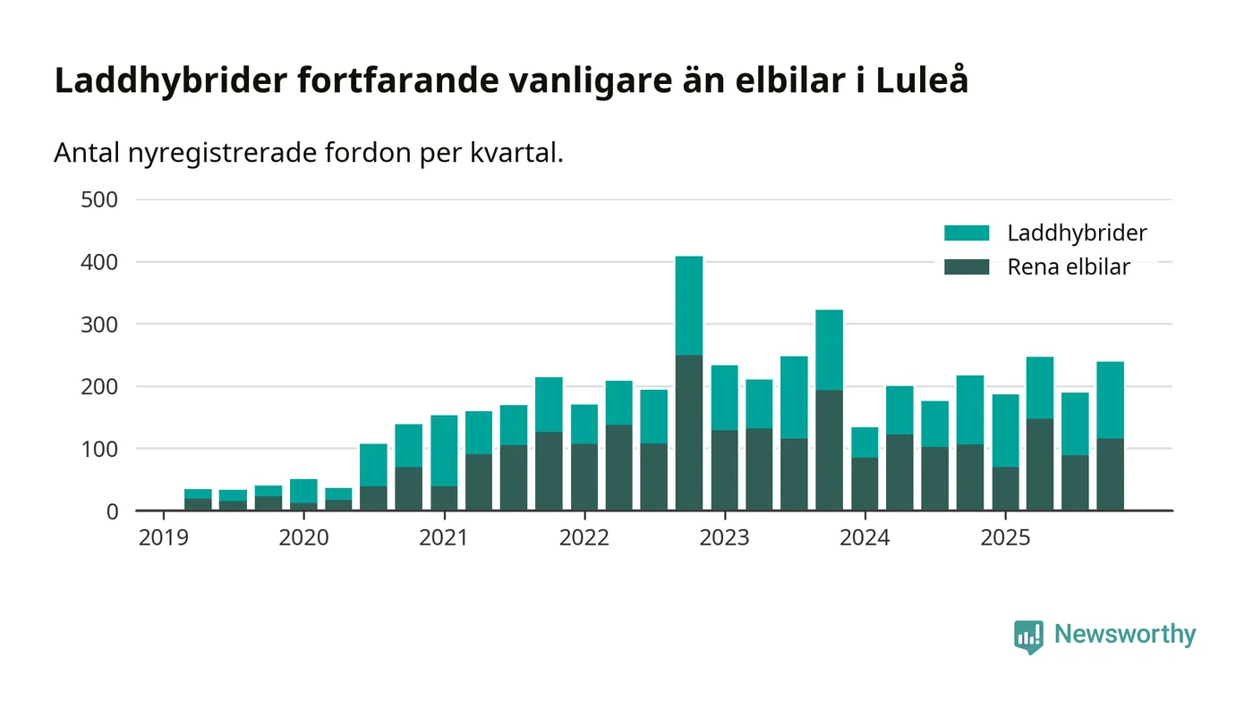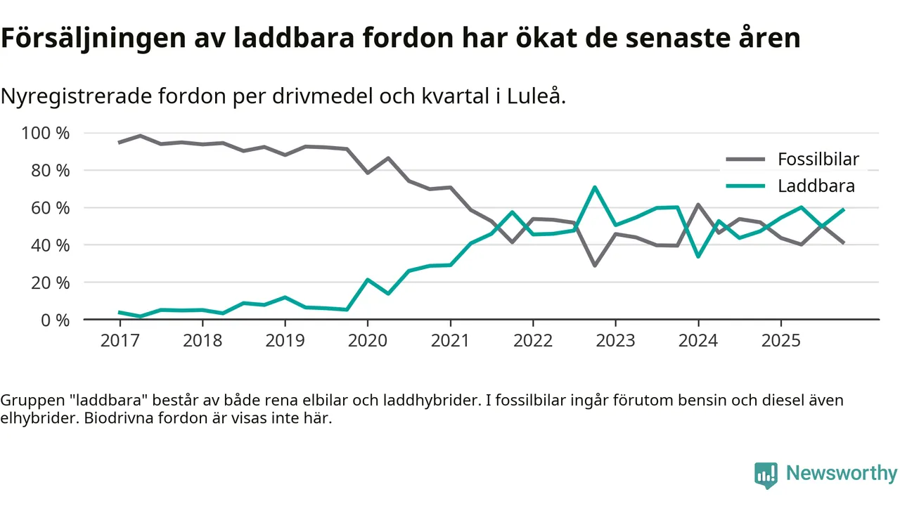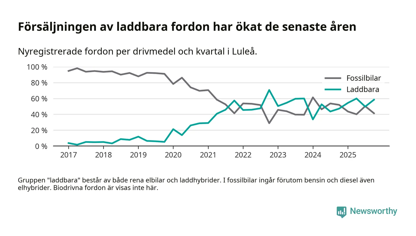 Under fjärde kvartalet 2025 var 58 procent av alla nyregistrerade personbilar i Luleå laddbara (sammanlagt registrerades 409 nya bilar). Merparten av de laddbara bilarna var så kallade laddhybrider, det vill säga fordon som går att ladda och köra på el, men som även har en förbränningsmotor. 28 procent av alla nya bilar var rena elbilar.