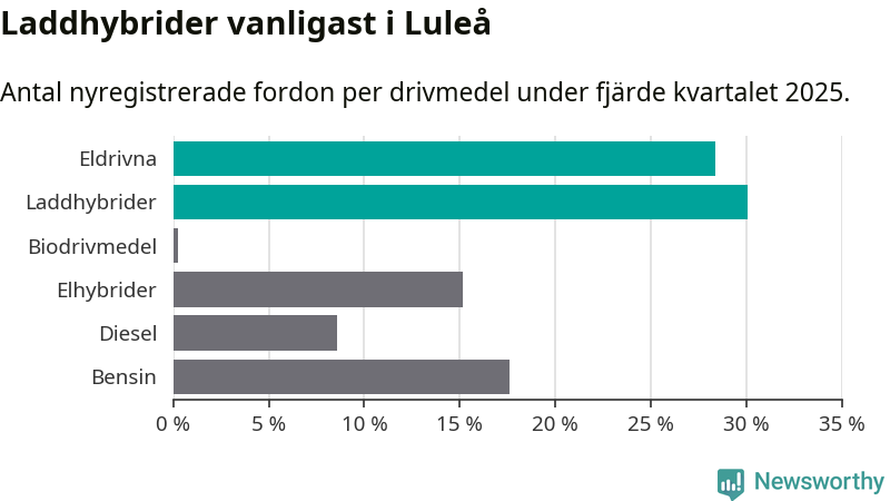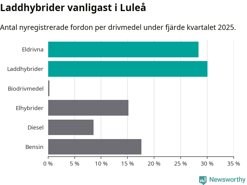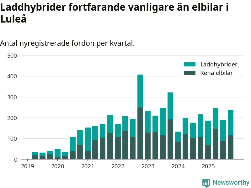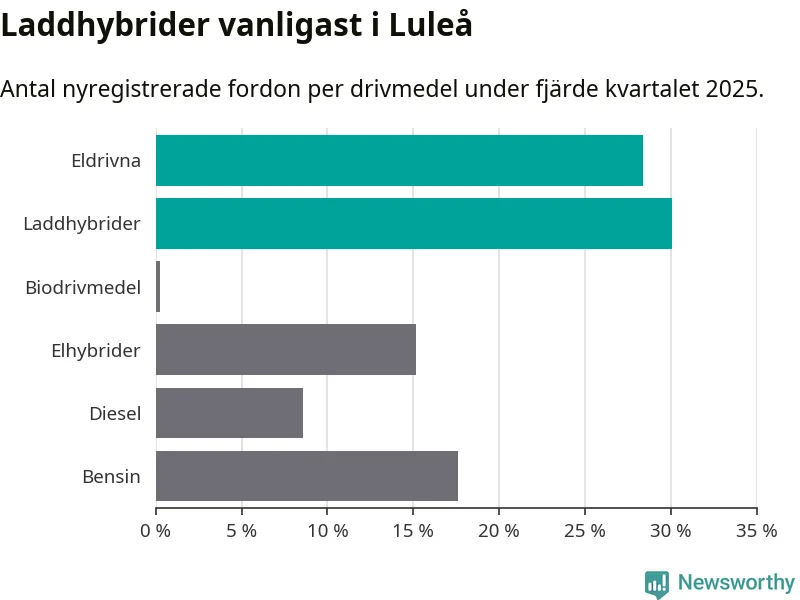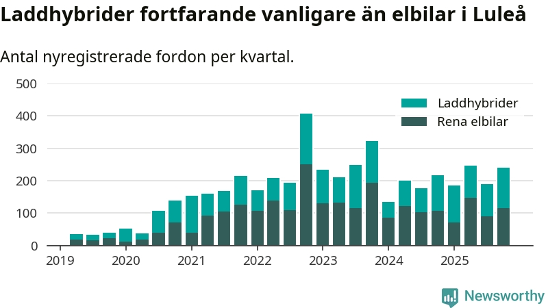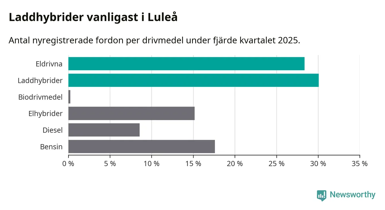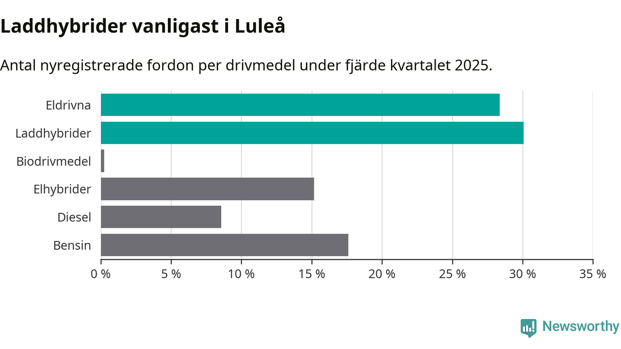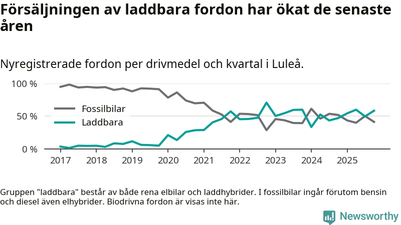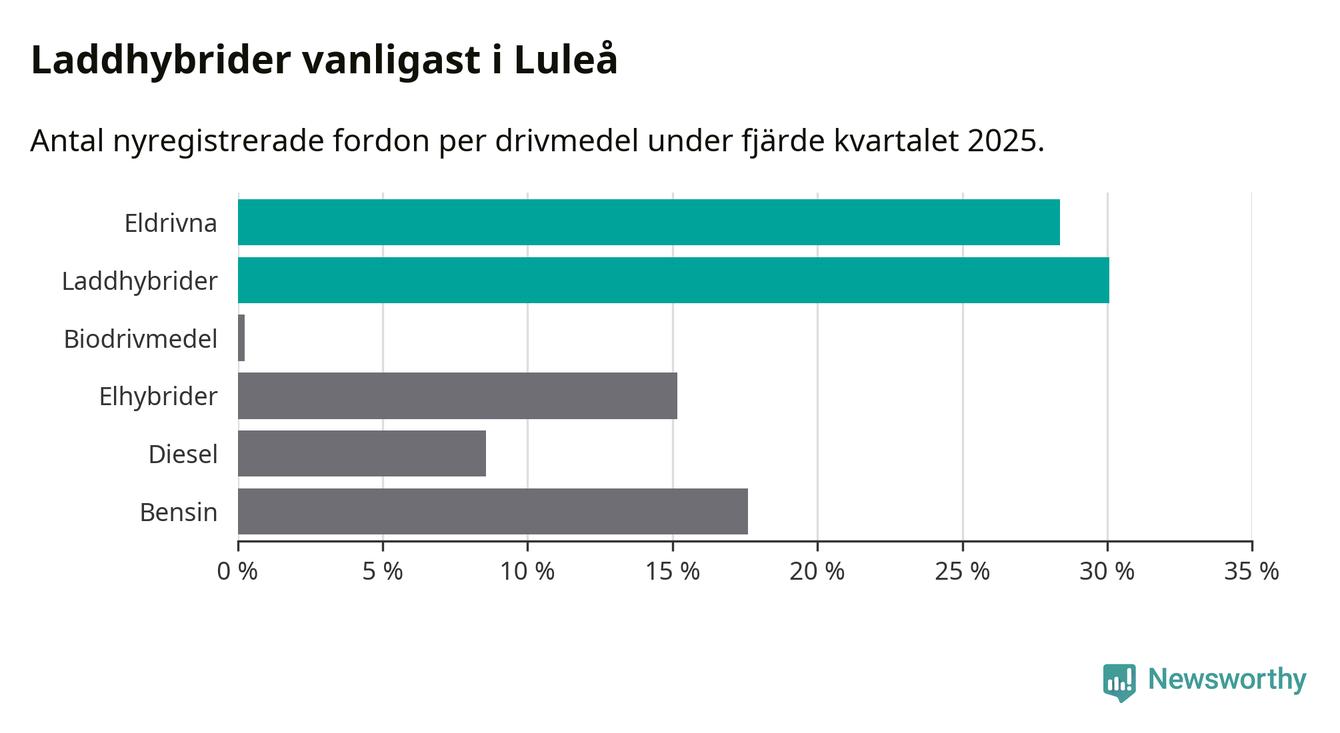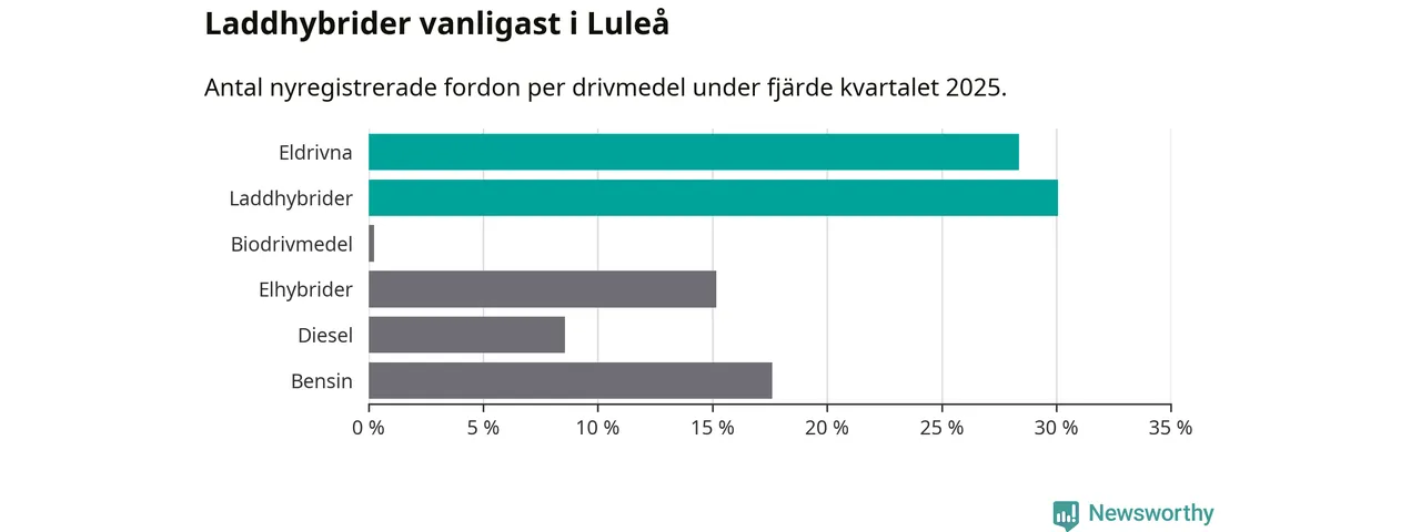 Under fjärde kvartalet 2025 var 58 procent av alla nyregistrerade personbilar i Luleå laddbara (sammanlagt registrerades 409 nya bilar). Merparten av de laddbara bilarna var så kallade laddhybrider, det vill säga fordon som går att ladda och köra på el, men som även har en förbränningsmotor. 28 procent av alla nya bilar var rena elbilar.