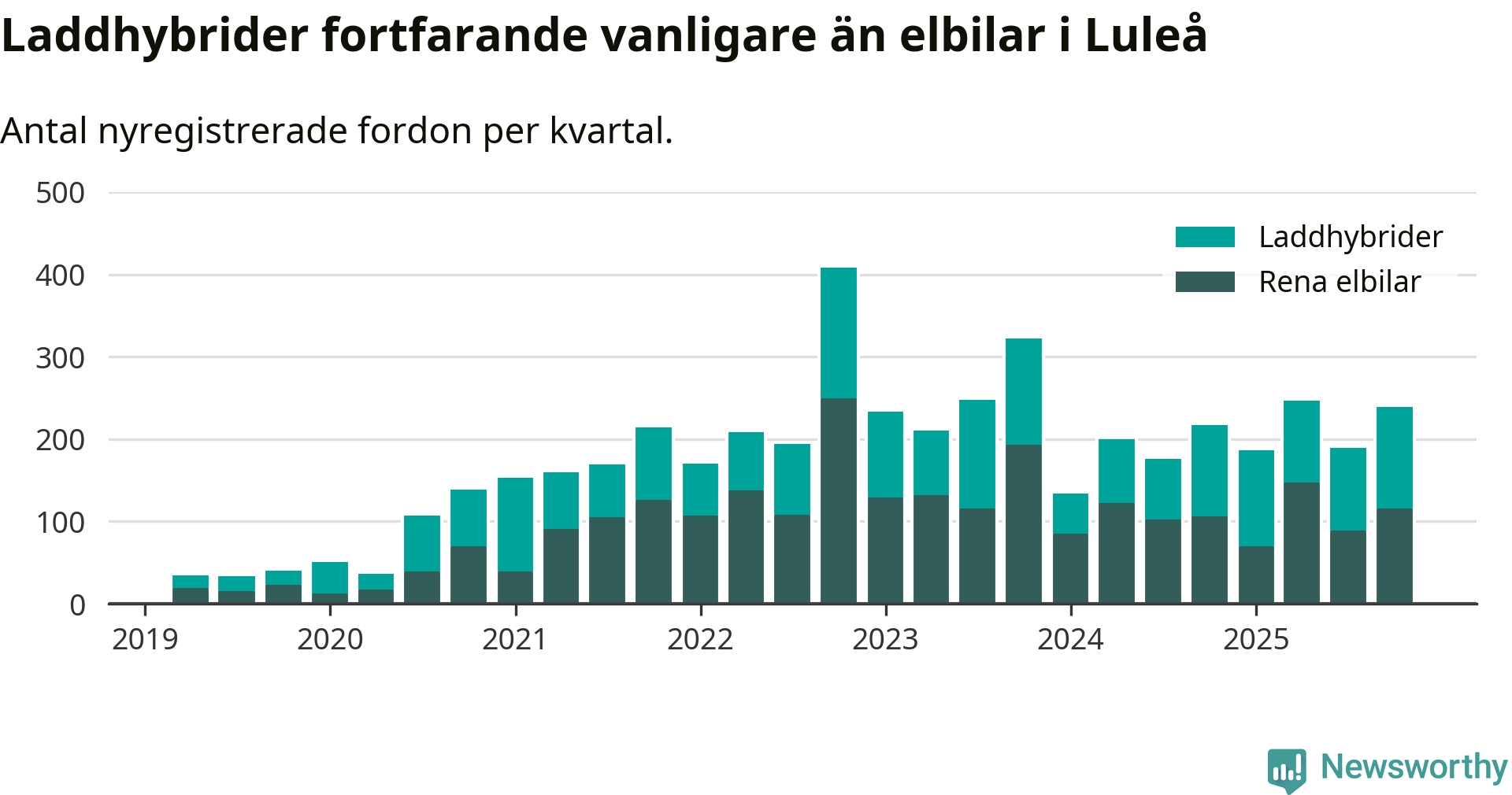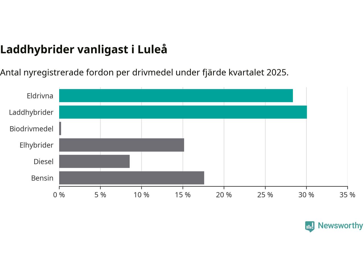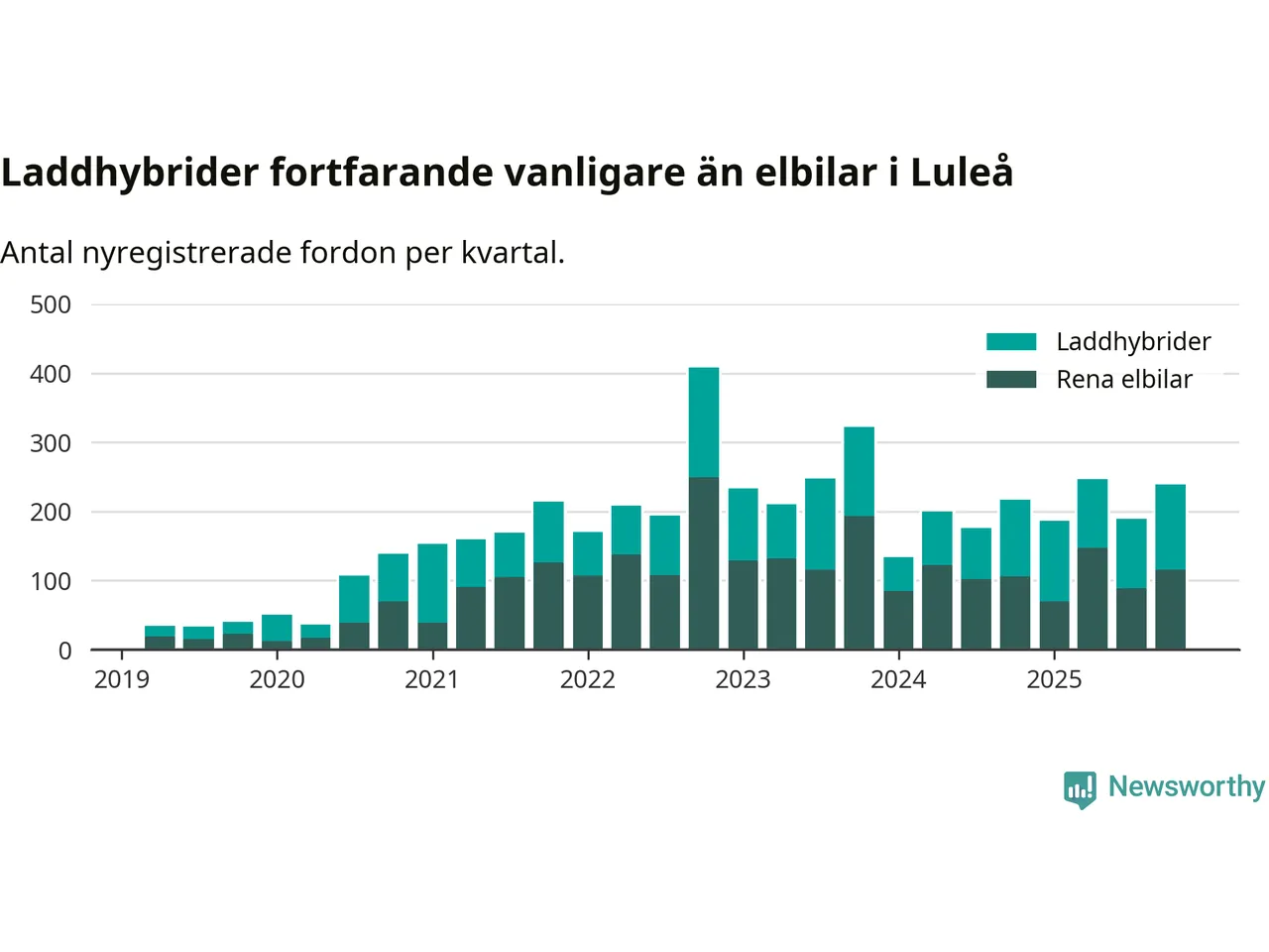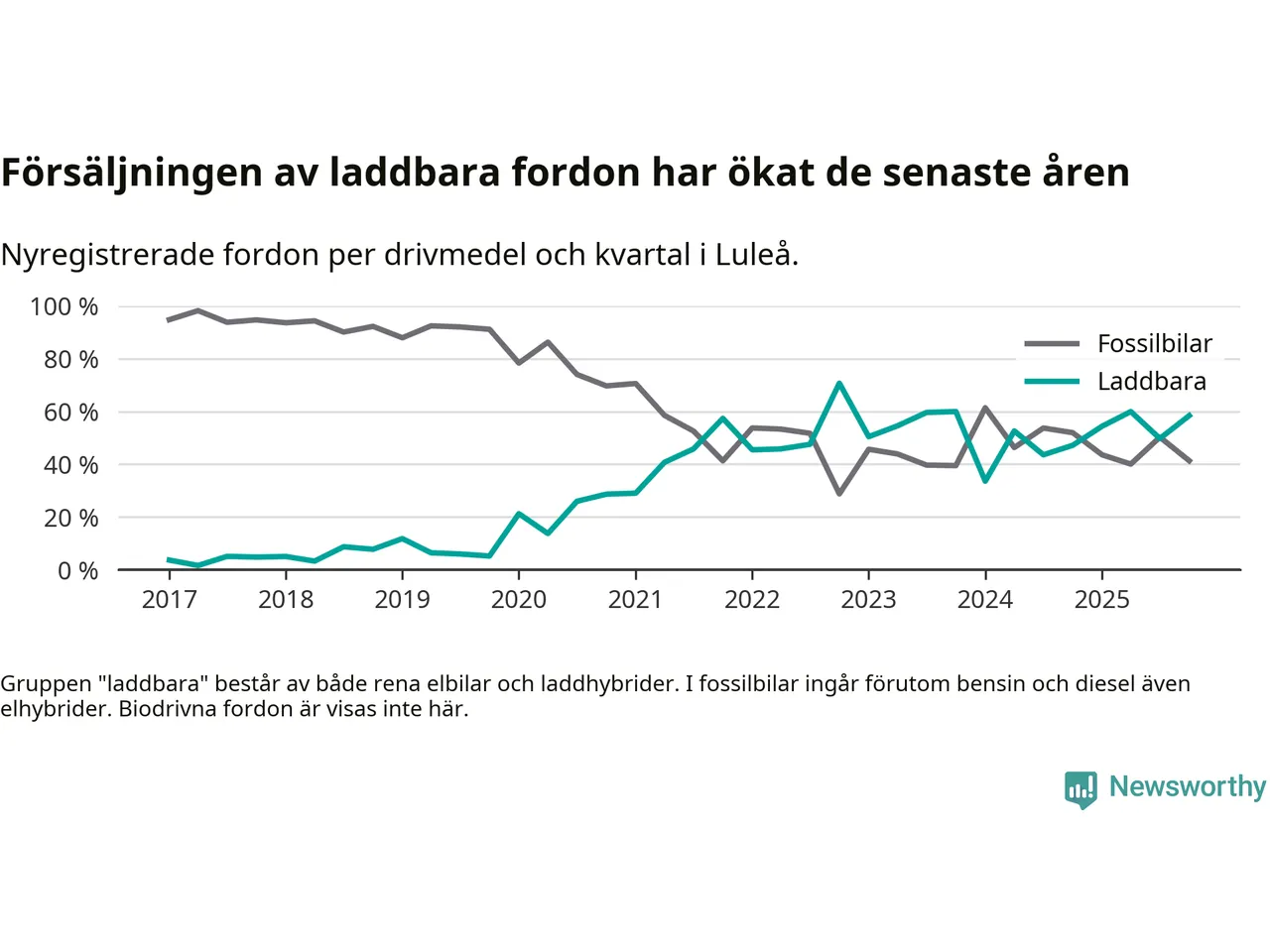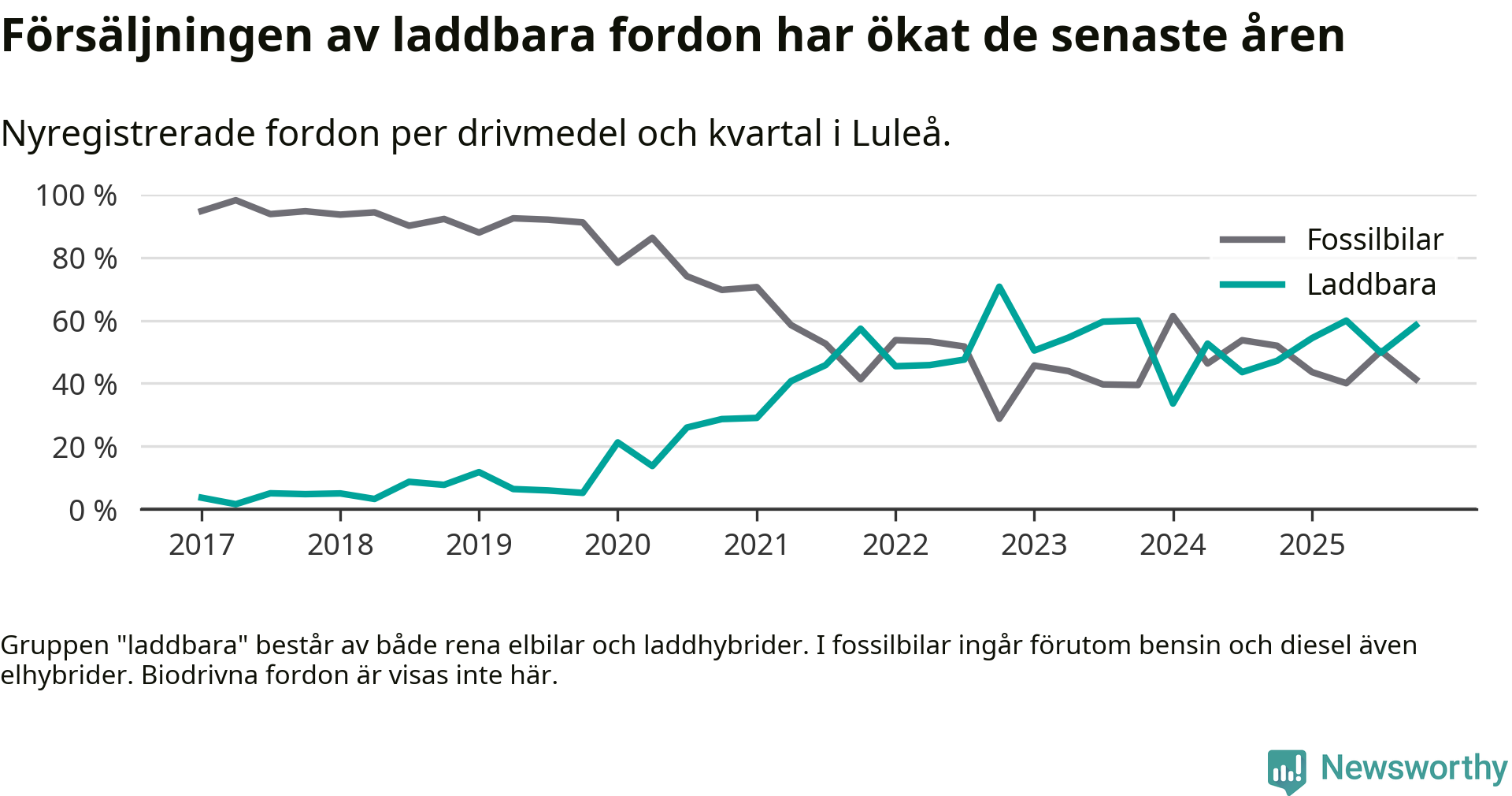 Under fjärde kvartalet 2025 var 58 procent av alla nyregistrerade personbilar i Luleå laddbara (sammanlagt registrerades 409 nya bilar). Merparten av de laddbara bilarna var så kallade laddhybrider, det vill säga fordon som går att ladda och köra på el, men som även har en förbränningsmotor. 28 procent av alla nya bilar var rena elbilar.