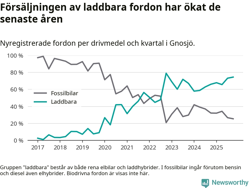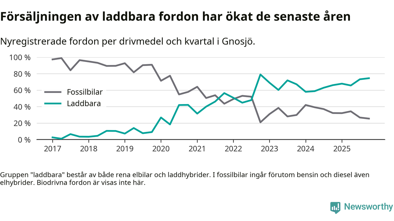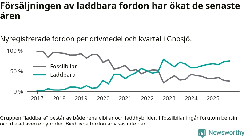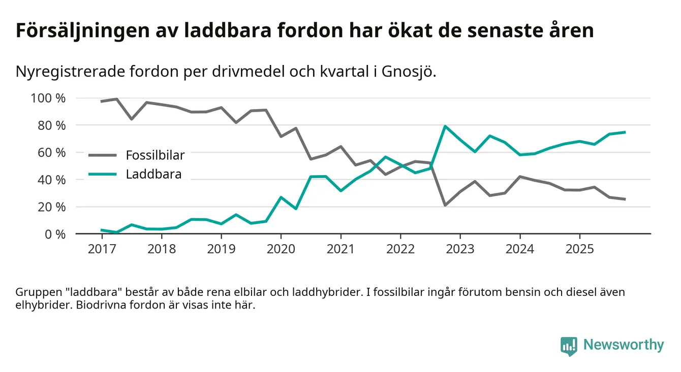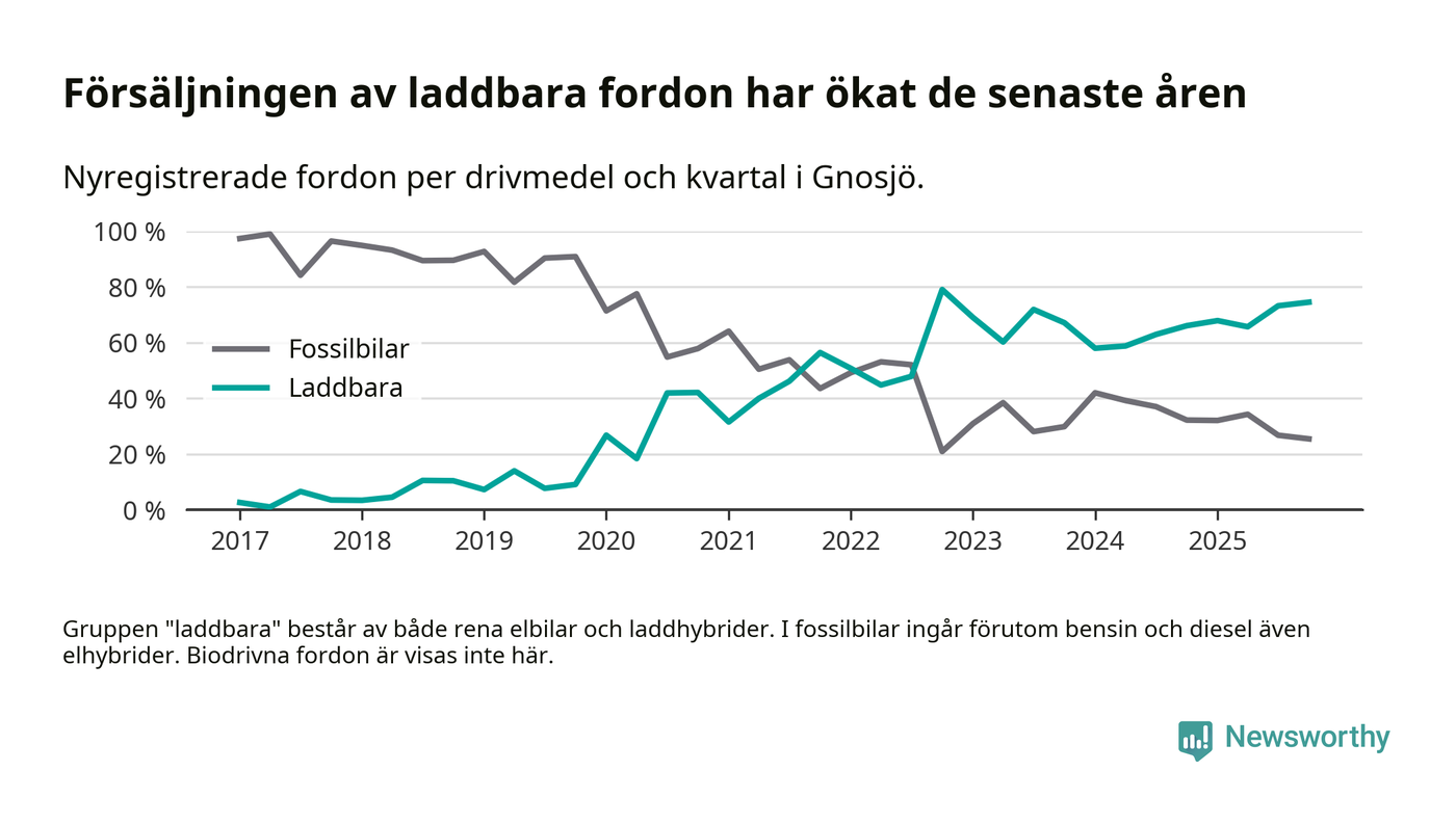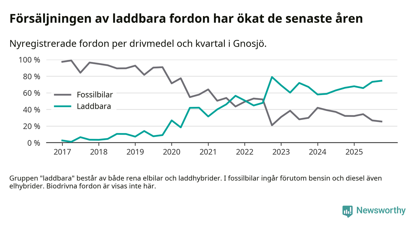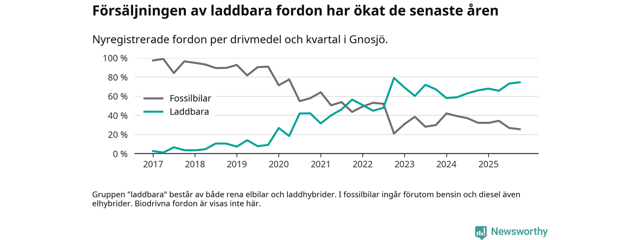 Under fjärde kvartalet 2025 var 75 procent av alla nyregistrerade personbilar i Gnosjö laddbara (sammanlagt registrerades 55 nya bilar). Merparten av de laddbara bilarna var rena elbilar (42 procent av alla).