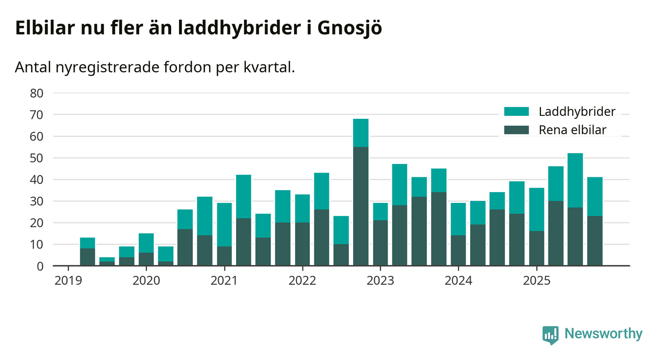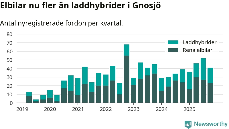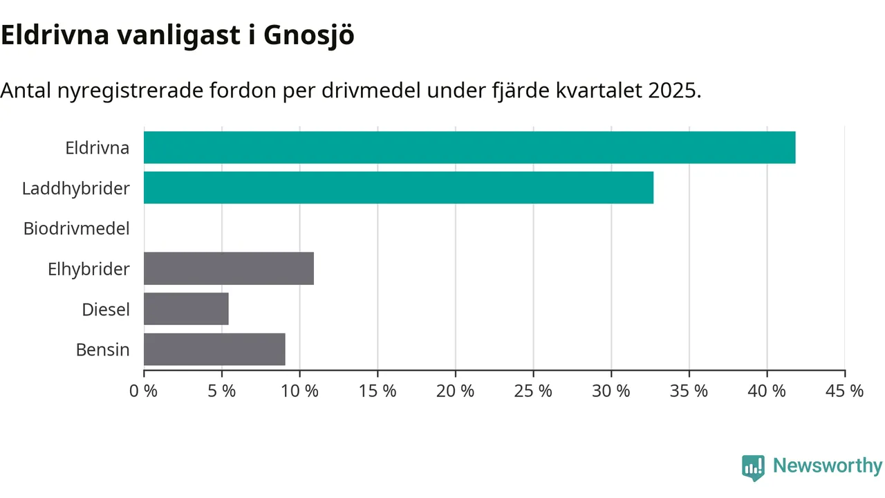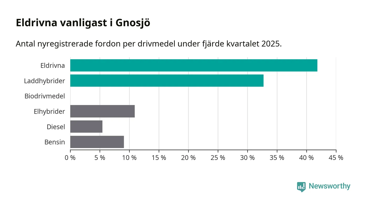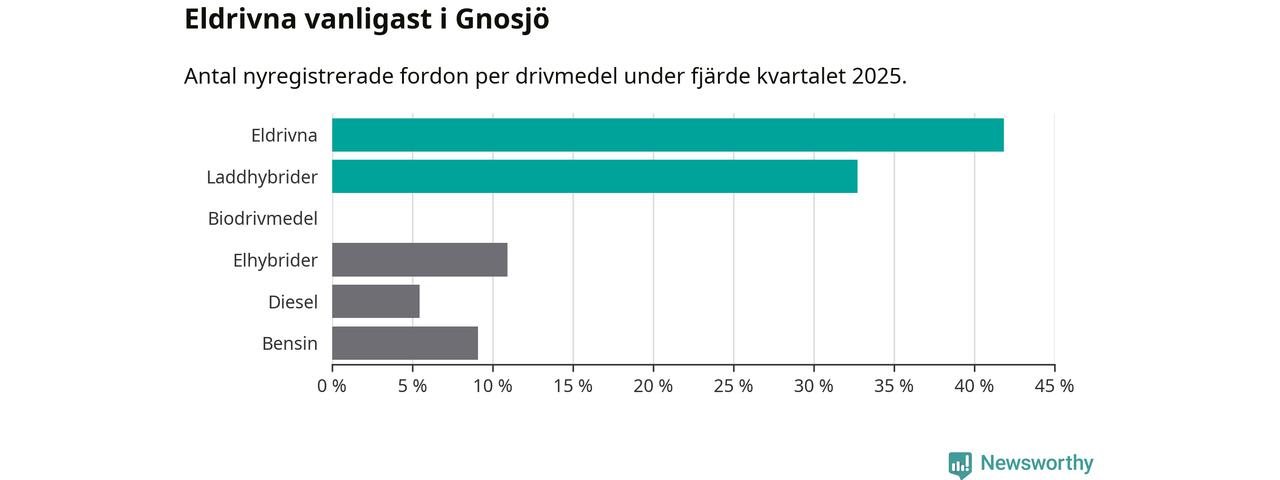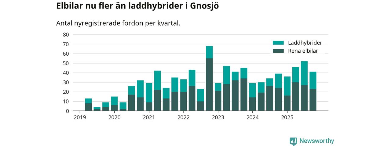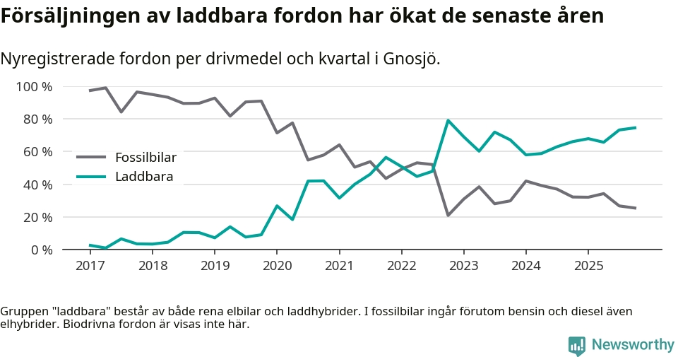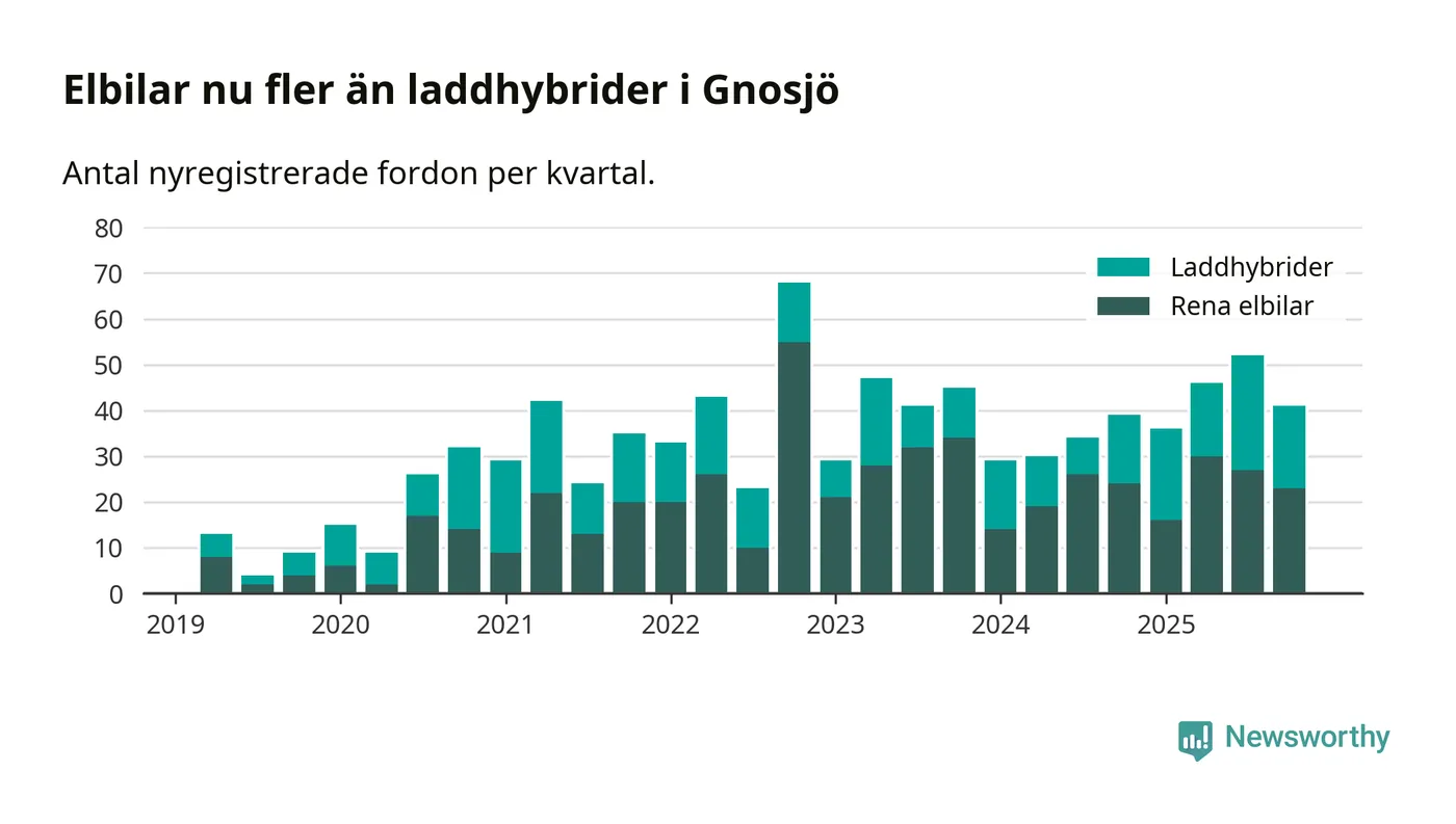 Under fjärde kvartalet 2025 var 75 procent av alla nyregistrerade personbilar i Gnosjö laddbara (sammanlagt registrerades 55 nya bilar). Merparten av de laddbara bilarna var rena elbilar (42 procent av alla).