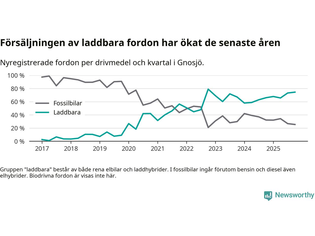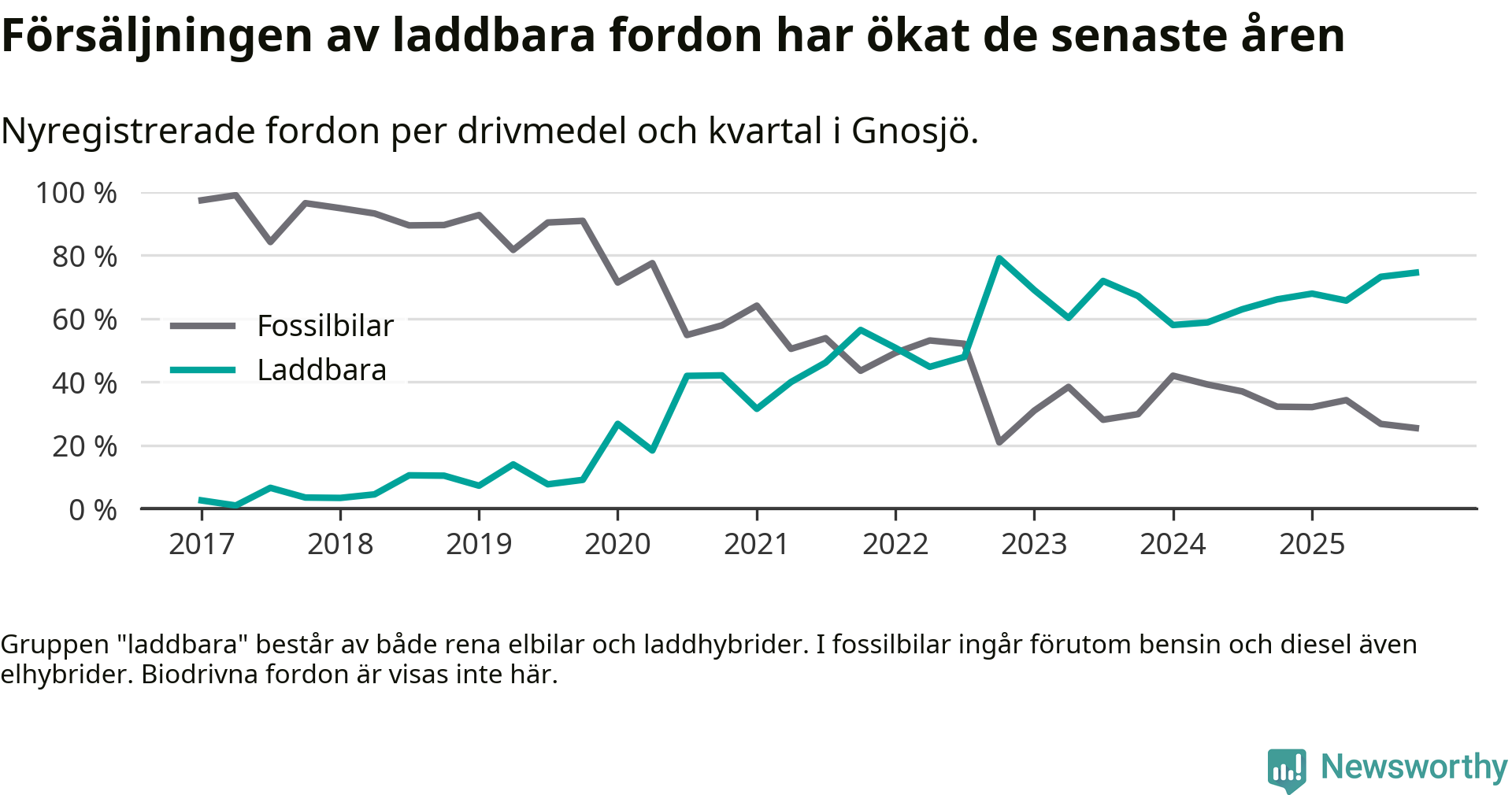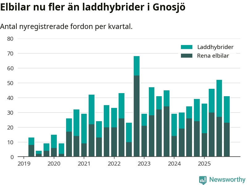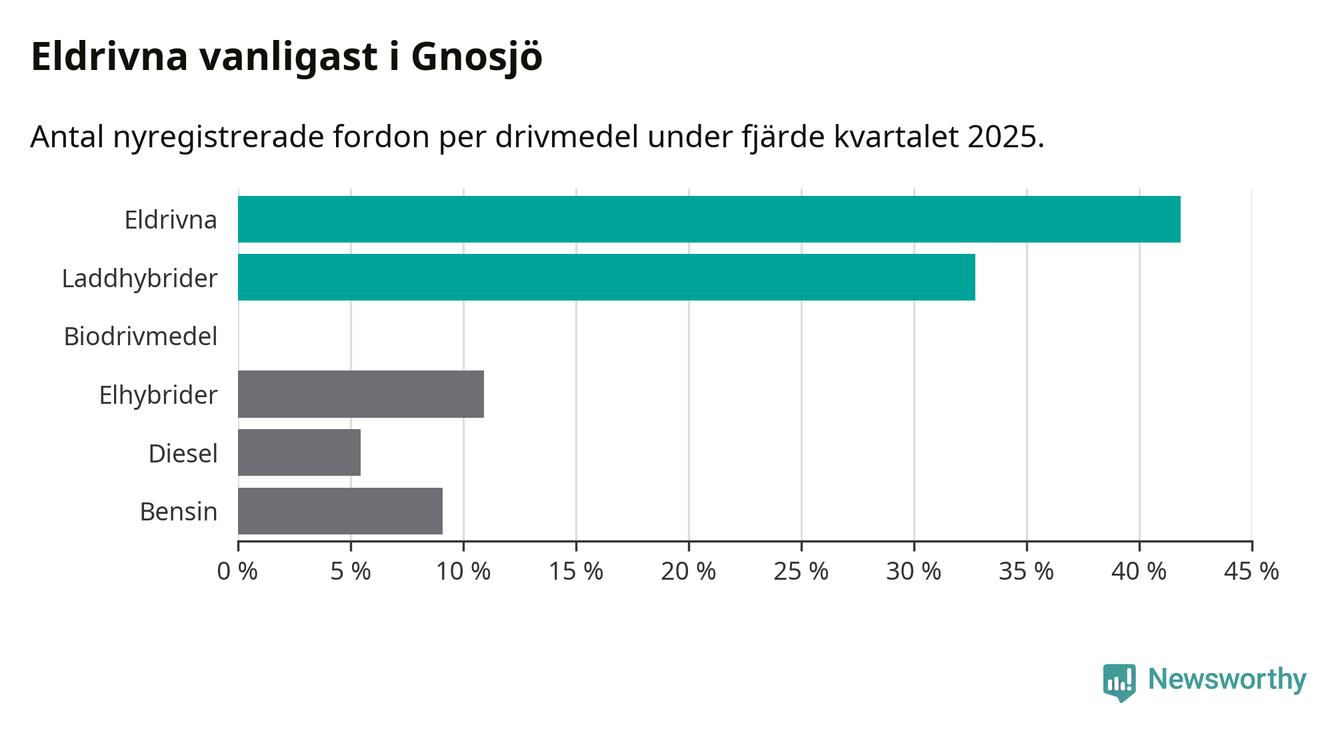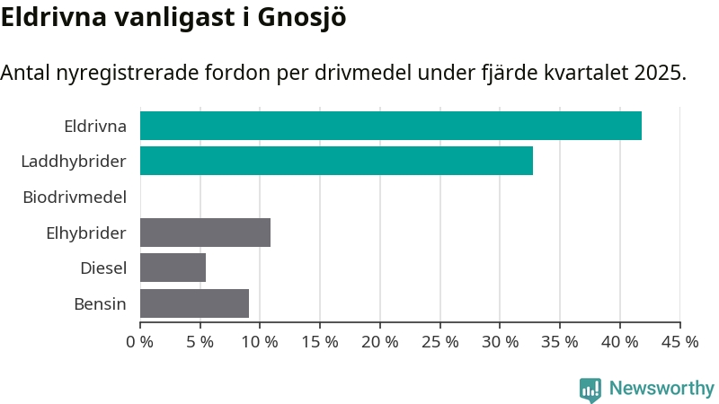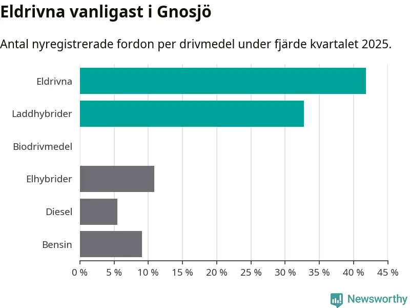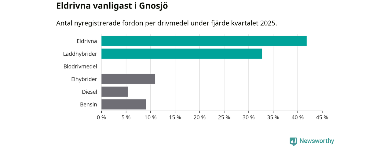 Under fjärde kvartalet 2025 var 75 procent av alla nyregistrerade personbilar i Gnosjö laddbara (sammanlagt registrerades 55 nya bilar). Merparten av de laddbara bilarna var rena elbilar (42 procent av alla).