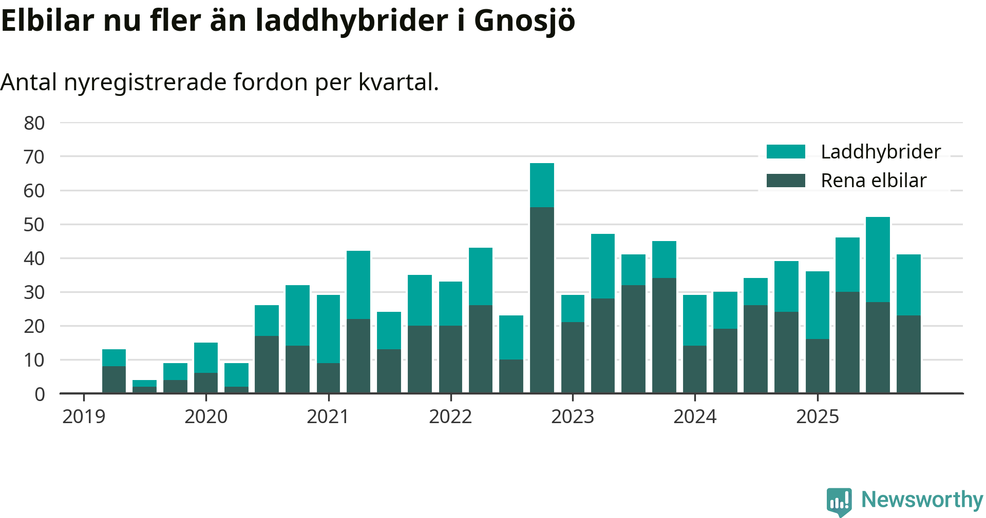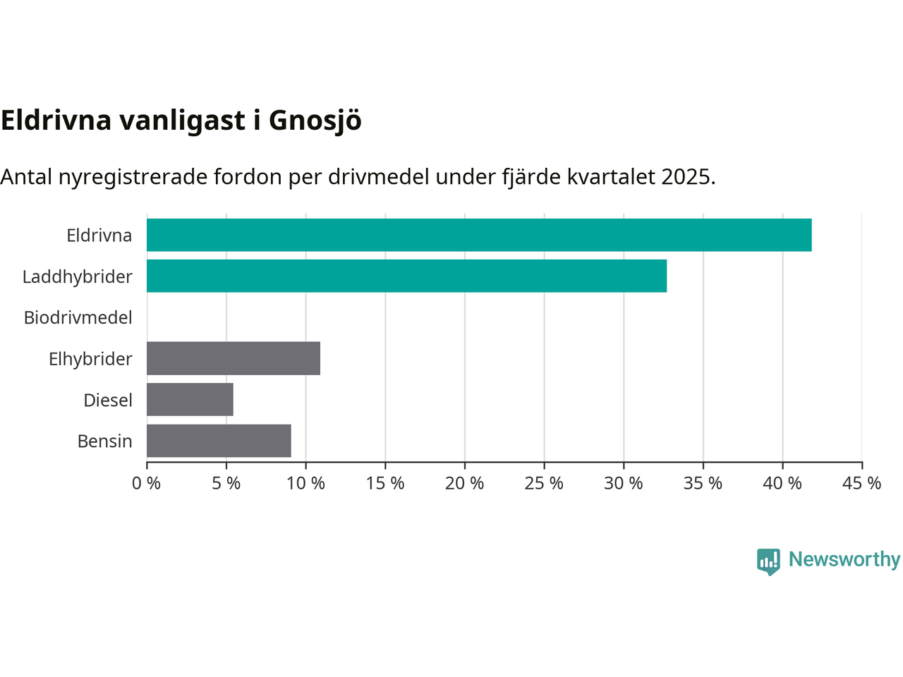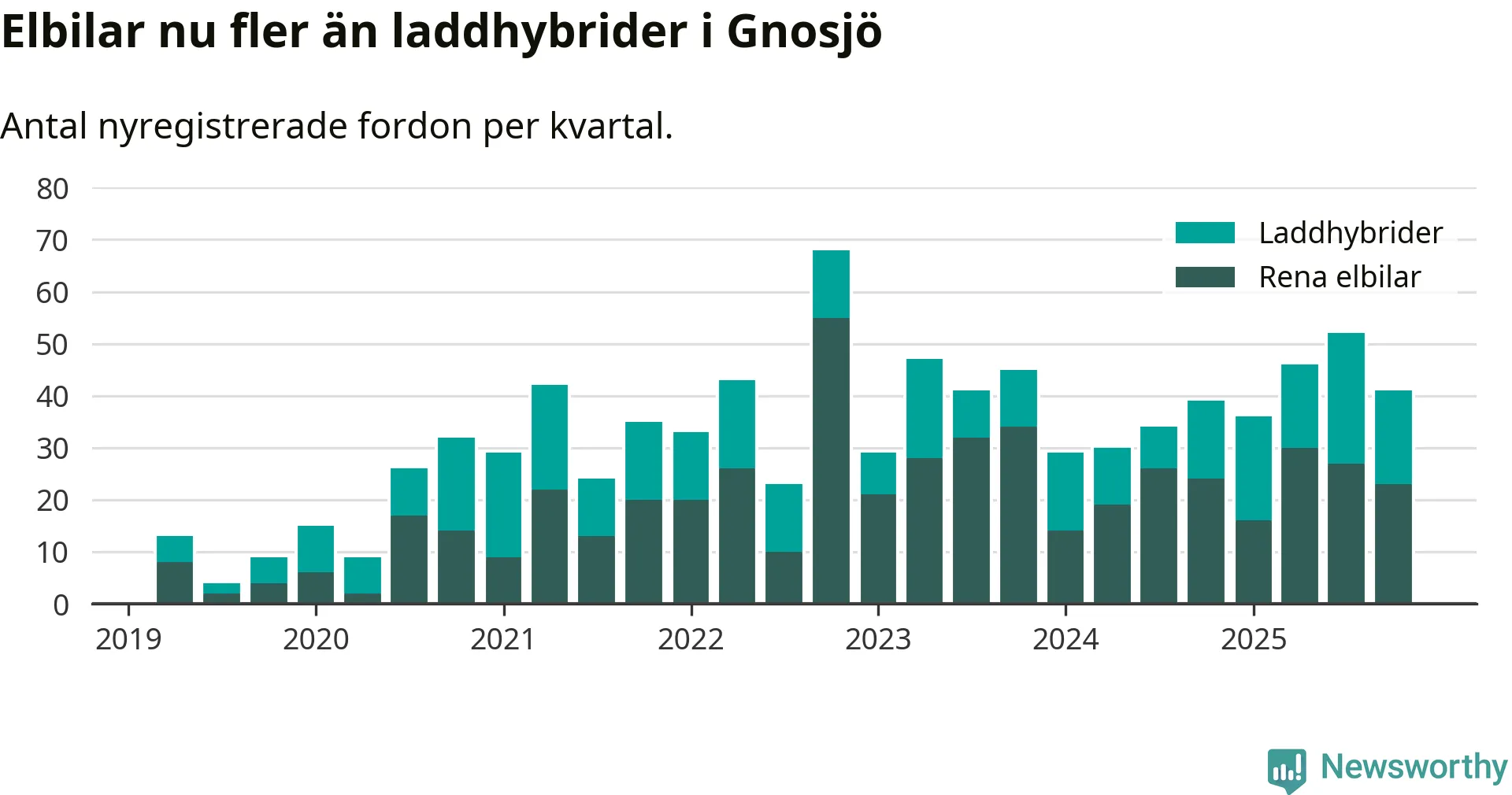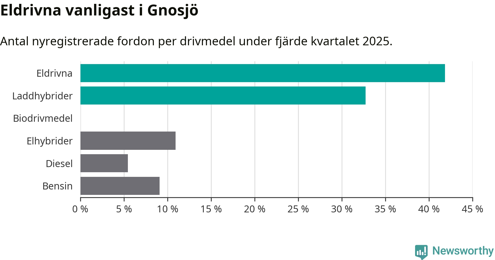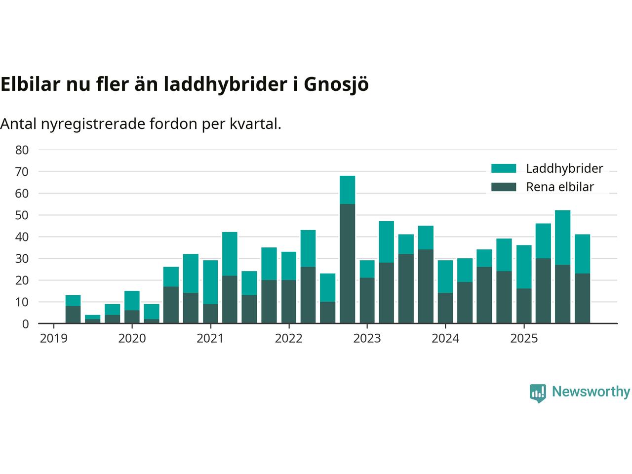 Under fjärde kvartalet 2025 var 75 procent av alla nyregistrerade personbilar i Gnosjö laddbara (sammanlagt registrerades 55 nya bilar). Merparten av de laddbara bilarna var rena elbilar (42 procent av alla).