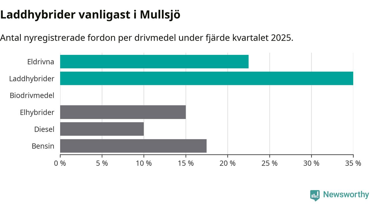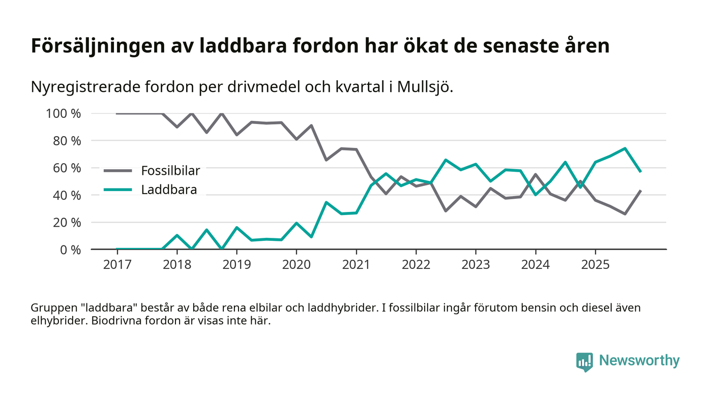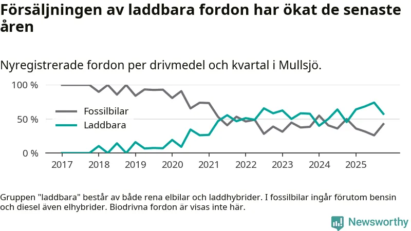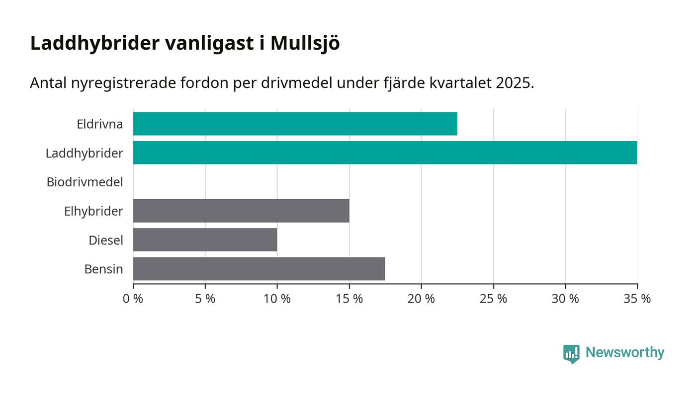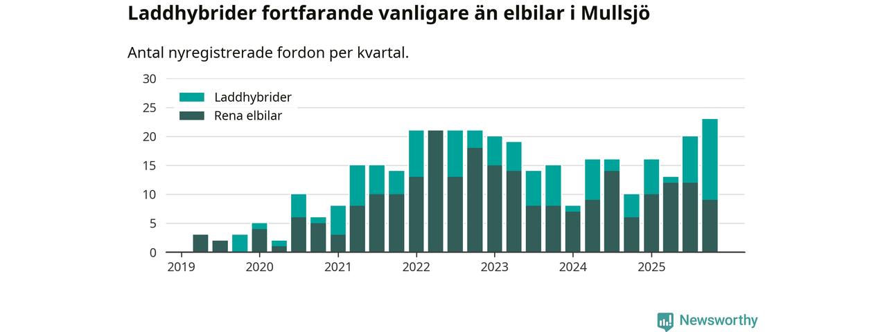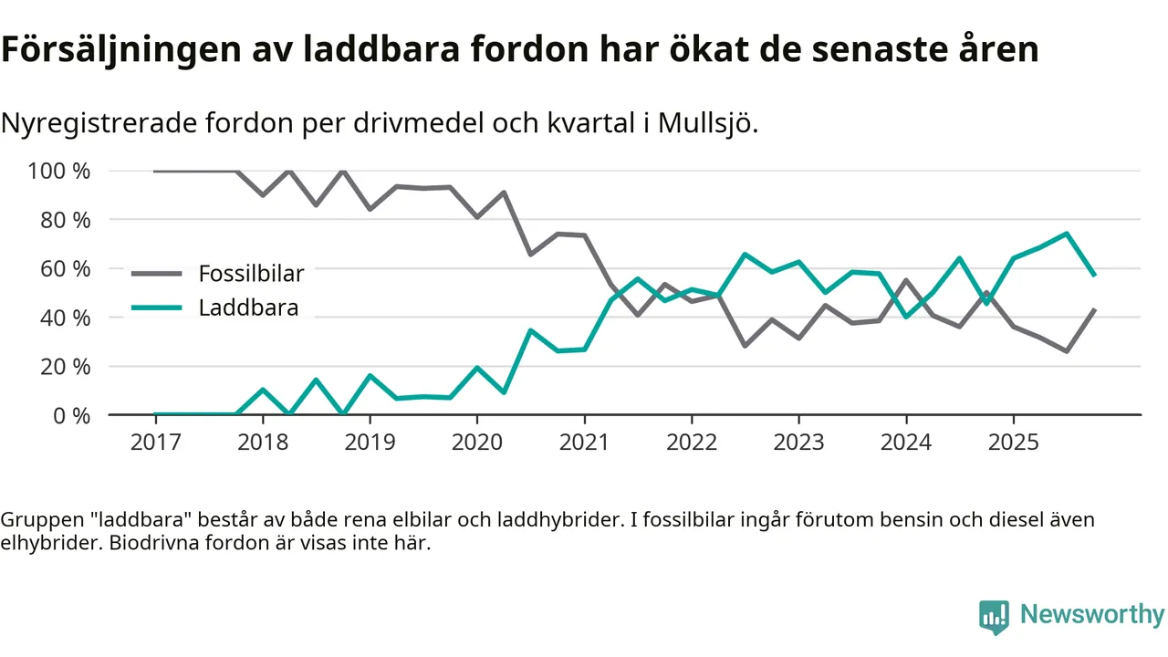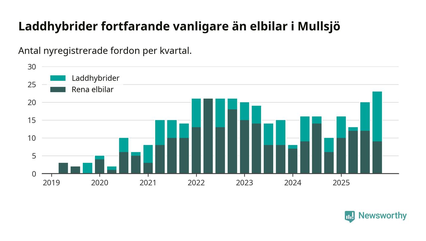 Under fjärde kvartalet 2025 var 57 procent av alla nyregistrerade personbilar i Mullsjö laddbara (sammanlagt registrerades 40 nya bilar). Merparten av de laddbara bilarna var så kallade laddhybrider, det vill säga fordon som går att ladda och köra på el, men som även har en förbränningsmotor. 23 procent av alla nya bilar var rena elbilar.