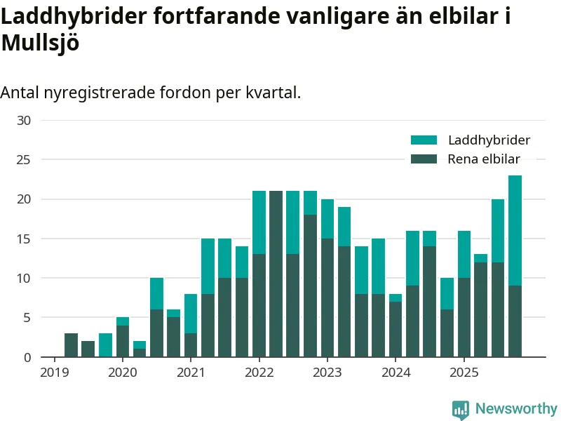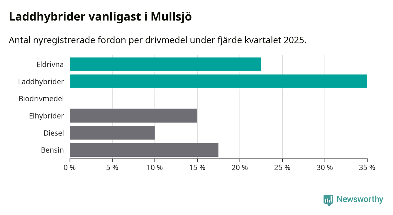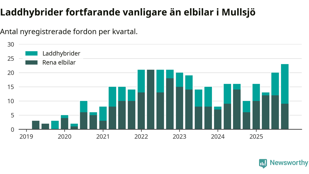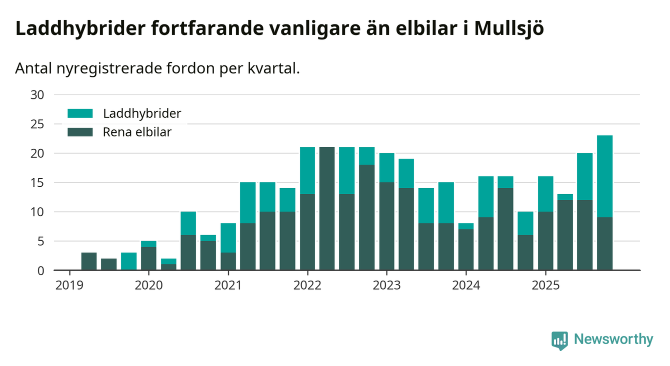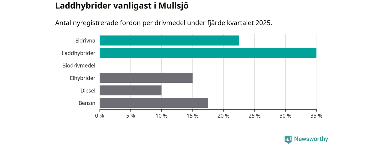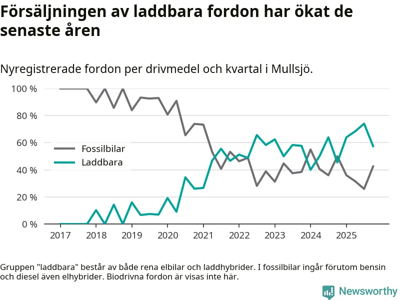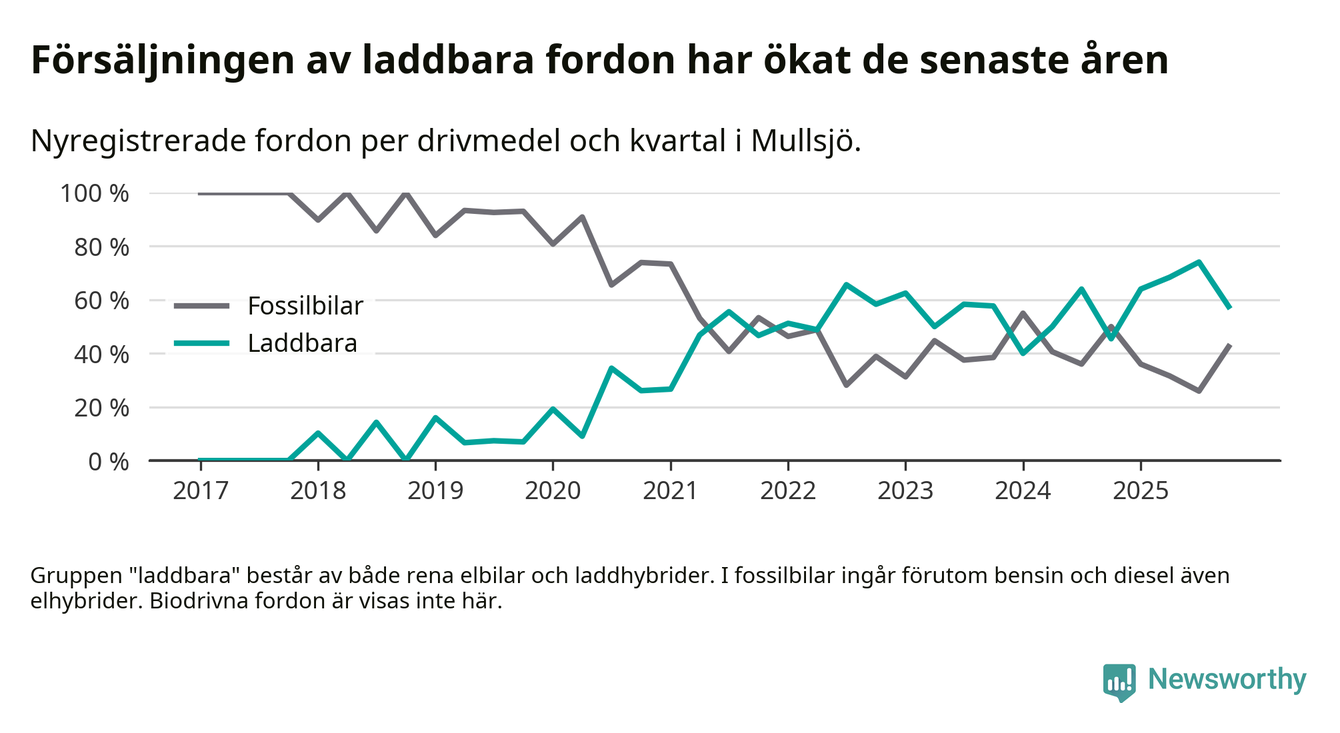 Under fjärde kvartalet 2025 var 57 procent av alla nyregistrerade personbilar i Mullsjö laddbara (sammanlagt registrerades 40 nya bilar). Merparten av de laddbara bilarna var så kallade laddhybrider, det vill säga fordon som går att ladda och köra på el, men som även har en förbränningsmotor. 23 procent av alla nya bilar var rena elbilar.