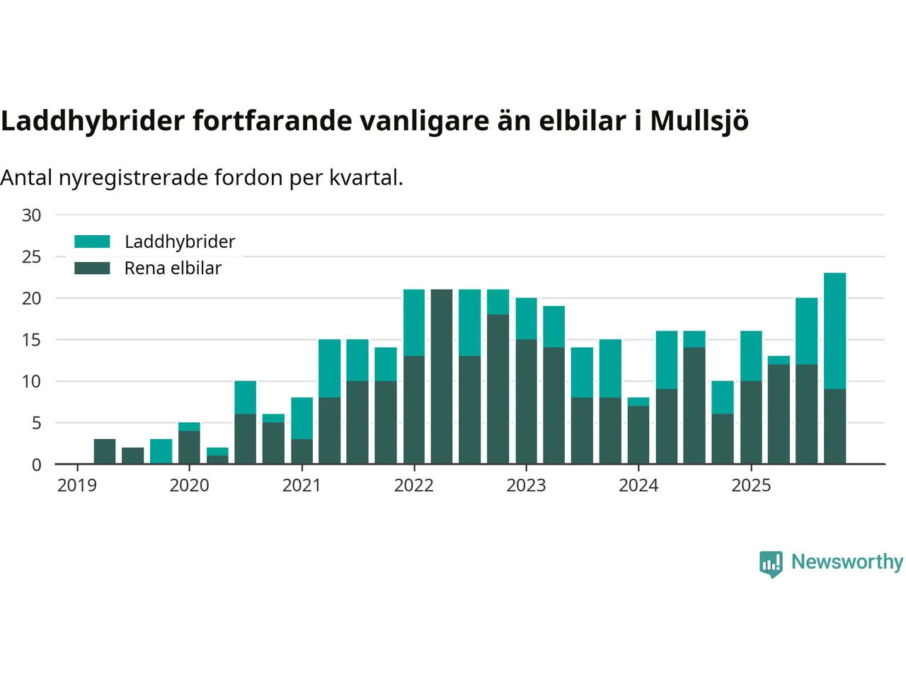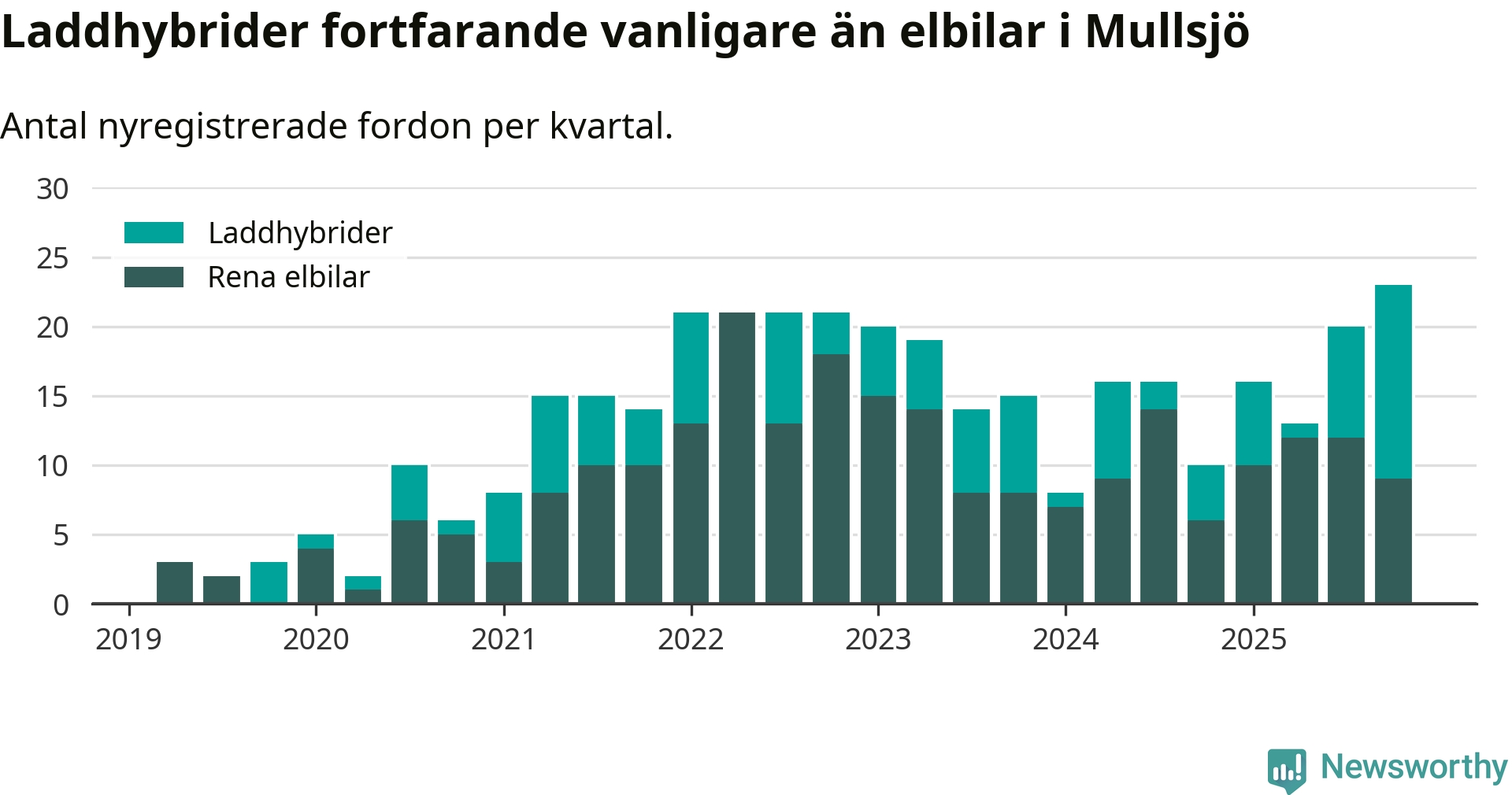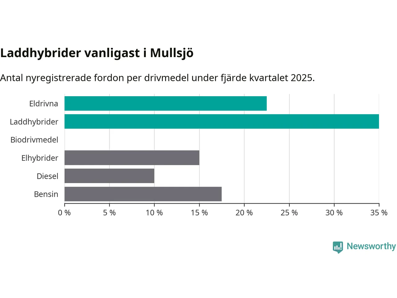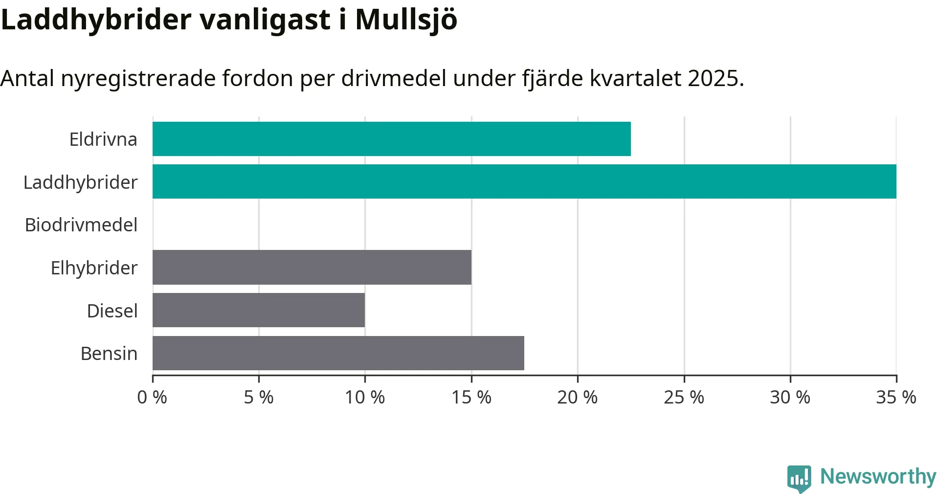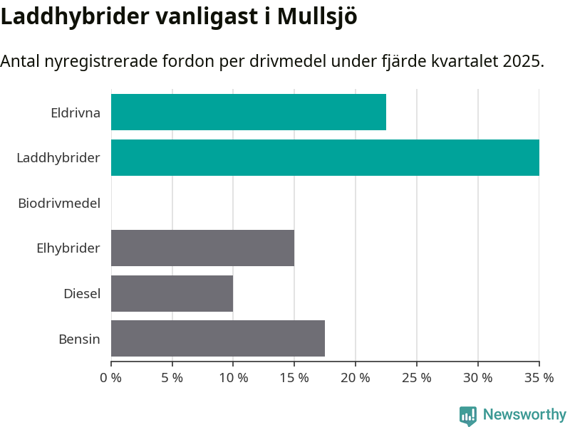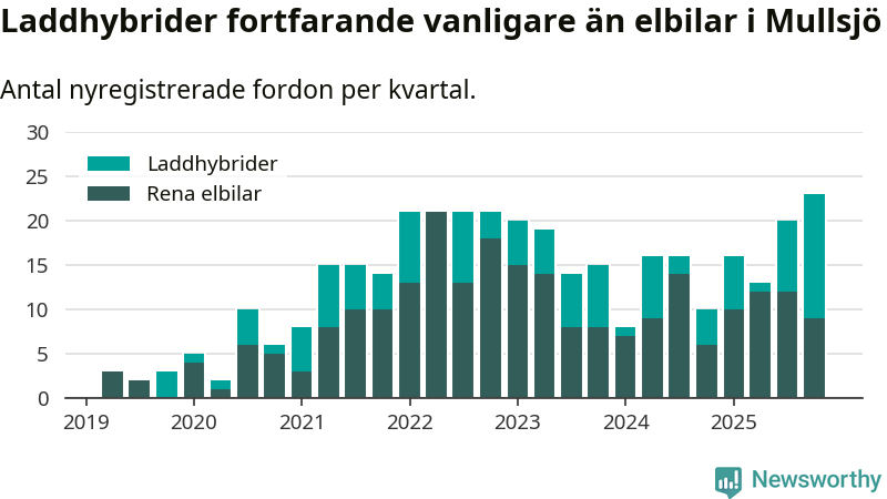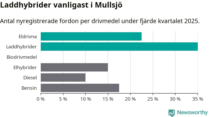 Under fjärde kvartalet 2025 var 57 procent av alla nyregistrerade personbilar i Mullsjö laddbara (sammanlagt registrerades 40 nya bilar). Merparten av de laddbara bilarna var så kallade laddhybrider, det vill säga fordon som går att ladda och köra på el, men som även har en förbränningsmotor. 23 procent av alla nya bilar var rena elbilar.