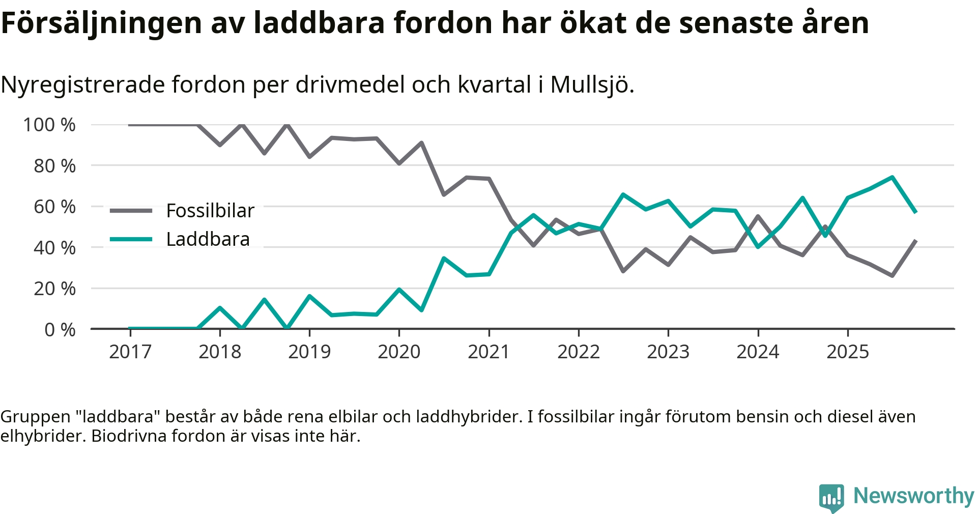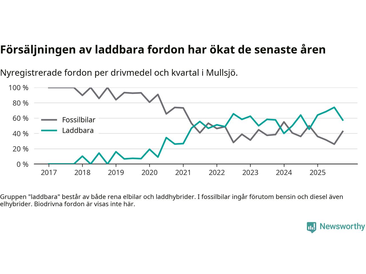 I Mullsjö minskade andelen laddbara bilar under fjärde kvartalet jämfört med kvartalet innan (−16,6 procentenheter). Nyregistreringen peakade under tredje kvartalet 2025 då 74 procent av de nya bilarna var laddbara.