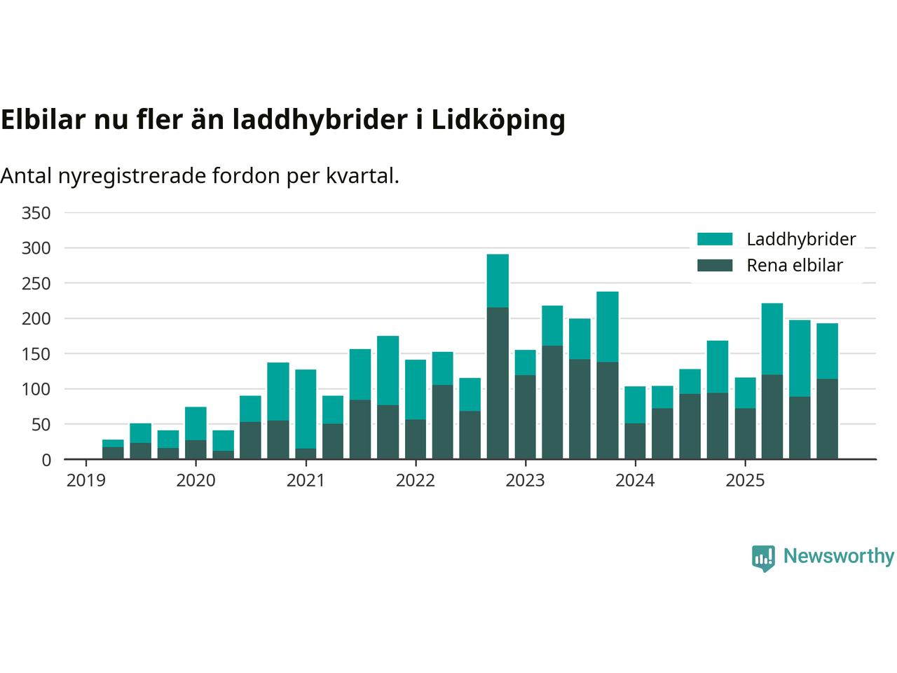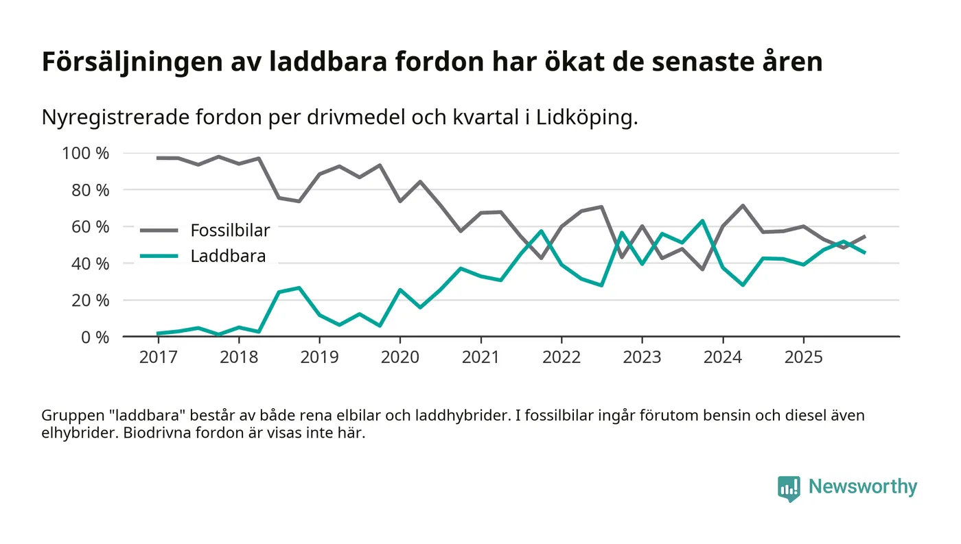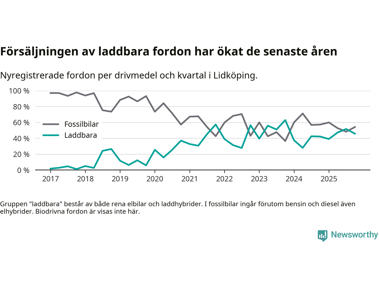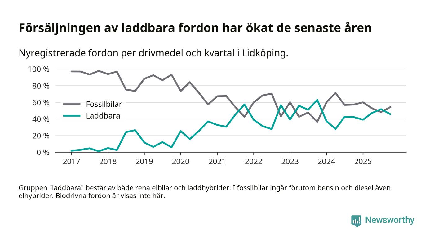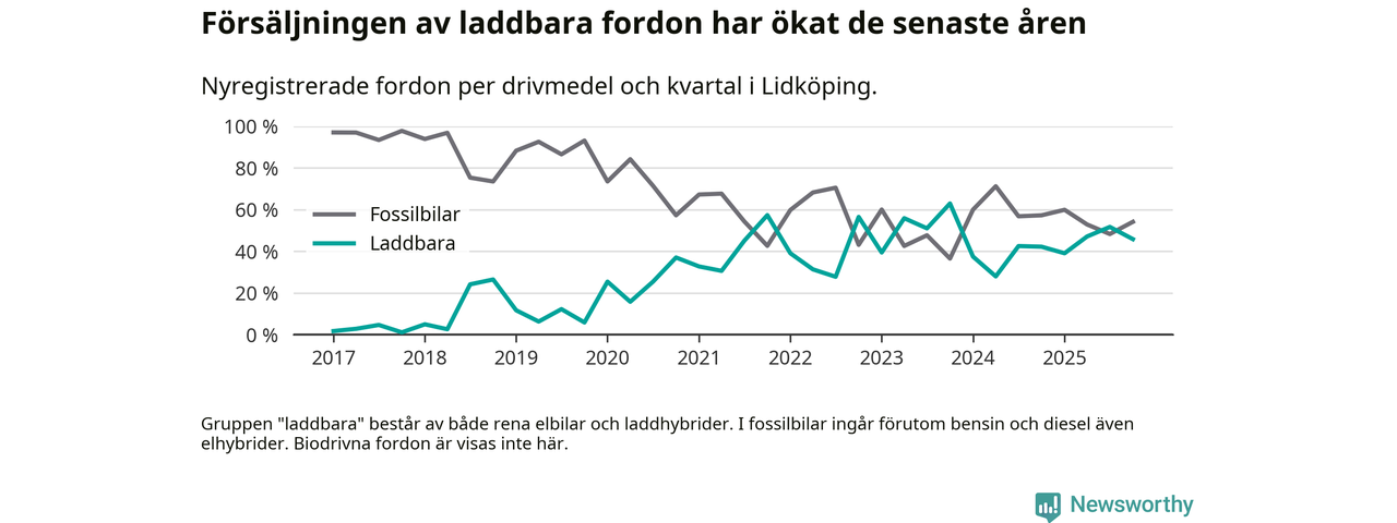 Under fjärde kvartalet 2025 var 46 procent av alla nyregistrerade personbilar i Lidköping laddbara (sammanlagt registrerades 421 nya bilar). Merparten av de laddbara bilarna var rena elbilar (27 procent av alla).