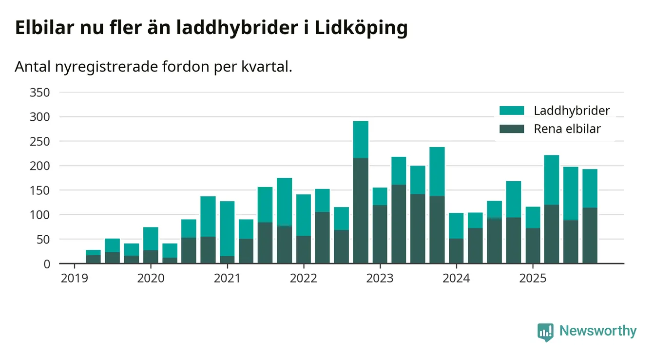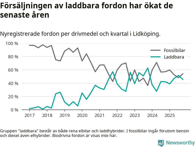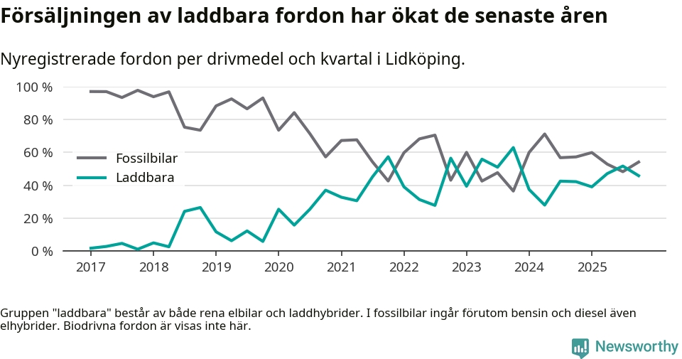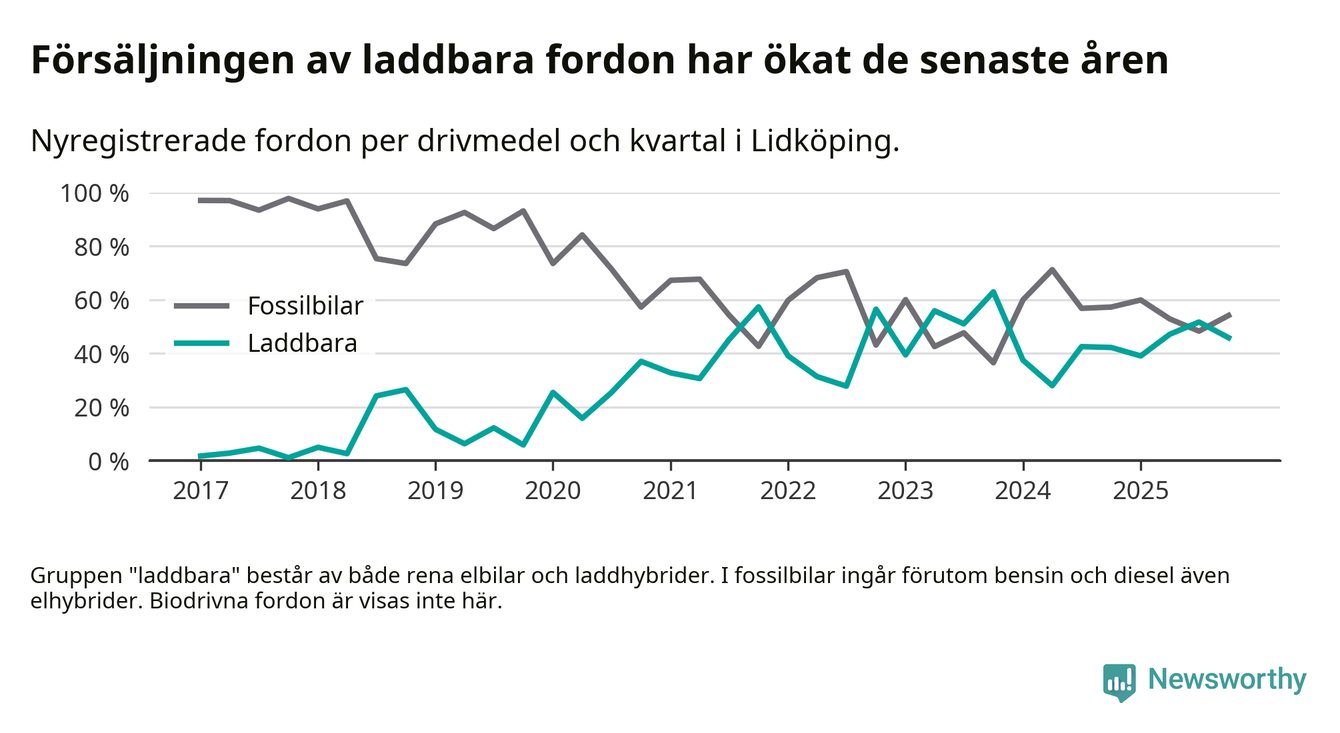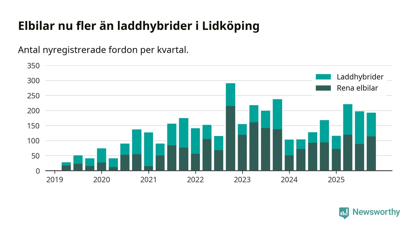 Under fjärde kvartalet 2025 var 46 procent av alla nyregistrerade personbilar i Lidköping laddbara (sammanlagt registrerades 421 nya bilar). Merparten av de laddbara bilarna var rena elbilar (27 procent av alla).