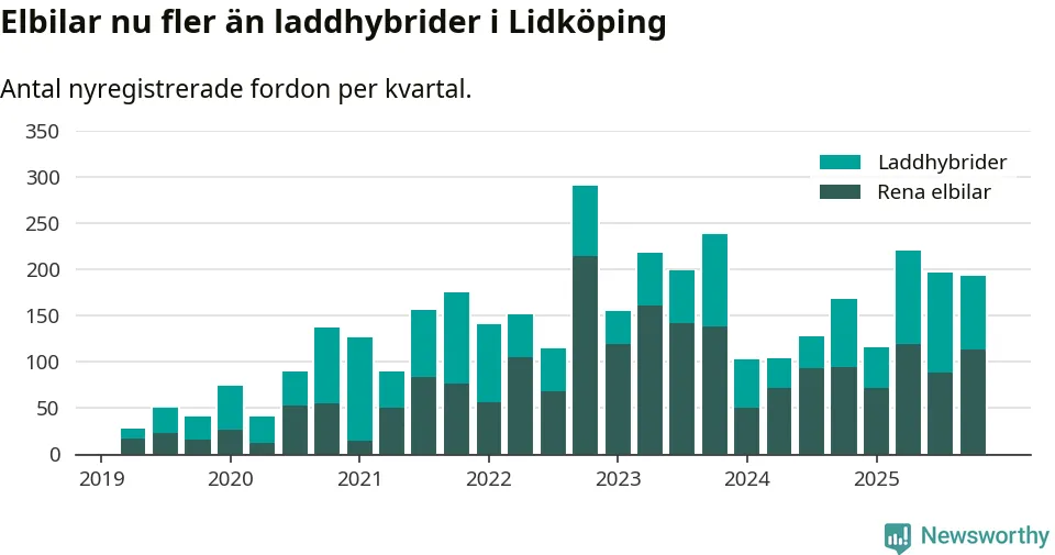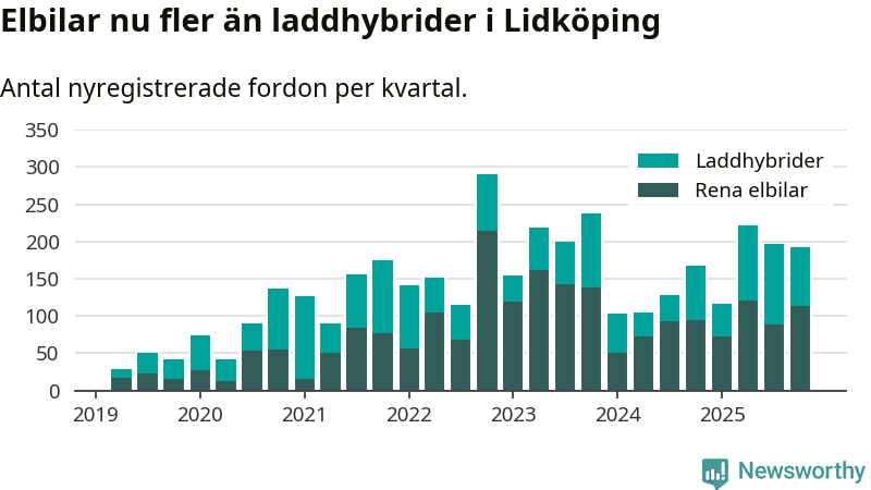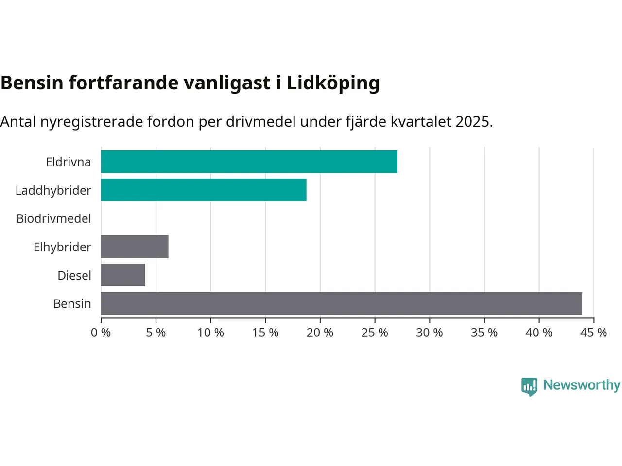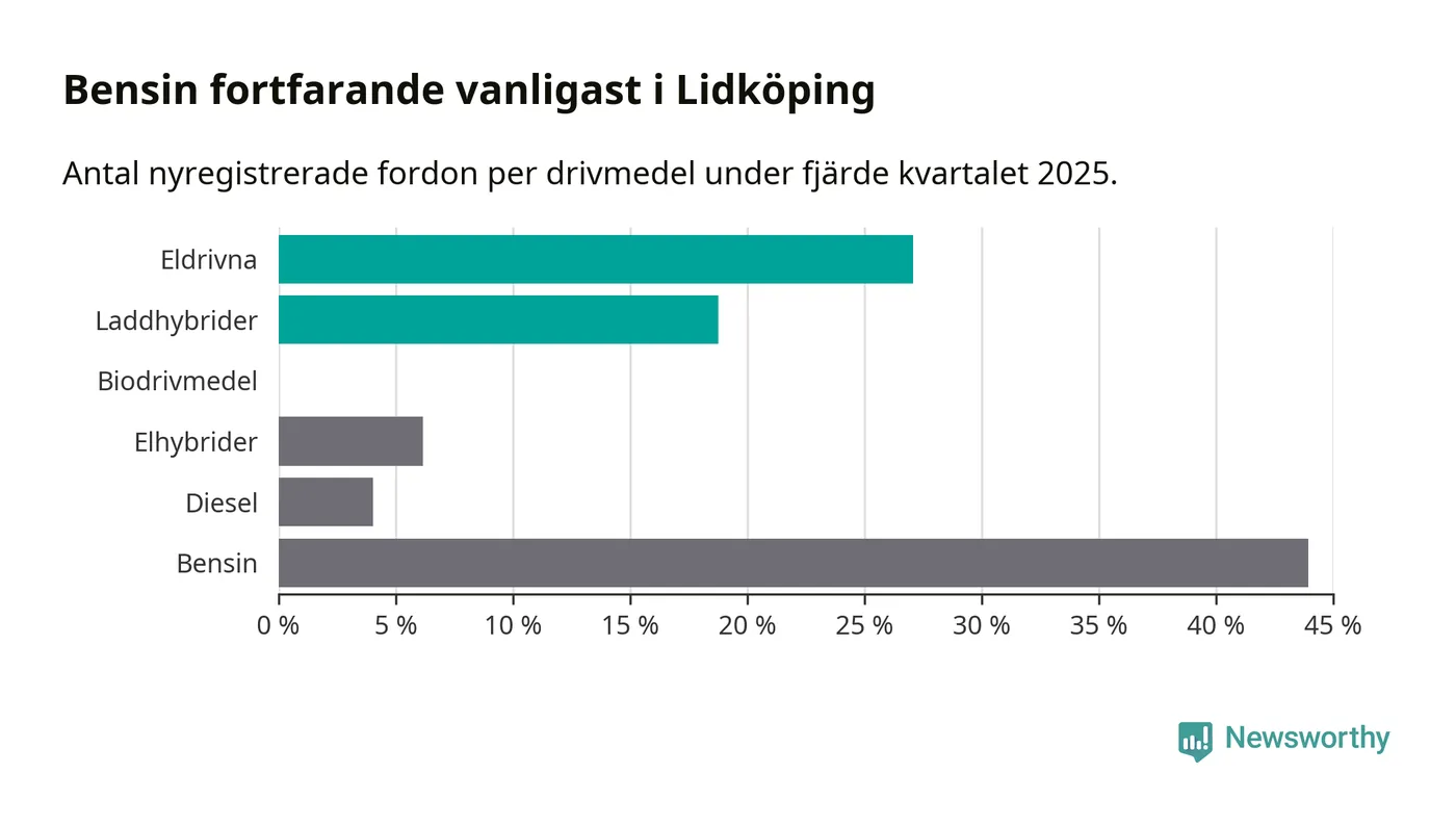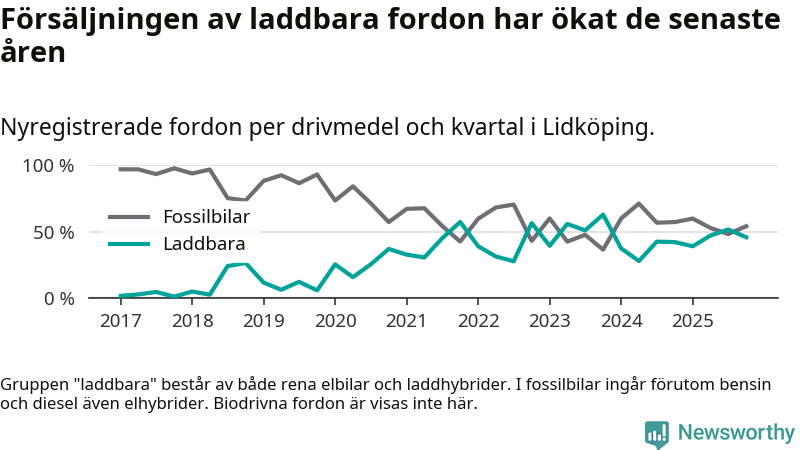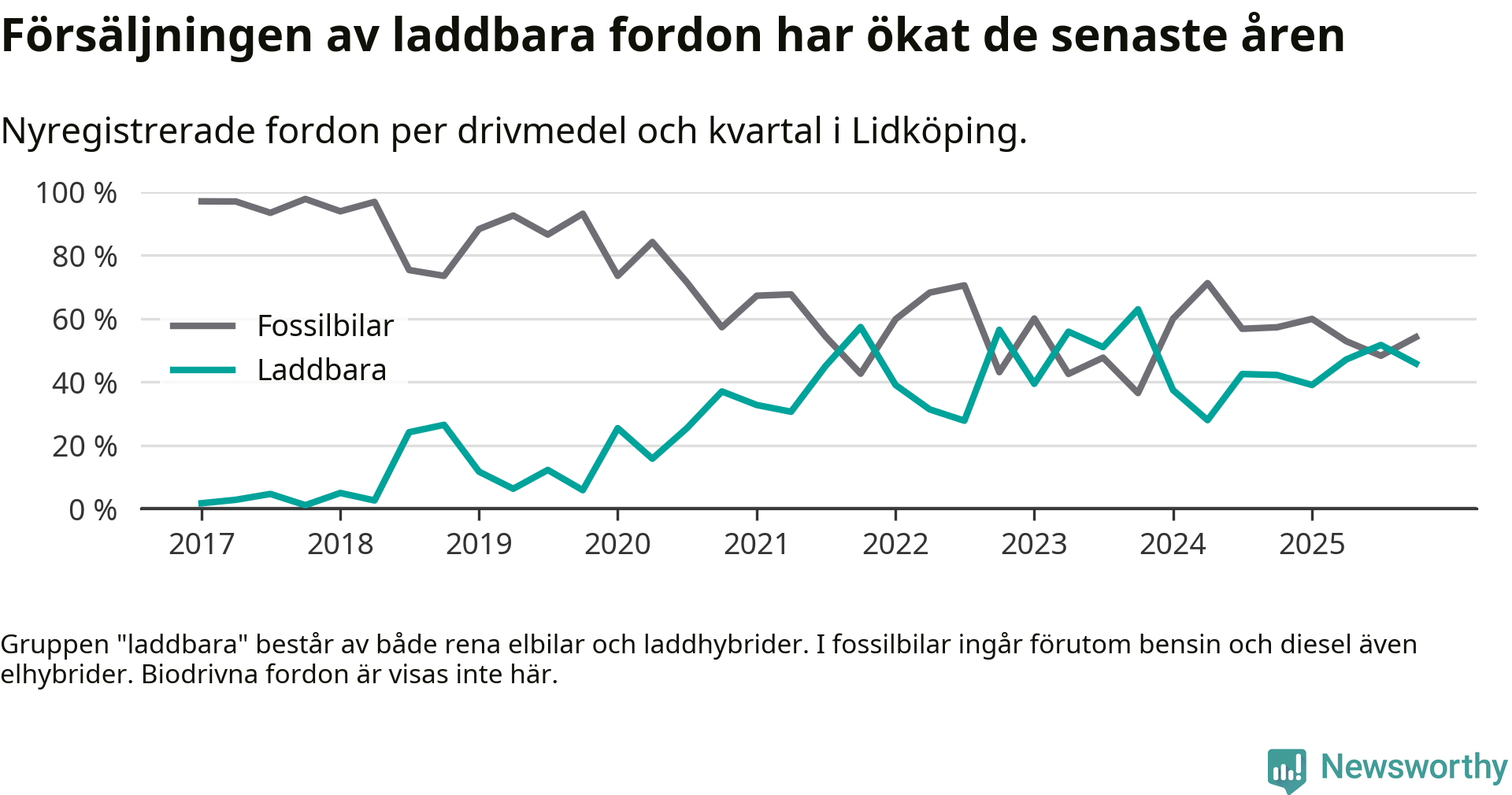 Under fjärde kvartalet 2025 var 46 procent av alla nyregistrerade personbilar i Lidköping laddbara (sammanlagt registrerades 421 nya bilar). Merparten av de laddbara bilarna var rena elbilar (27 procent av alla).