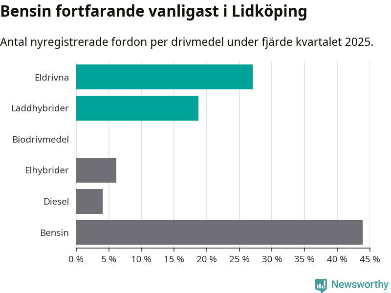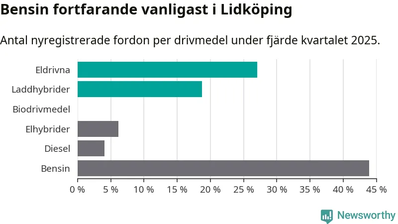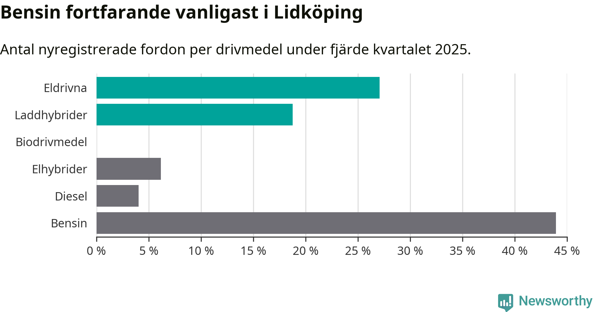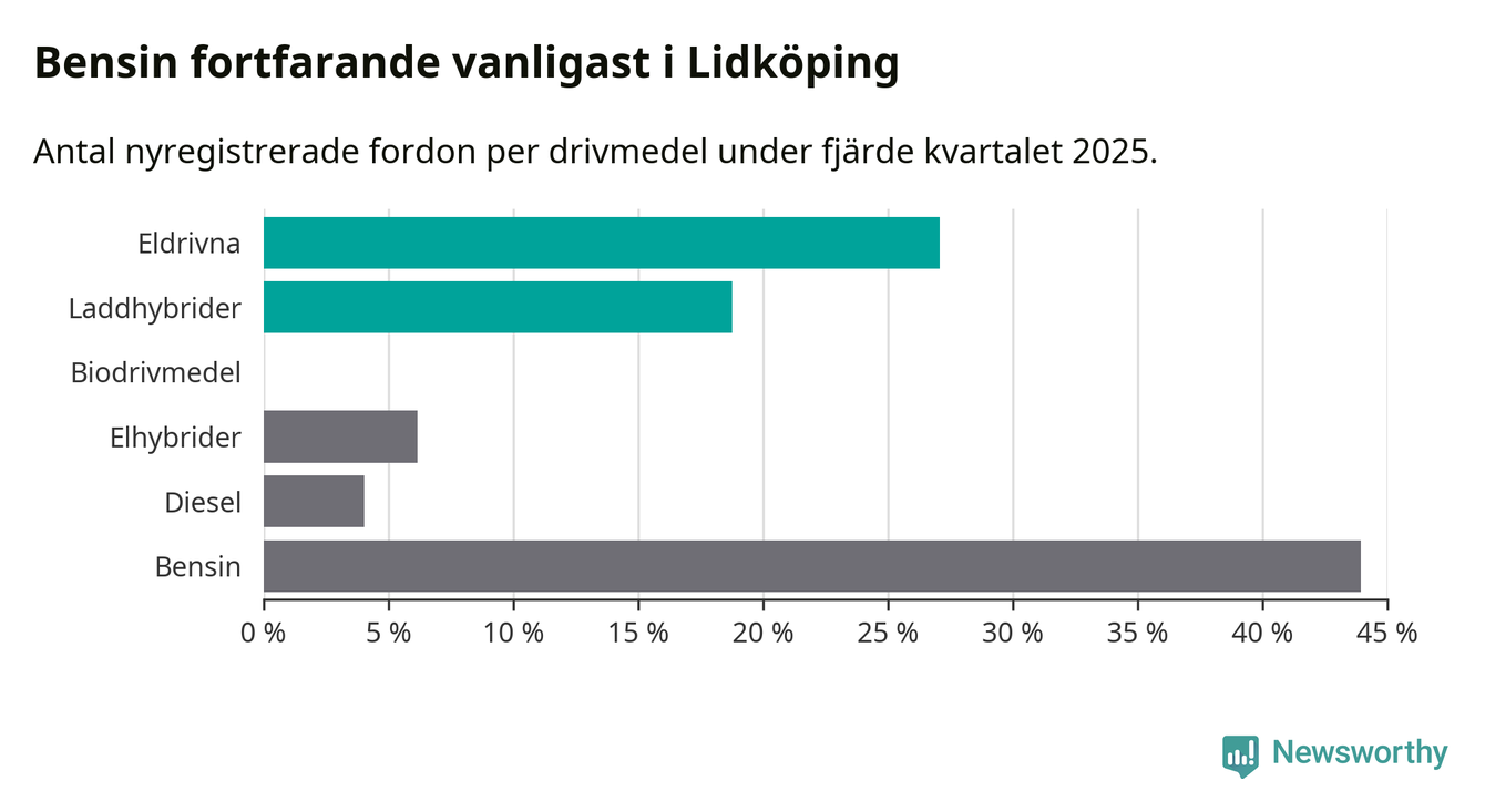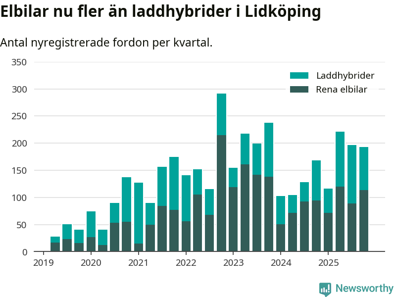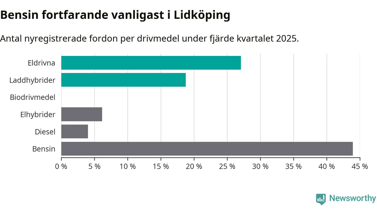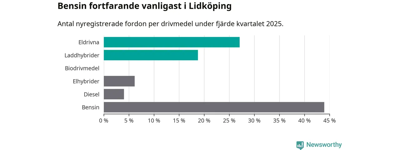Under fjärde kvartalet 2025 var 46 procent av alla nyregistrerade personbilar i Lidköping laddbara (sammanlagt registrerades 421 nya bilar). Merparten av de laddbara bilarna var rena elbilar (27 procent av alla).