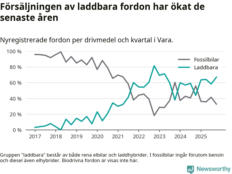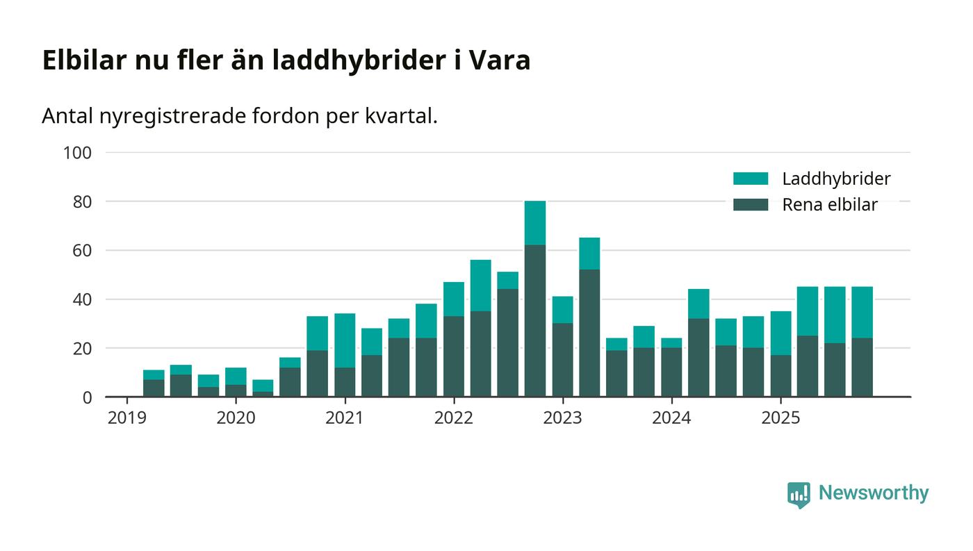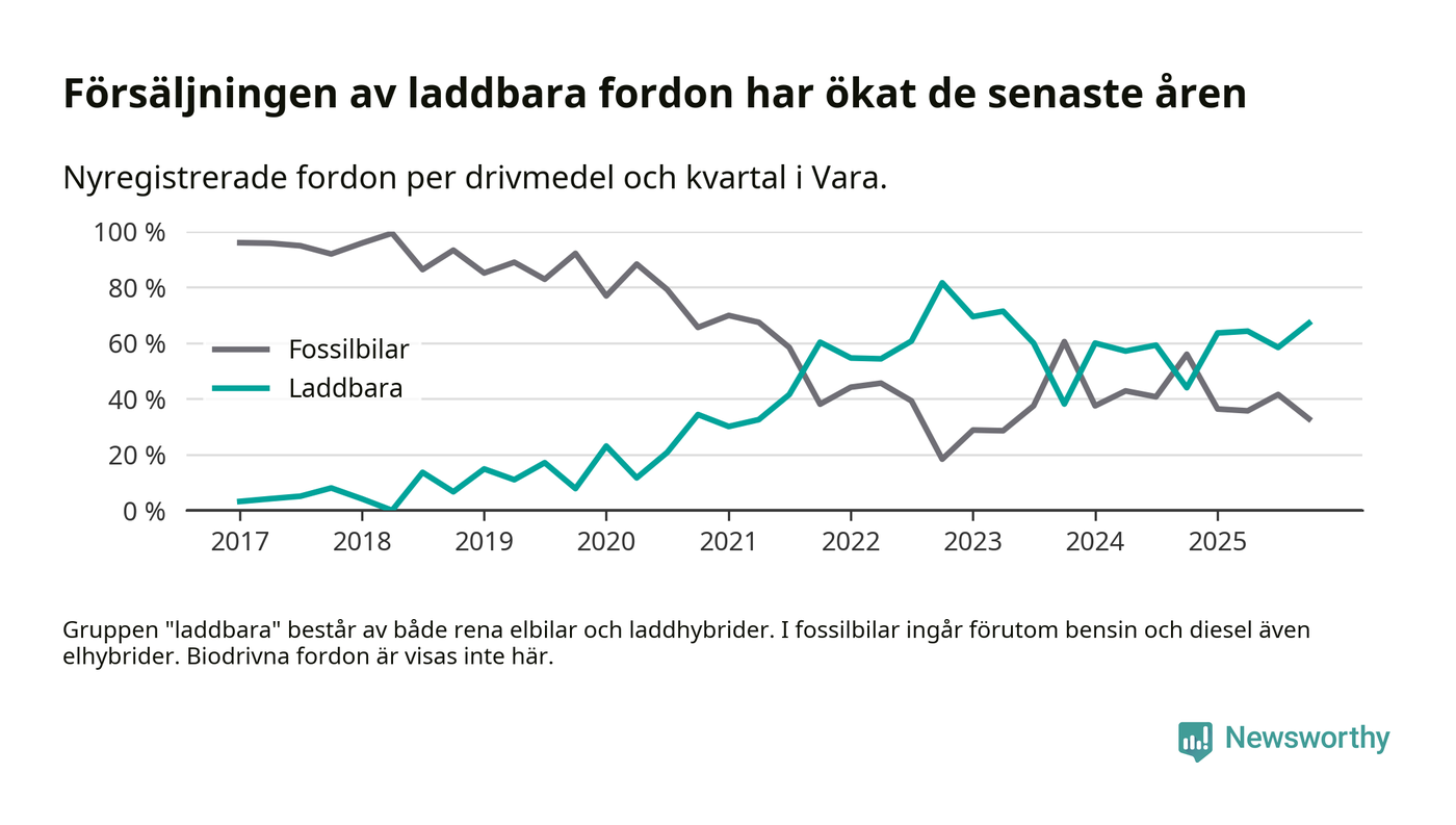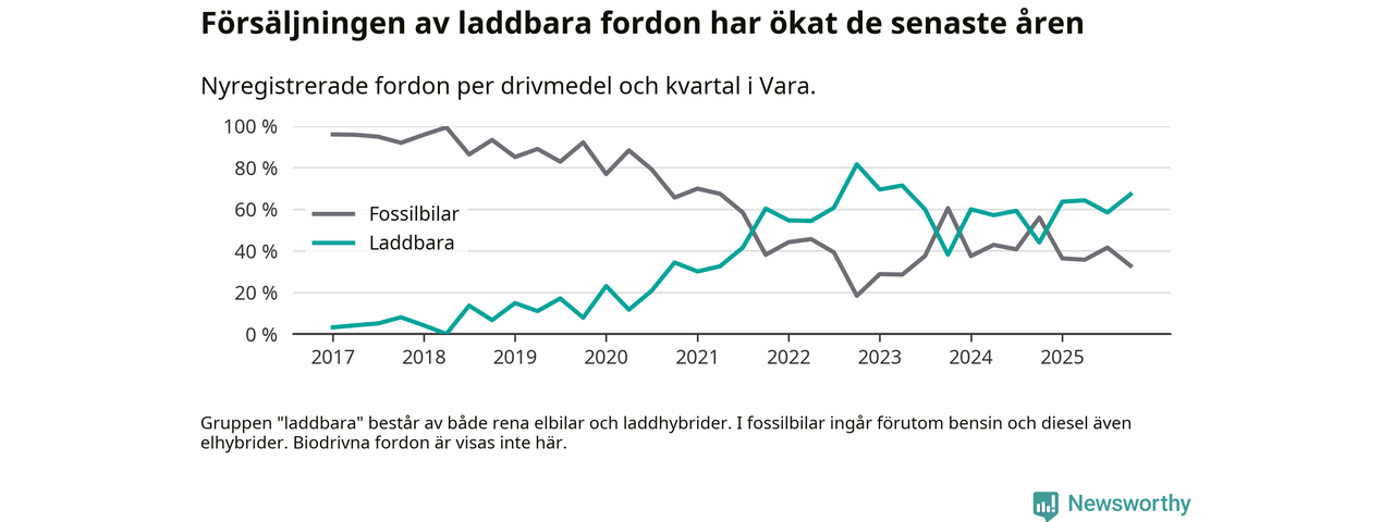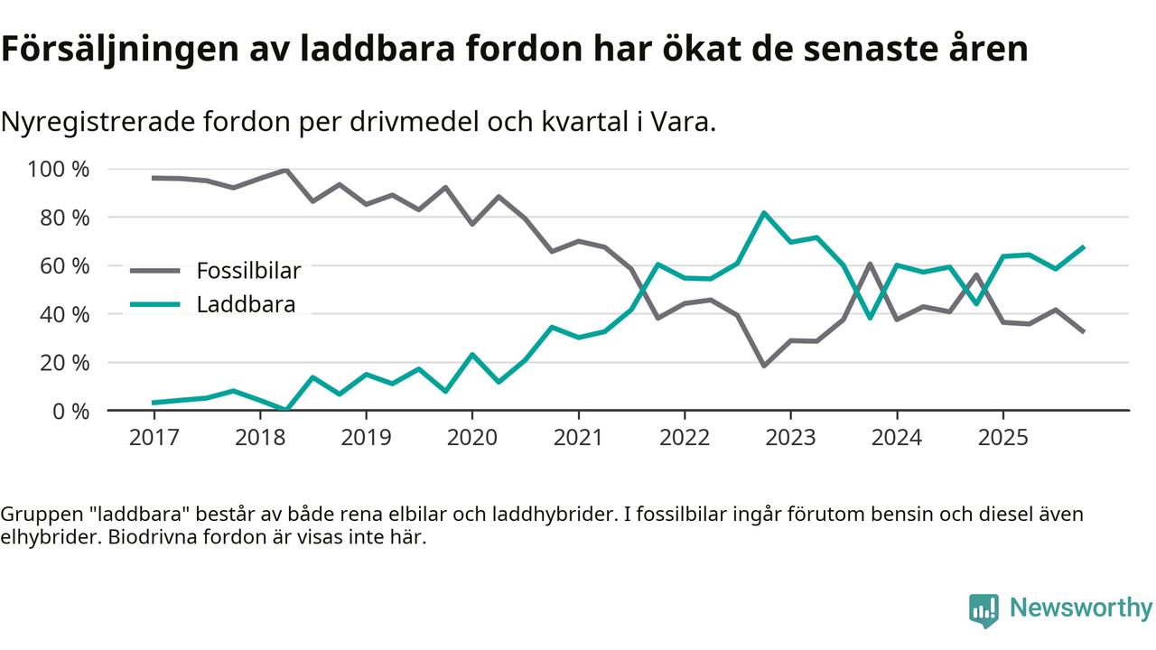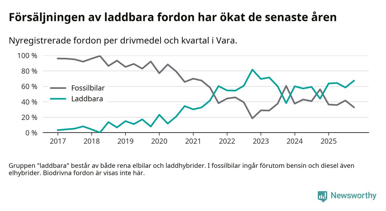 Under fjärde kvartalet 2025 var 67 procent av alla nyregistrerade personbilar i Vara laddbara (sammanlagt registrerades 67 nya bilar). Merparten av de laddbara bilarna var rena elbilar (36 procent av alla).