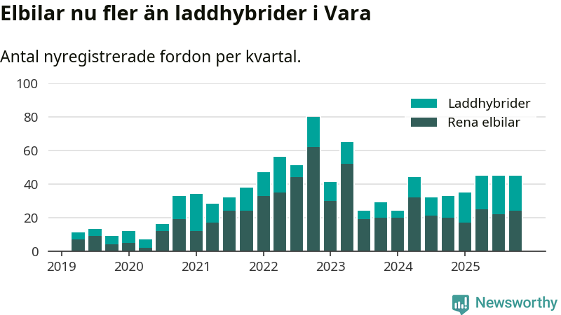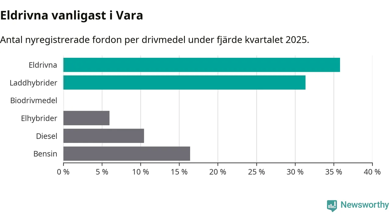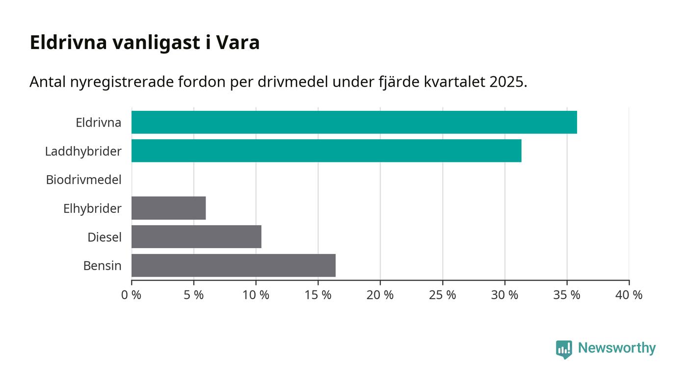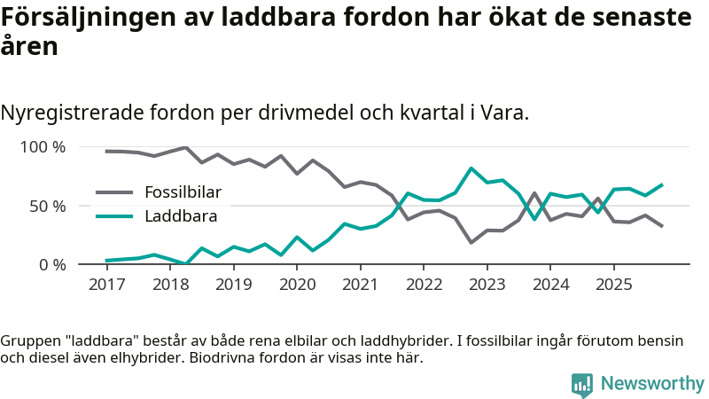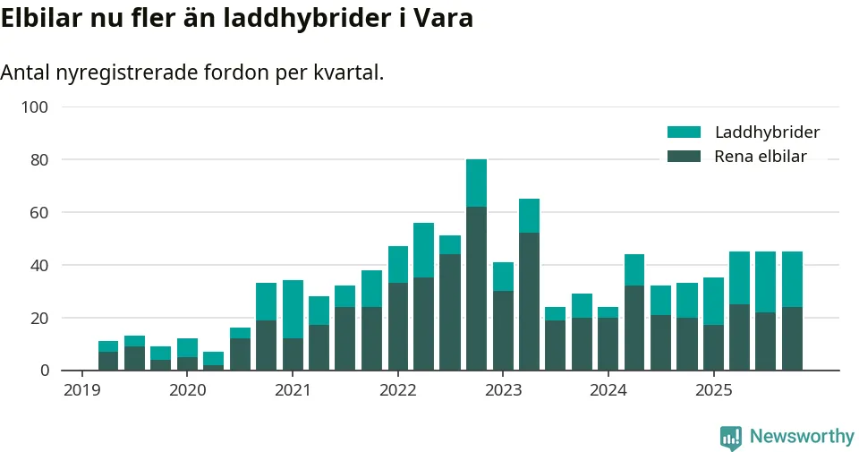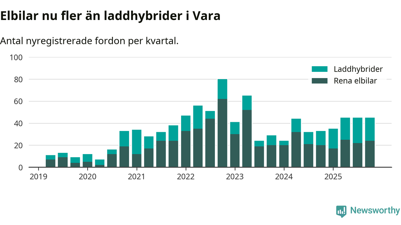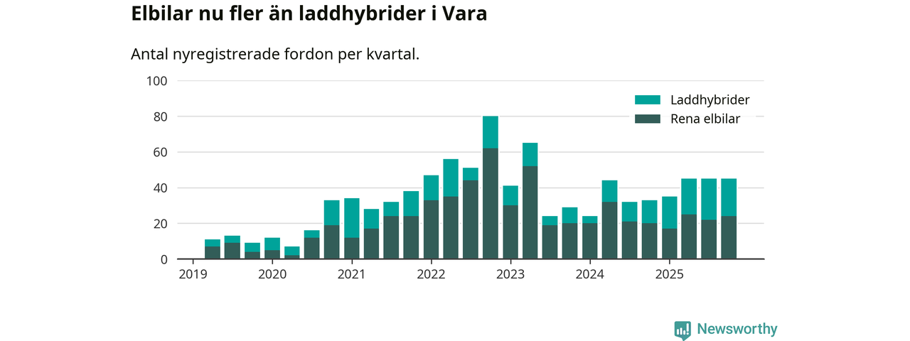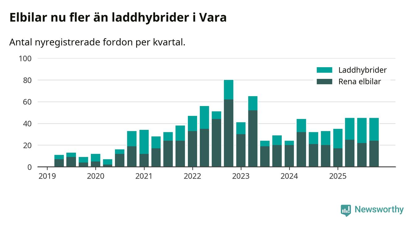 Under fjärde kvartalet 2025 var 67 procent av alla nyregistrerade personbilar i Vara laddbara (sammanlagt registrerades 67 nya bilar). Merparten av de laddbara bilarna var rena elbilar (36 procent av alla).
