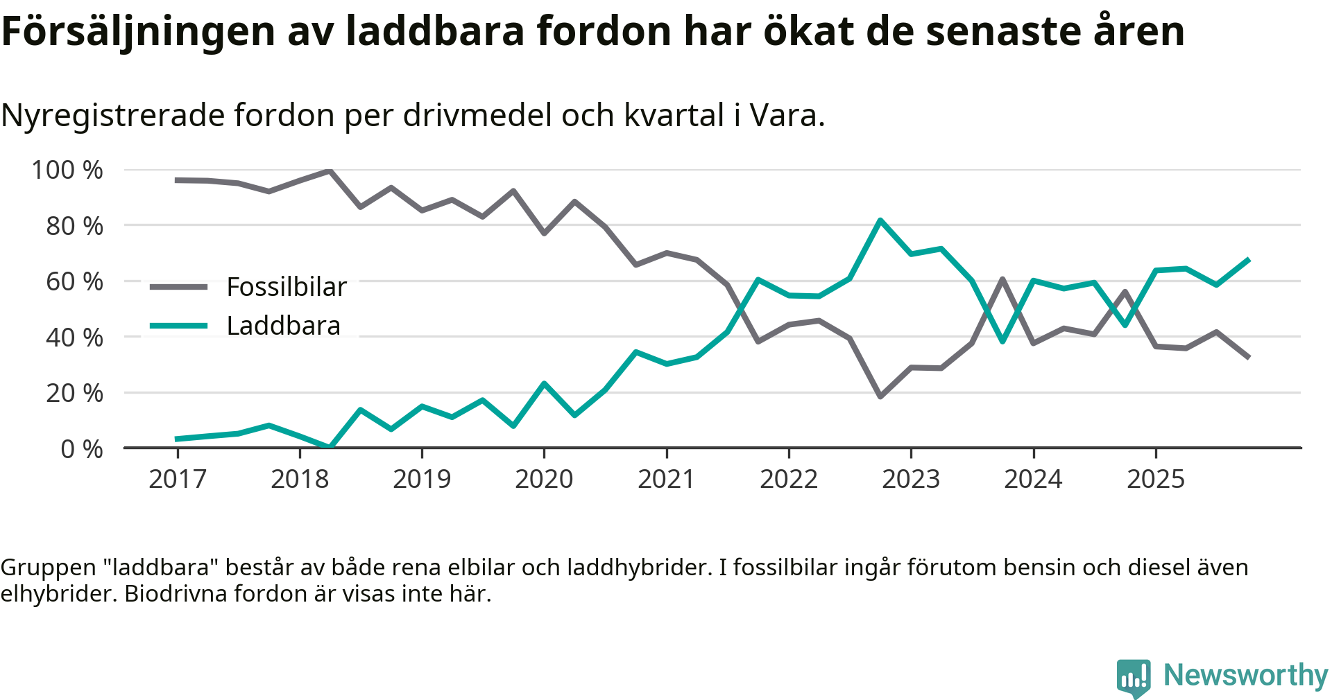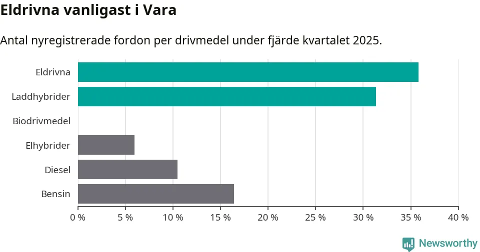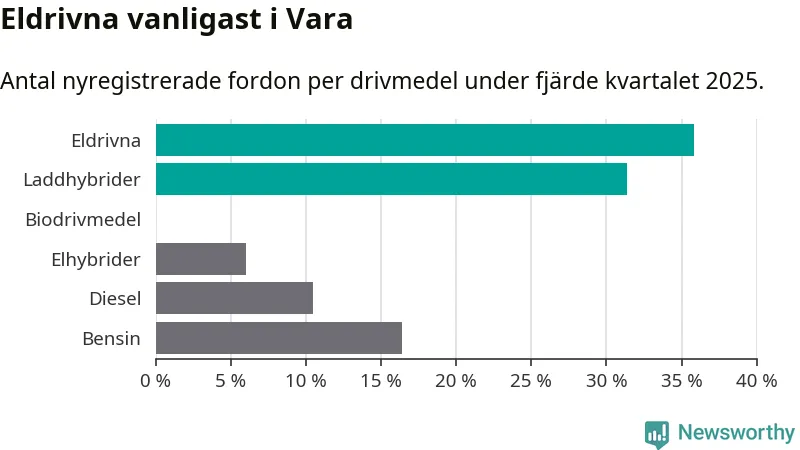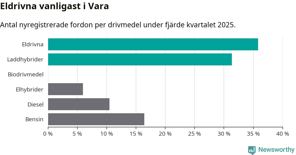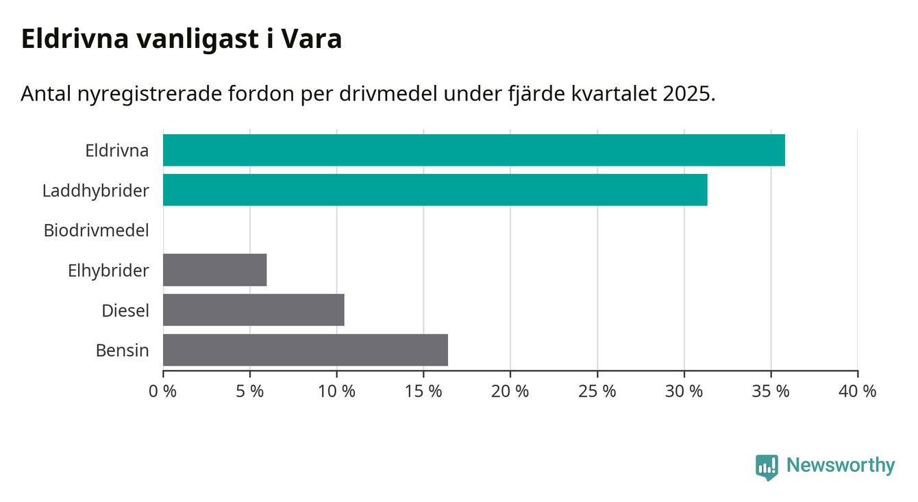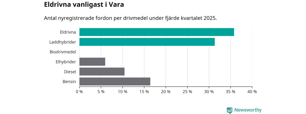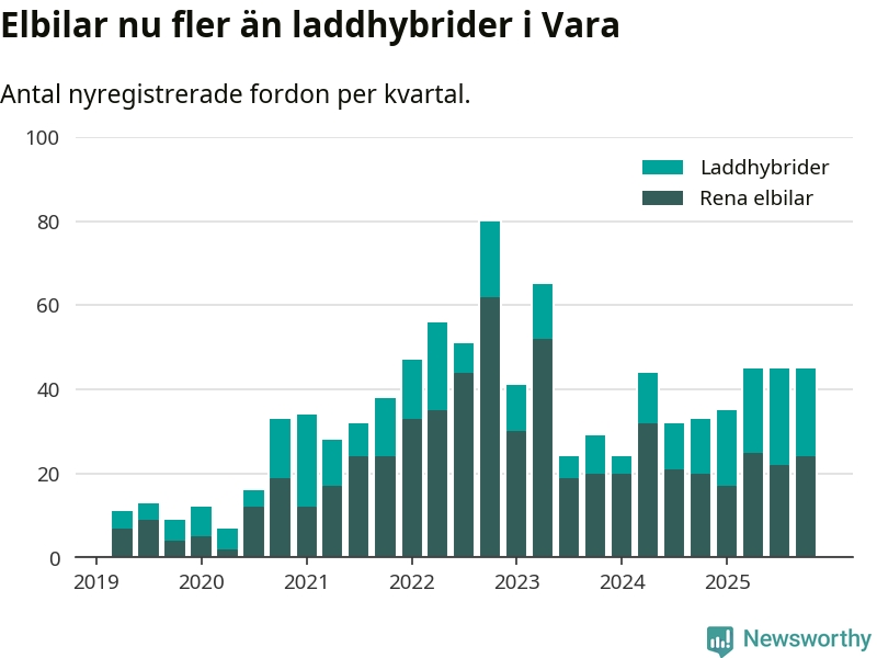 Under fjärde kvartalet 2025 var 67 procent av alla nyregistrerade personbilar i Vara laddbara (sammanlagt registrerades 67 nya bilar). Merparten av de laddbara bilarna var rena elbilar (36 procent av alla).