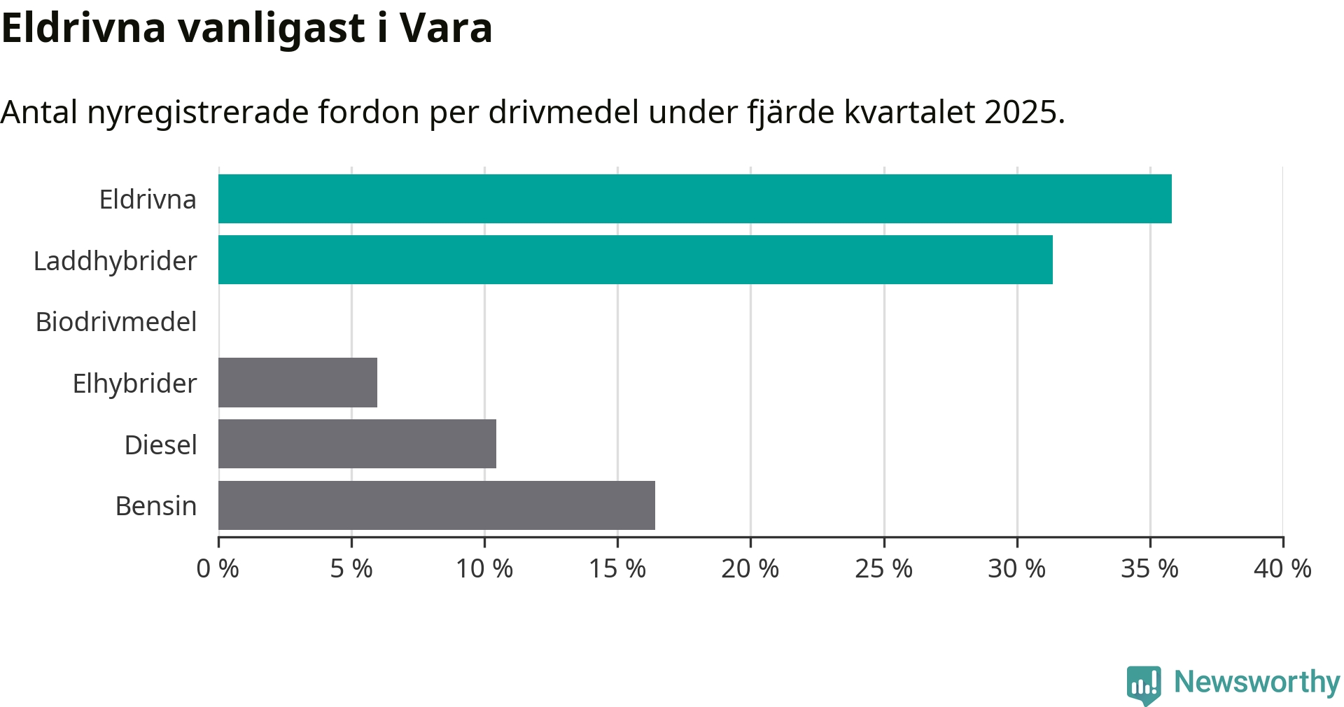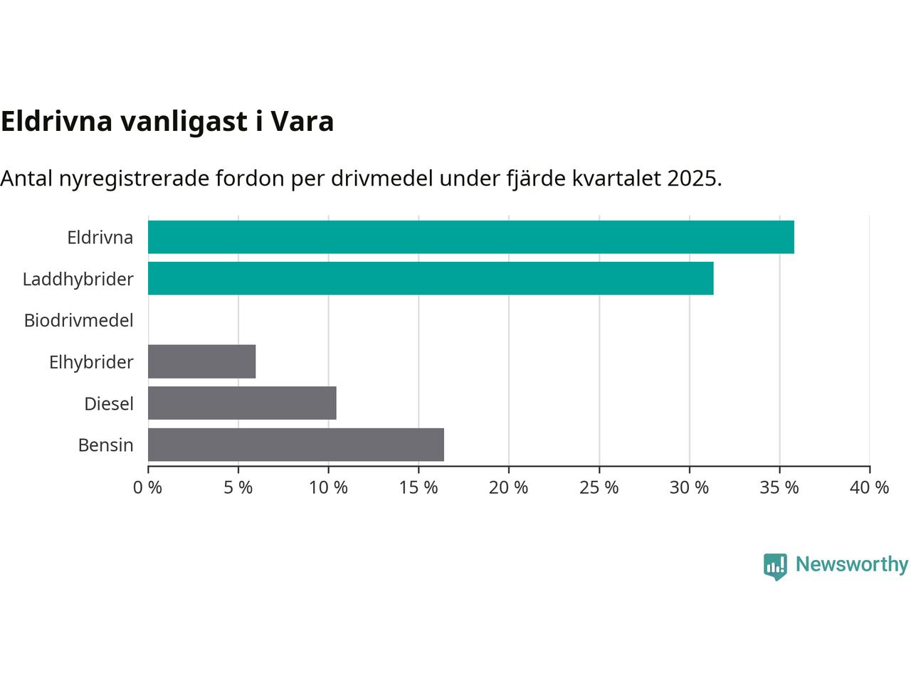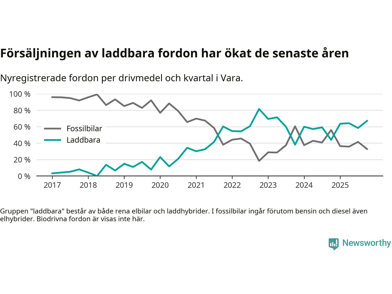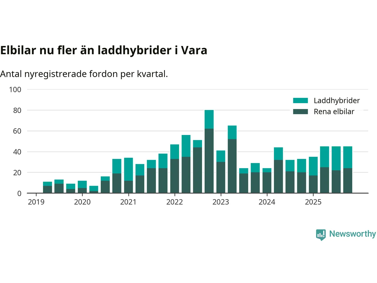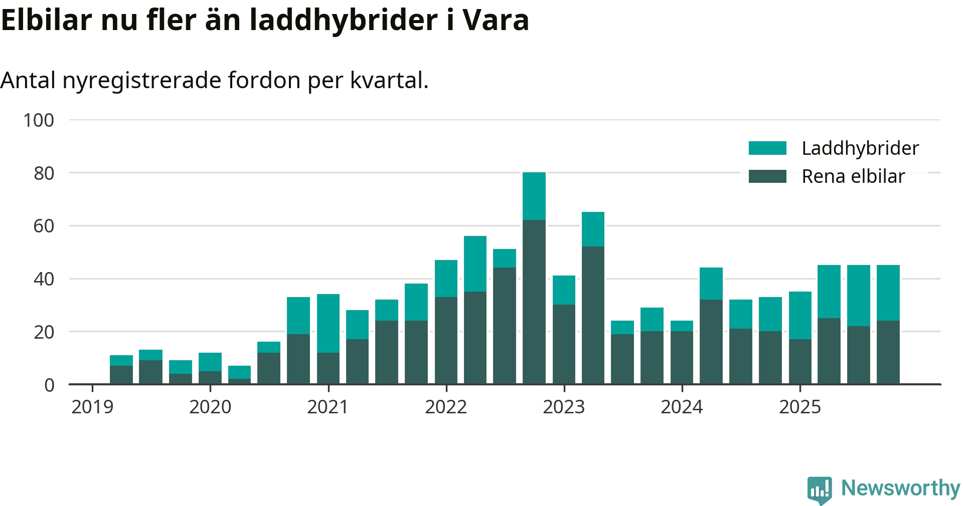 Under fjärde kvartalet 2025 var 67 procent av alla nyregistrerade personbilar i Vara laddbara (sammanlagt registrerades 67 nya bilar). Merparten av de laddbara bilarna var rena elbilar (36 procent av alla).