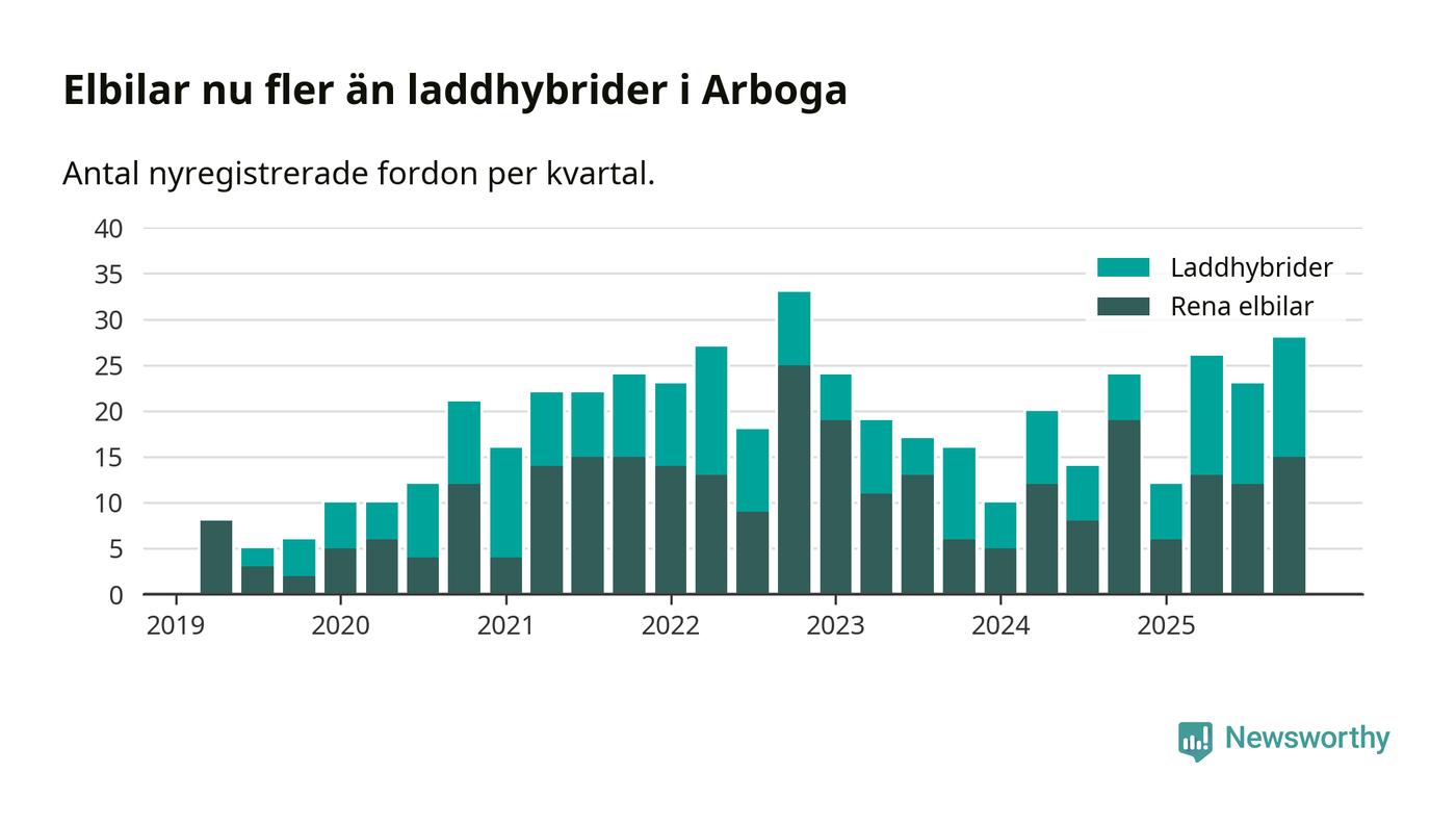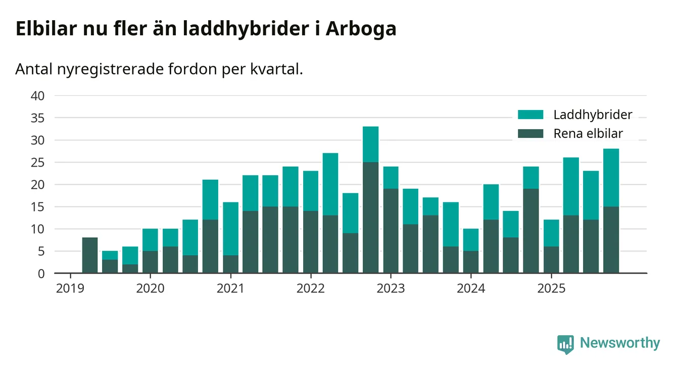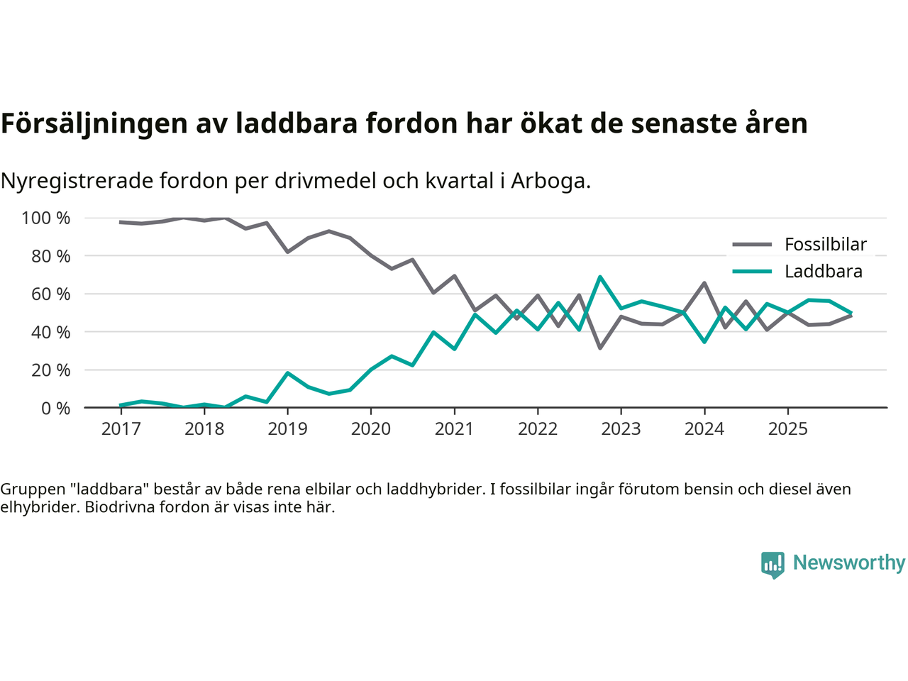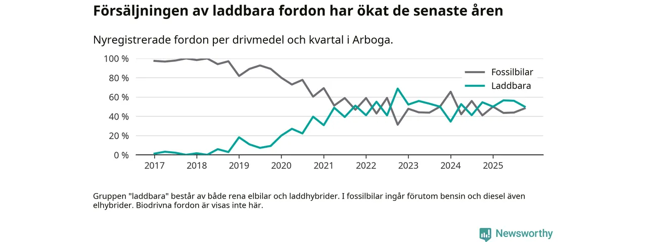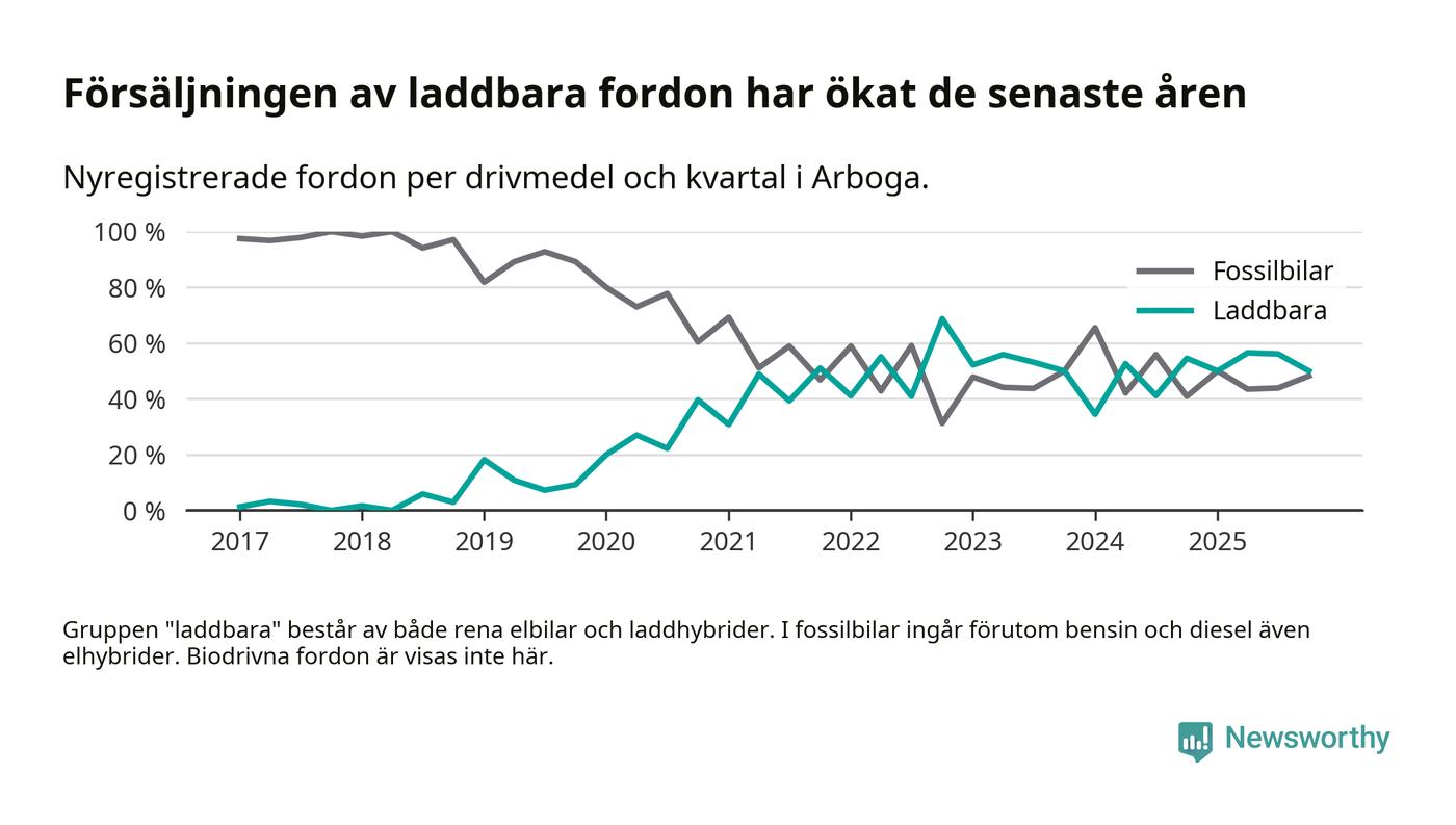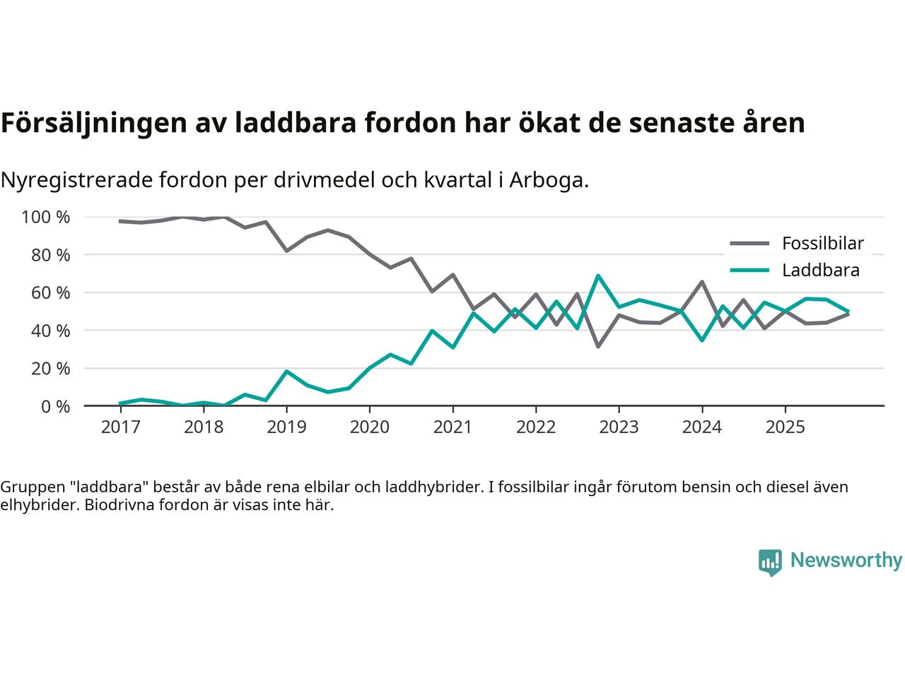 Under fjärde kvartalet 2025 var 50 procent av alla nyregistrerade personbilar i Arboga laddbara (sammanlagt registrerades 56 nya bilar). Merparten av de laddbara bilarna var rena elbilar (27 procent av alla).