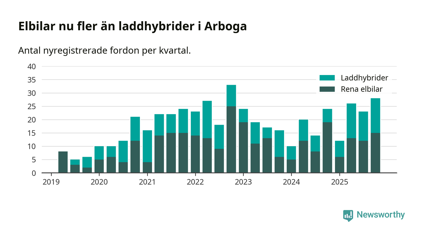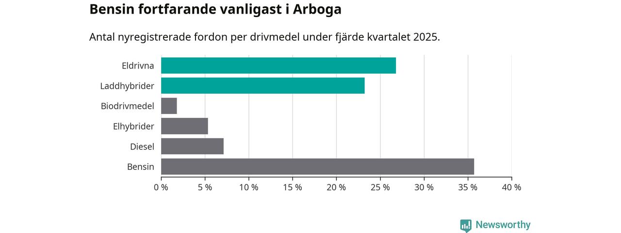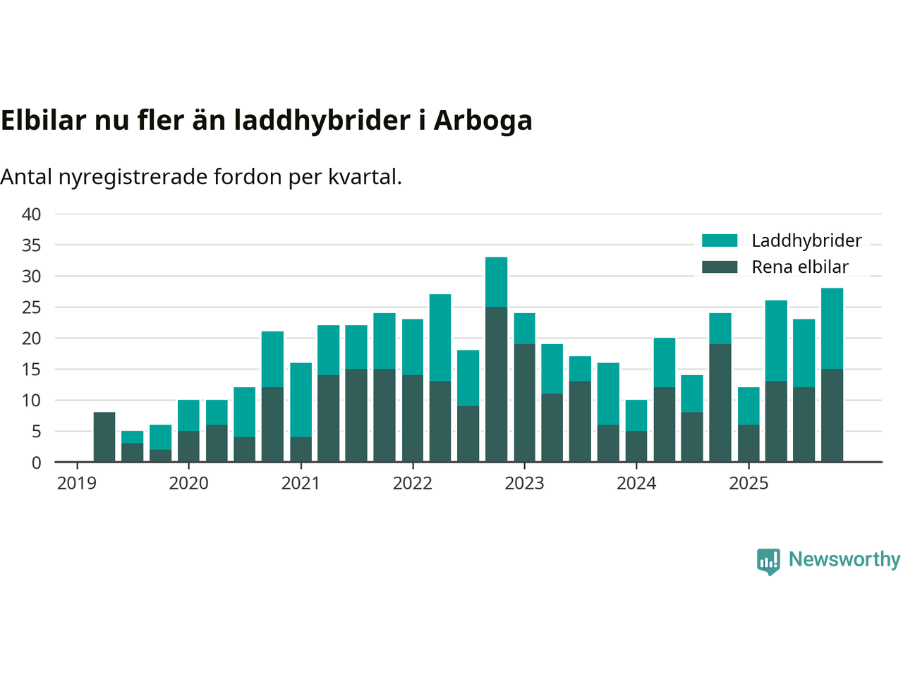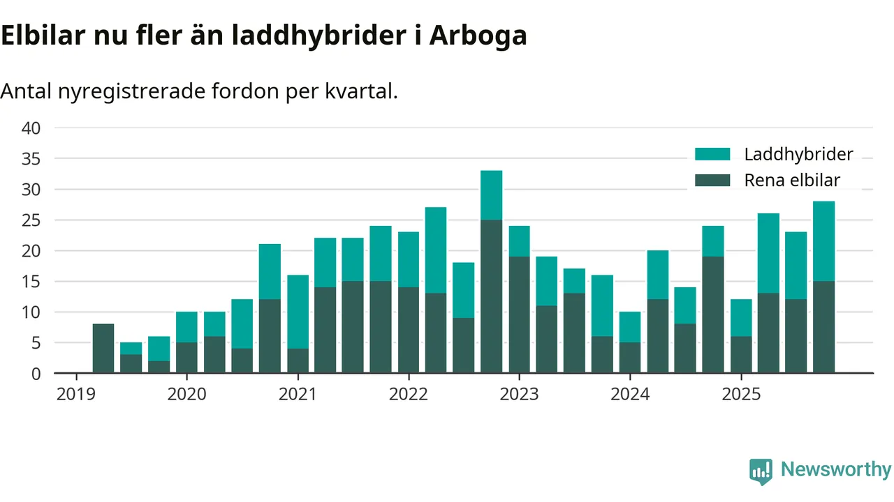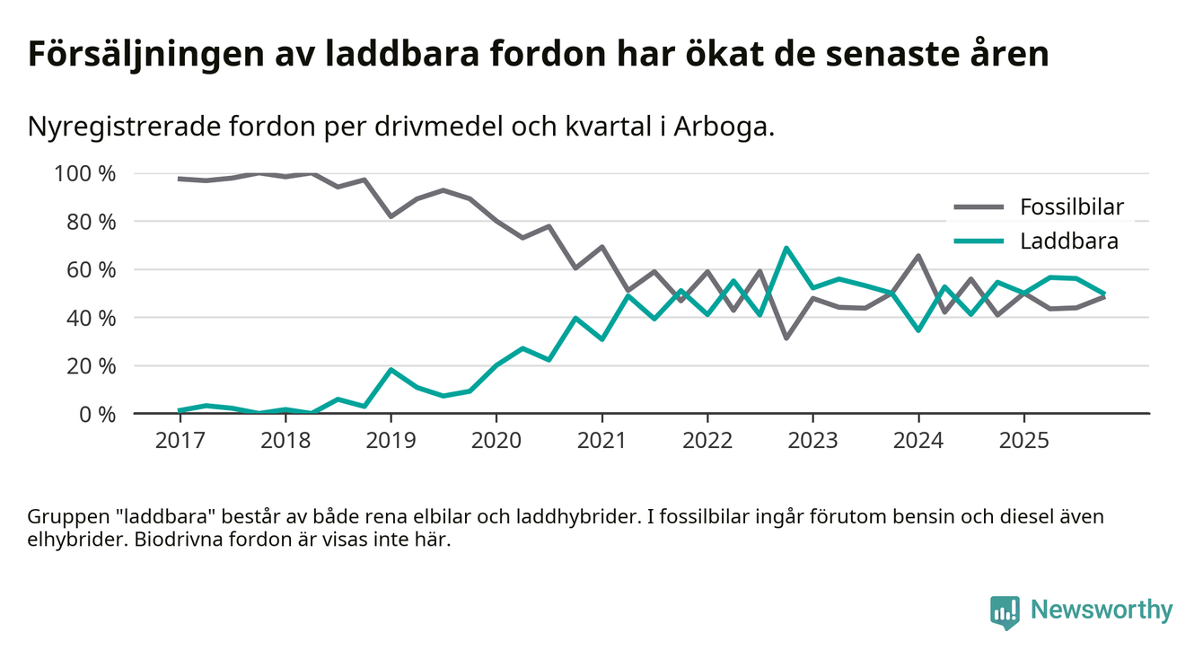 Under fjärde kvartalet 2025 var 50 procent av alla nyregistrerade personbilar i Arboga laddbara (sammanlagt registrerades 56 nya bilar). Merparten av de laddbara bilarna var rena elbilar (27 procent av alla).