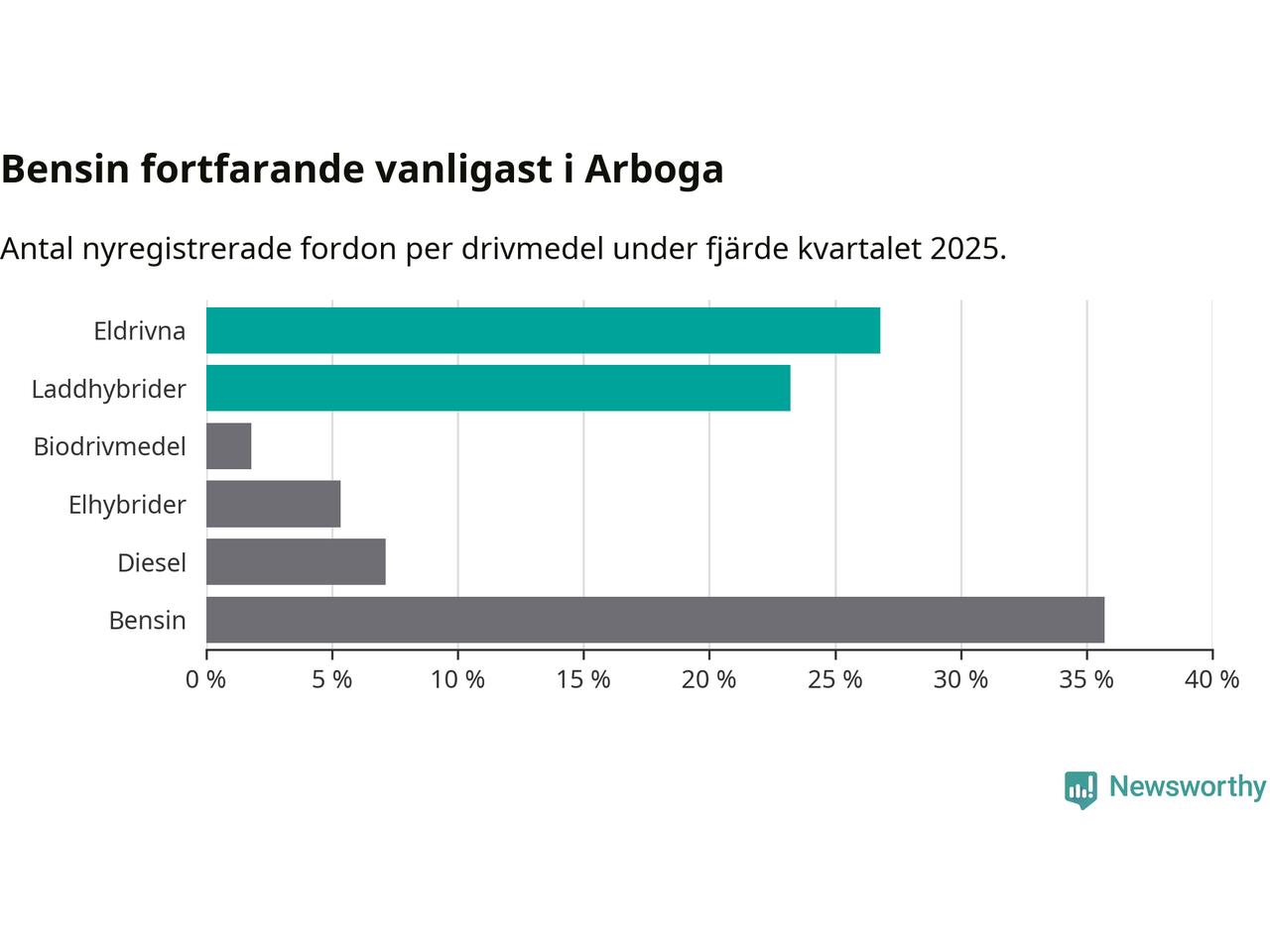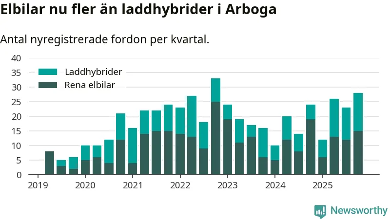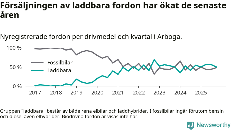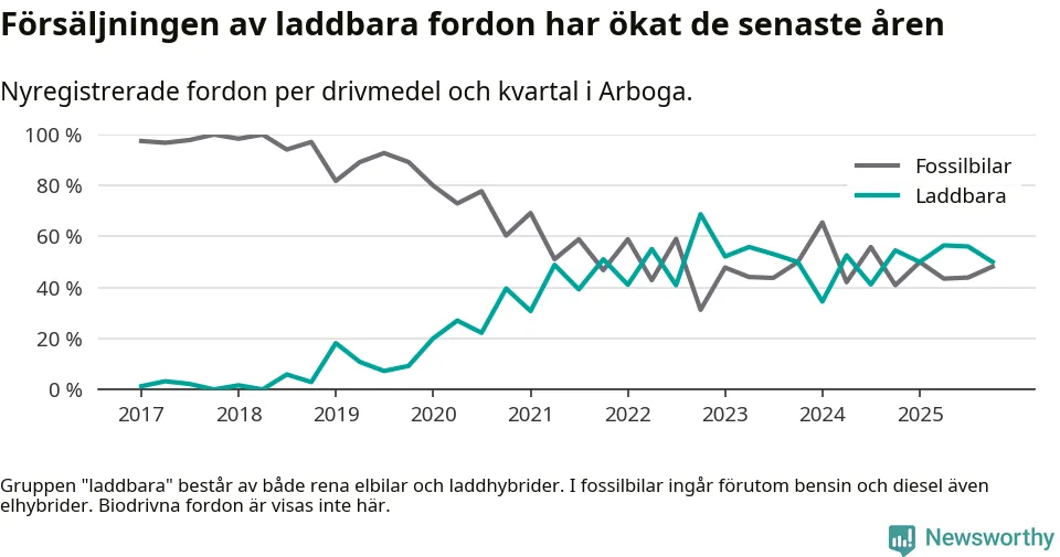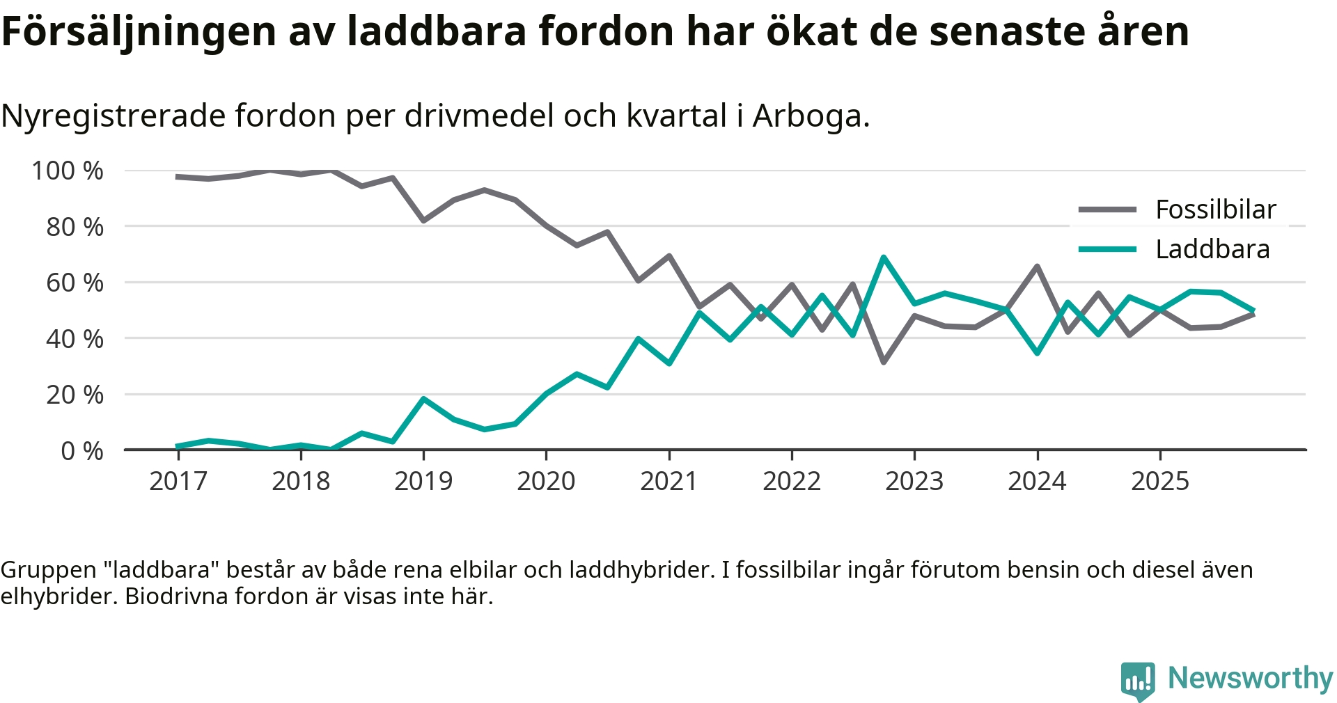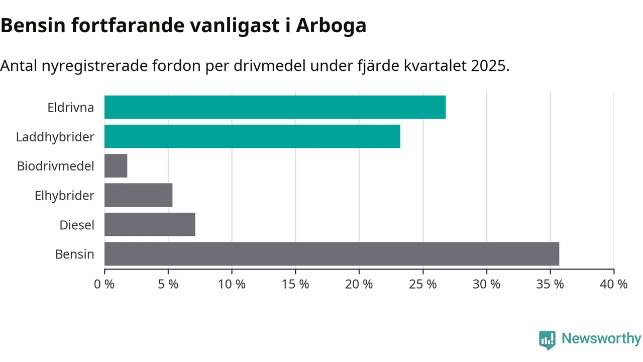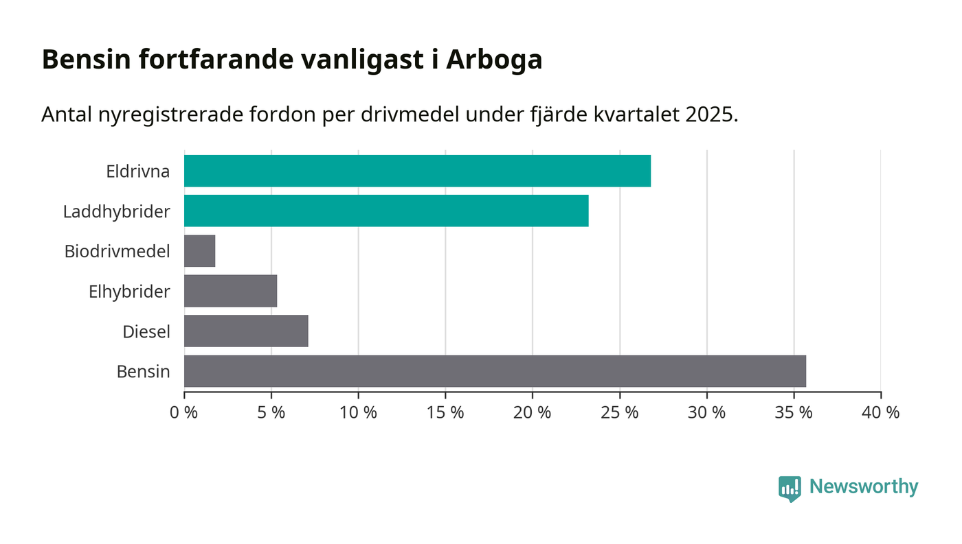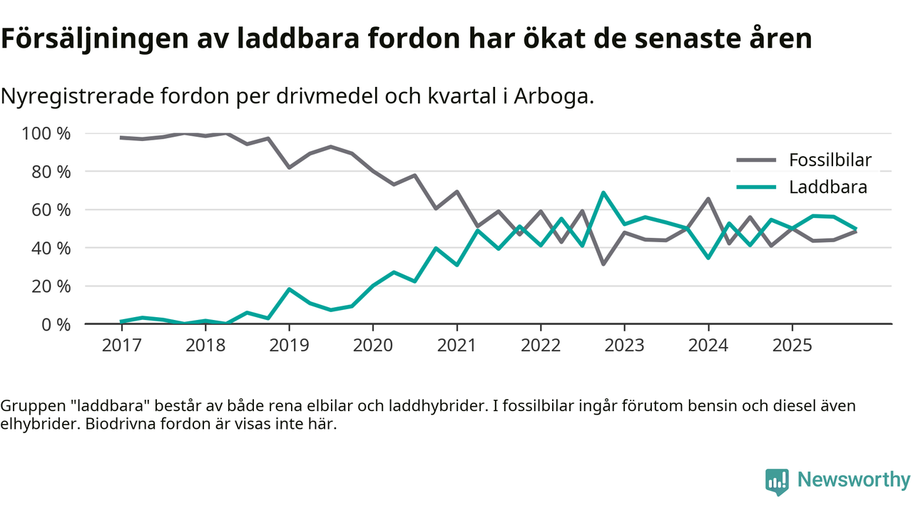 Under fjärde kvartalet 2025 var 50 procent av alla nyregistrerade personbilar i Arboga laddbara (sammanlagt registrerades 56 nya bilar). Merparten av de laddbara bilarna var rena elbilar (27 procent av alla).