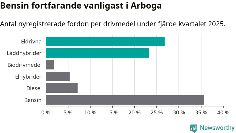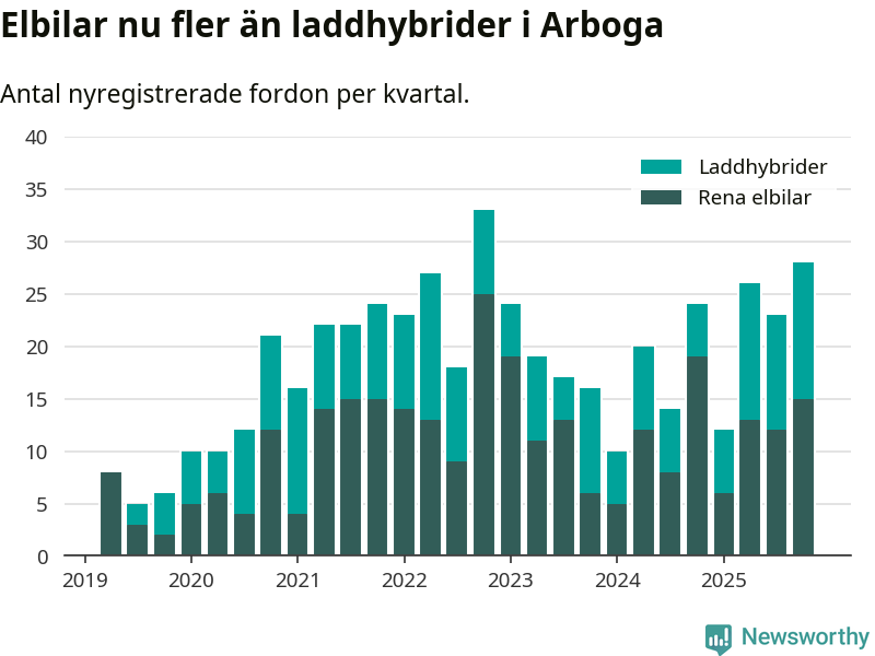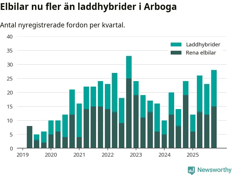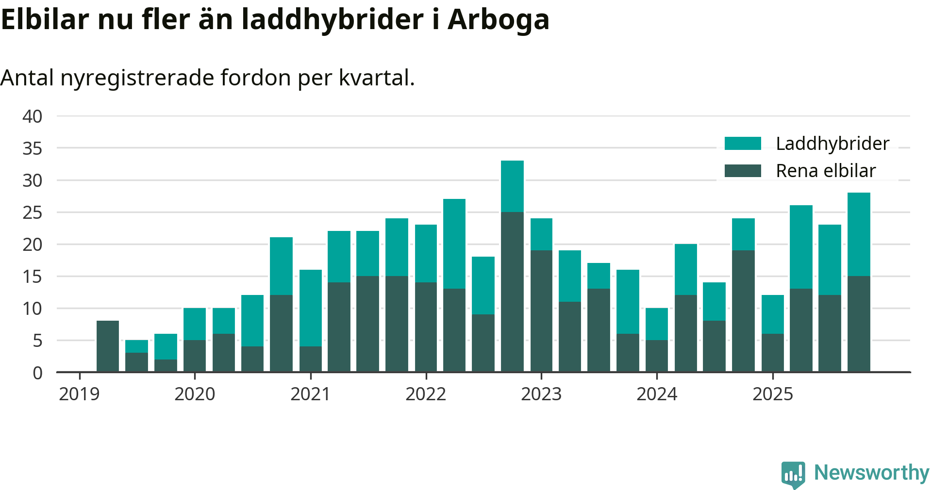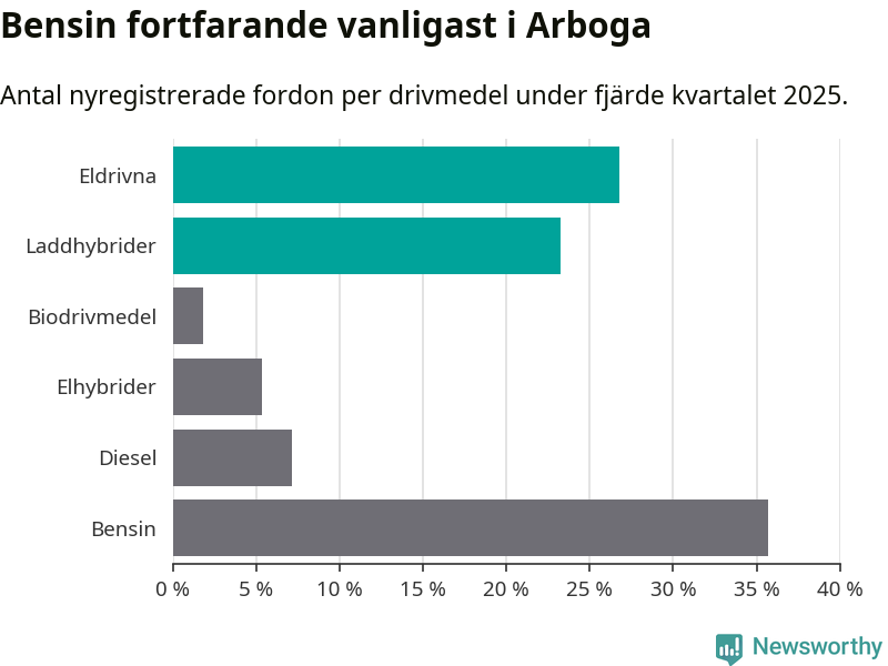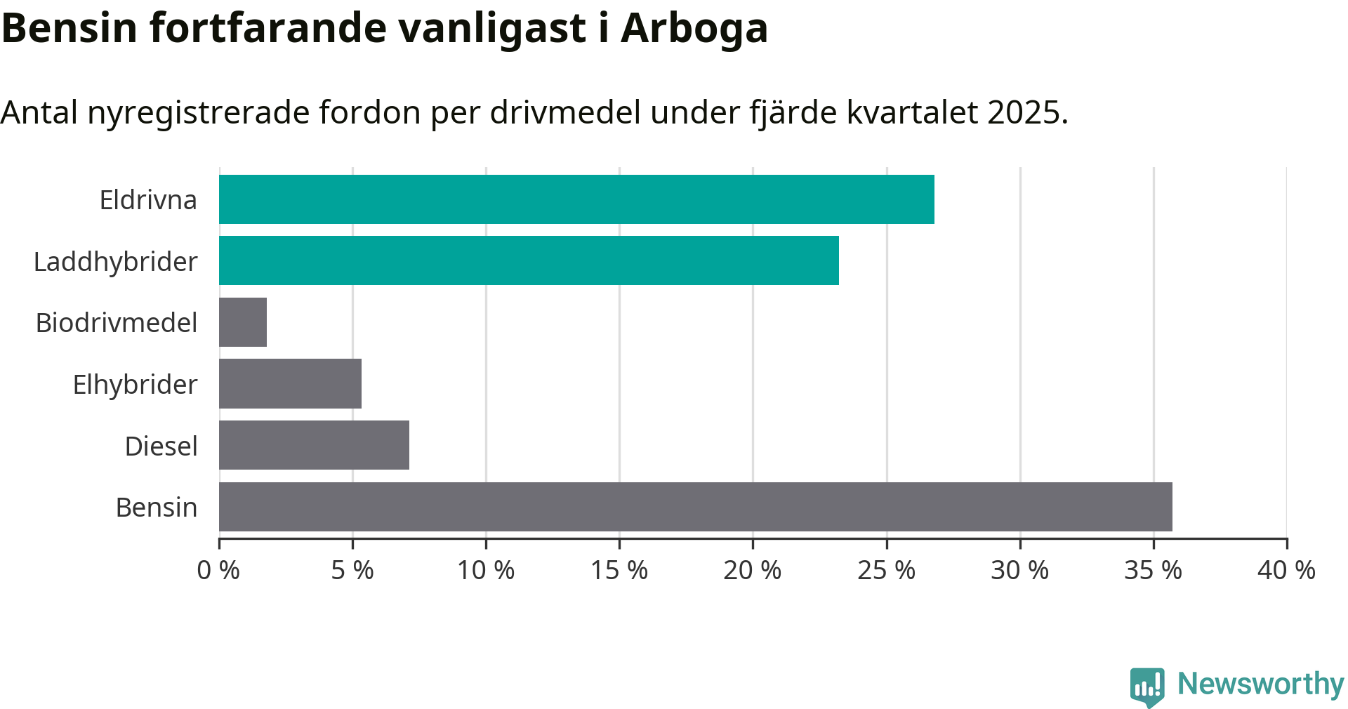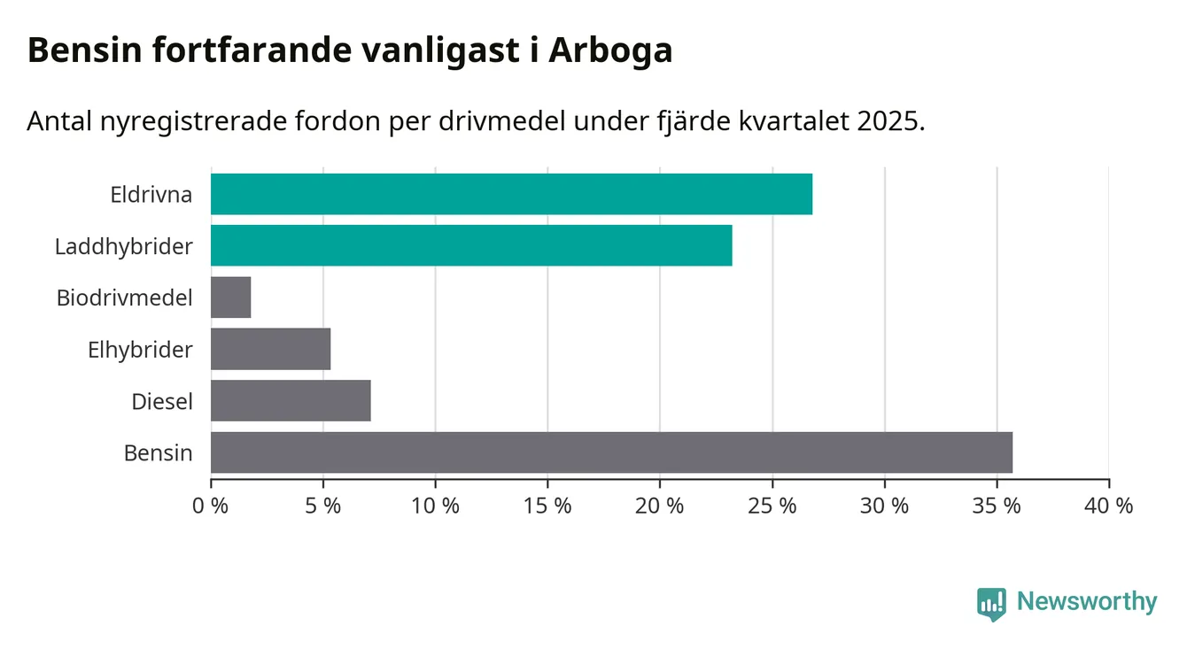 Under fjärde kvartalet 2025 var 50 procent av alla nyregistrerade personbilar i Arboga laddbara (sammanlagt registrerades 56 nya bilar). Merparten av de laddbara bilarna var rena elbilar (27 procent av alla).