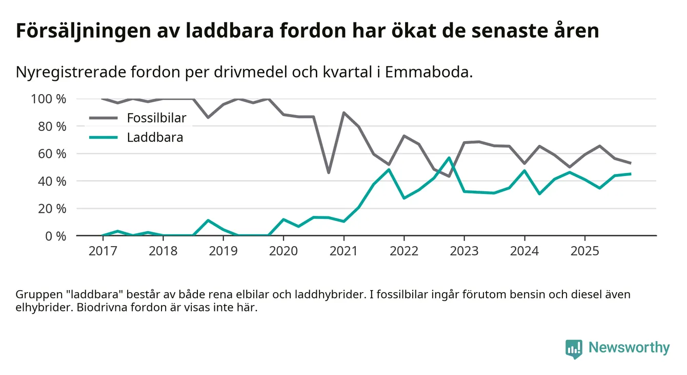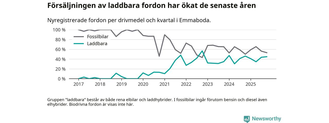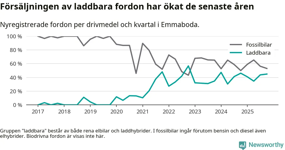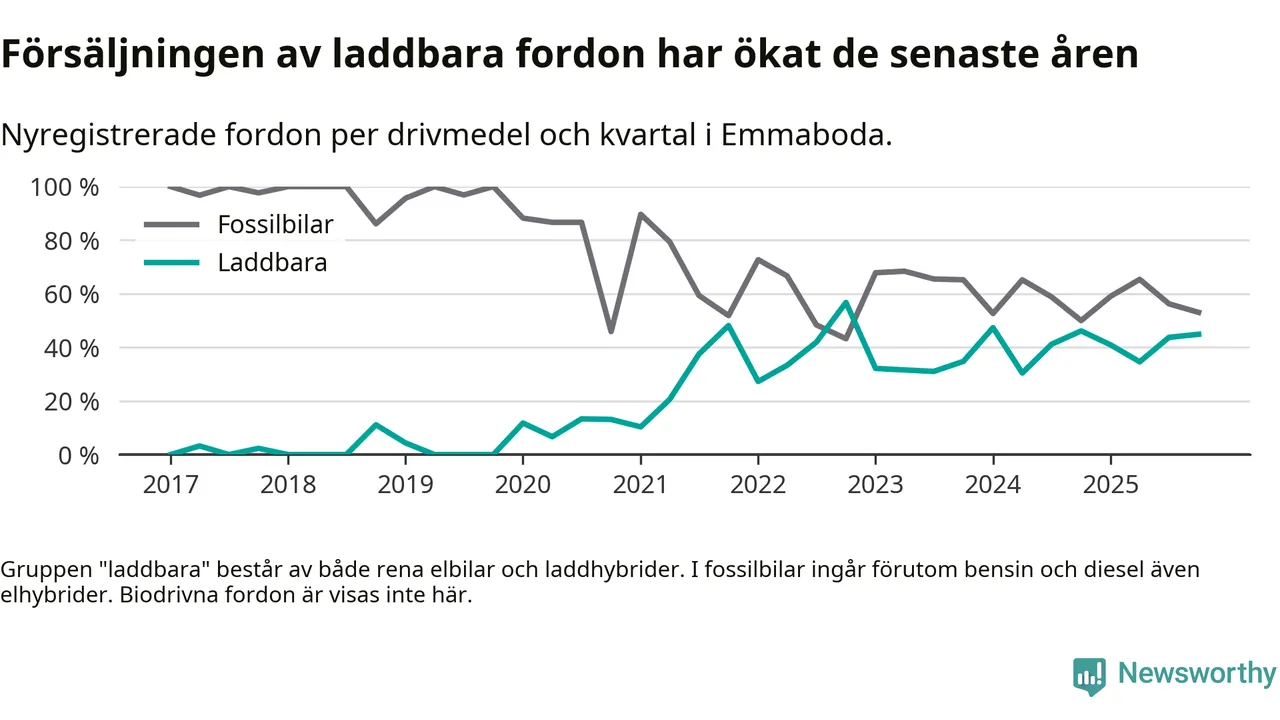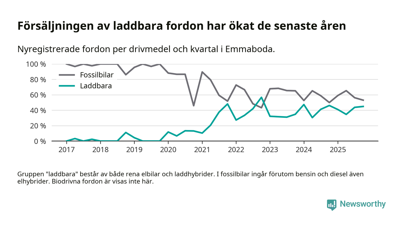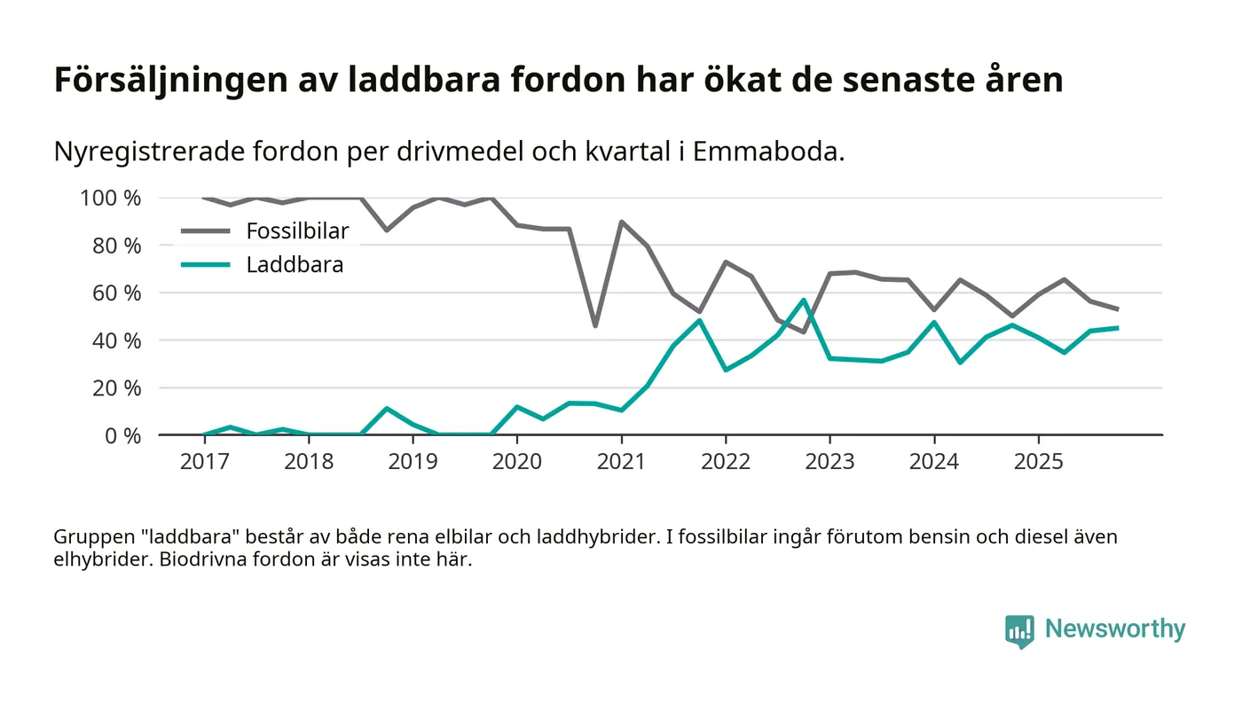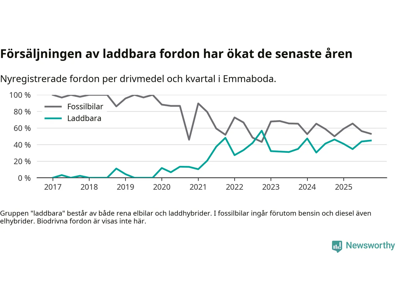 Under fjärde kvartalet 2025 var 45 procent av alla nyregistrerade personbilar i Emmaboda laddbara (sammanlagt registrerades 49 nya bilar). Merparten av de laddbara bilarna var rena elbilar (33 procent av alla).