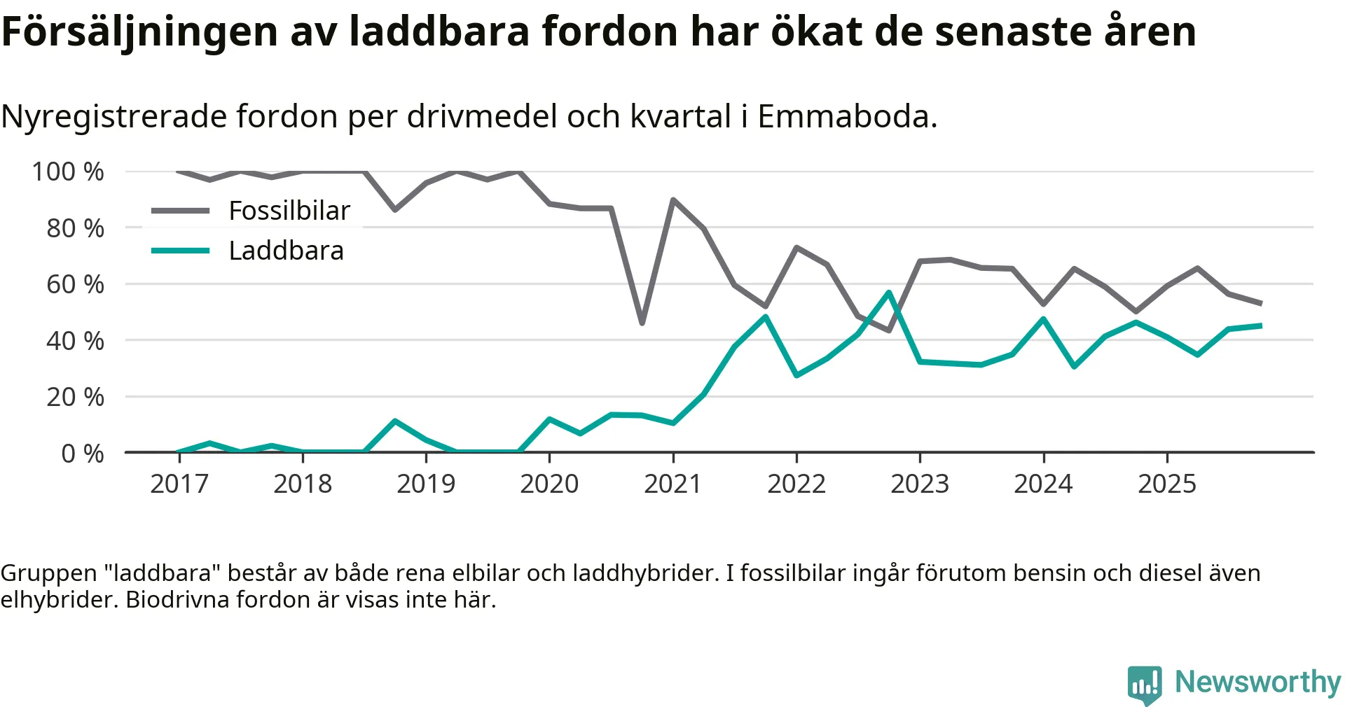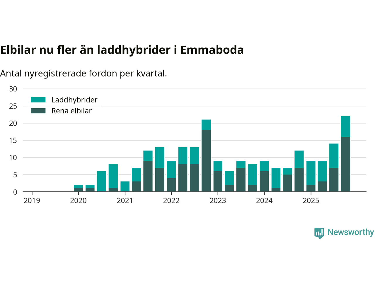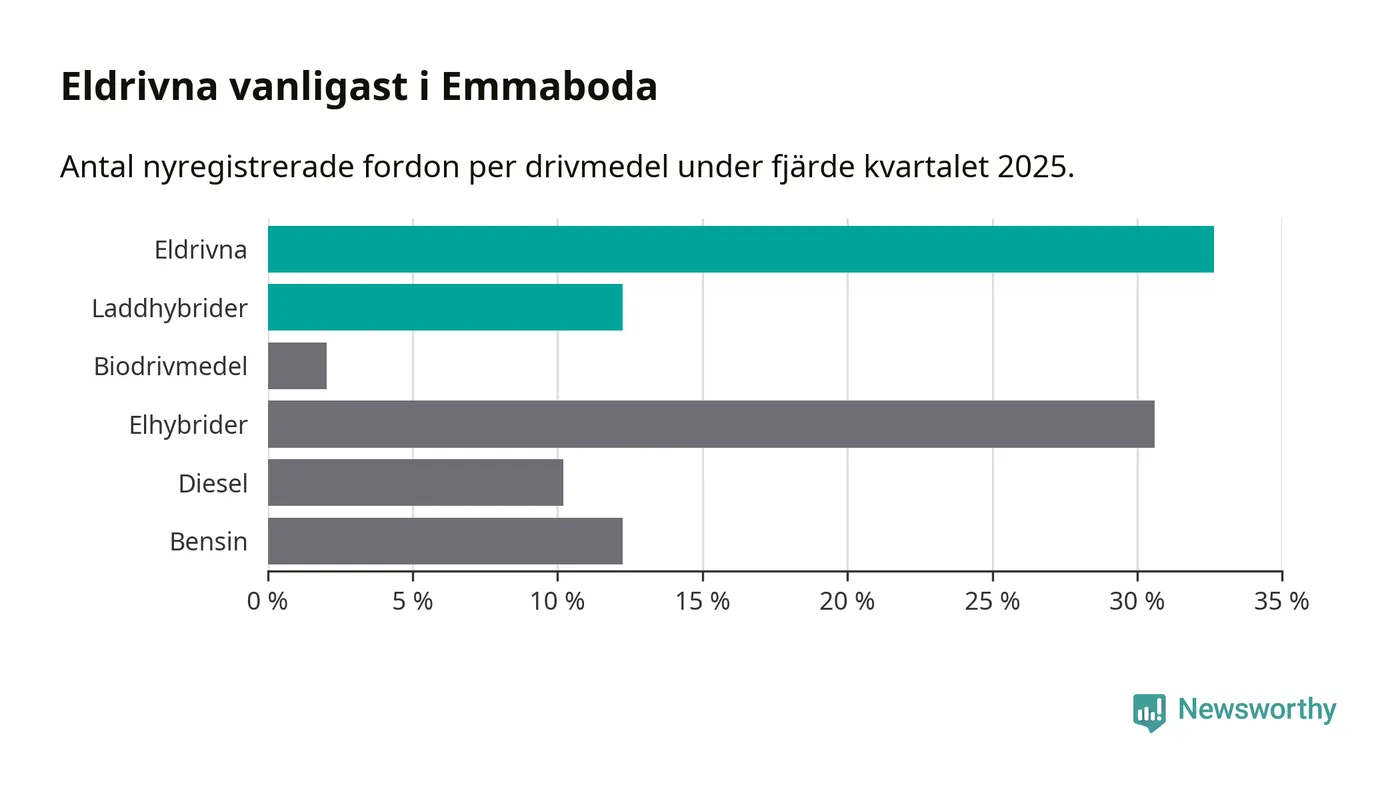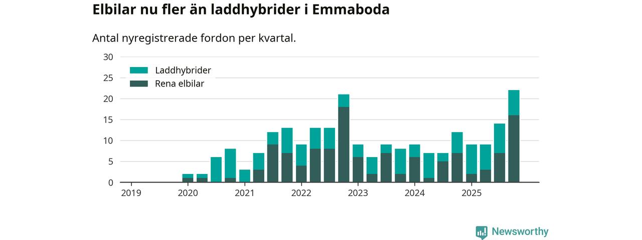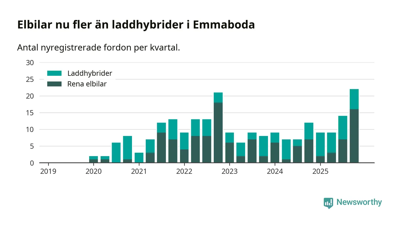 Under fjärde kvartalet 2025 var 45 procent av alla nyregistrerade personbilar i Emmaboda laddbara (sammanlagt registrerades 49 nya bilar). Merparten av de laddbara bilarna var rena elbilar (33 procent av alla).