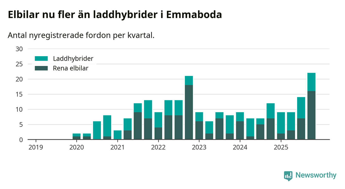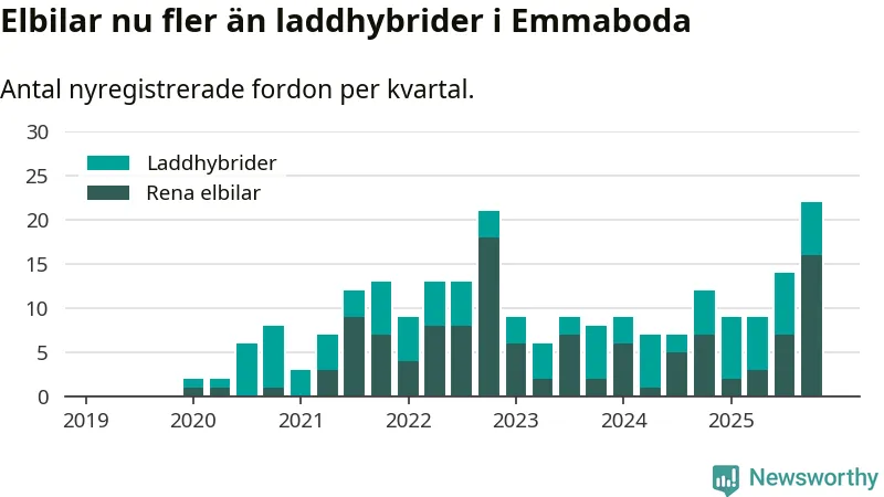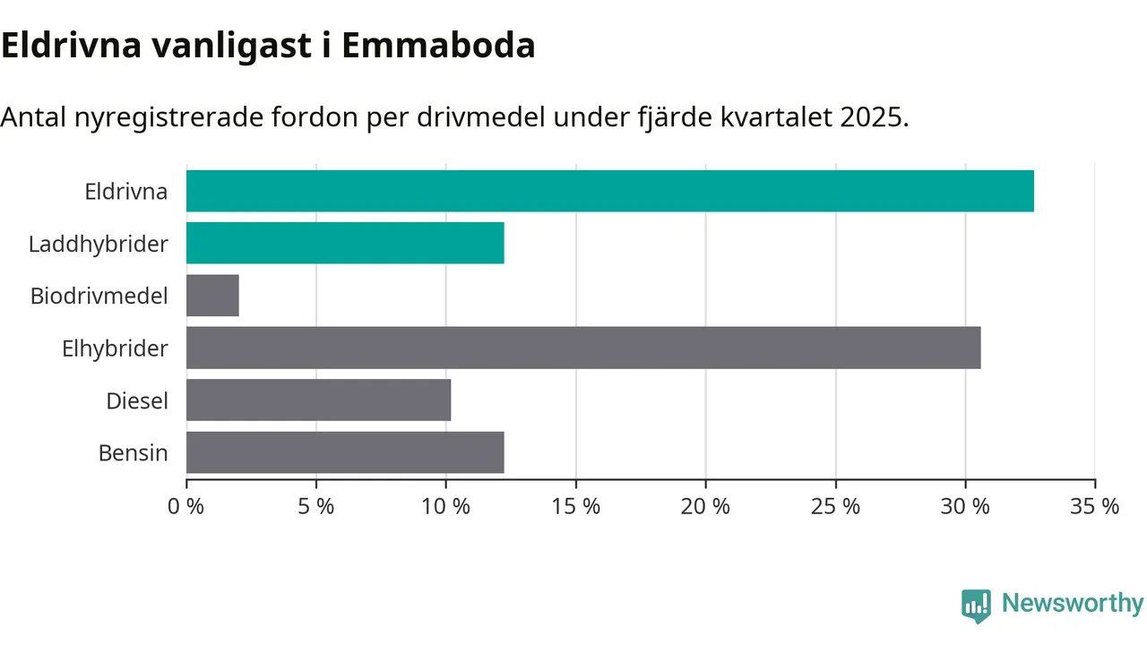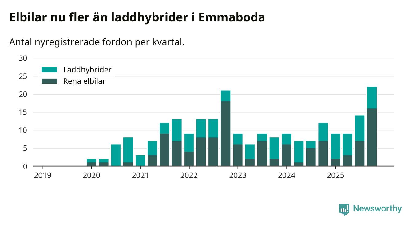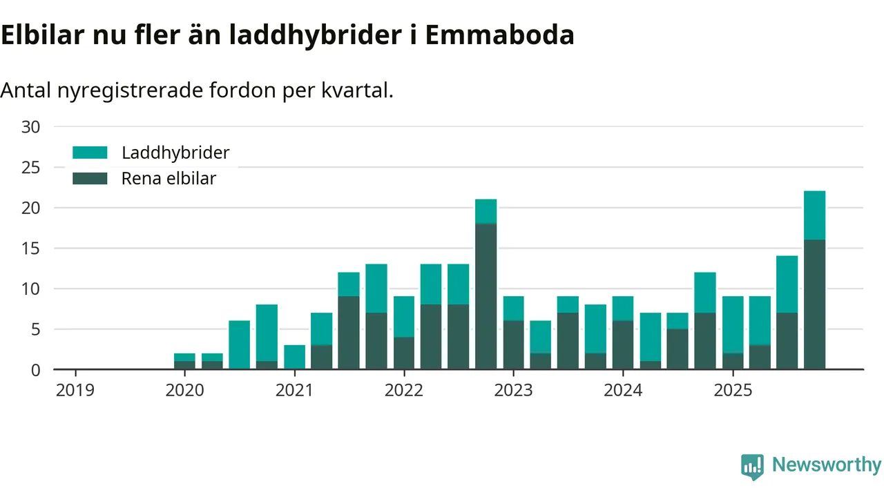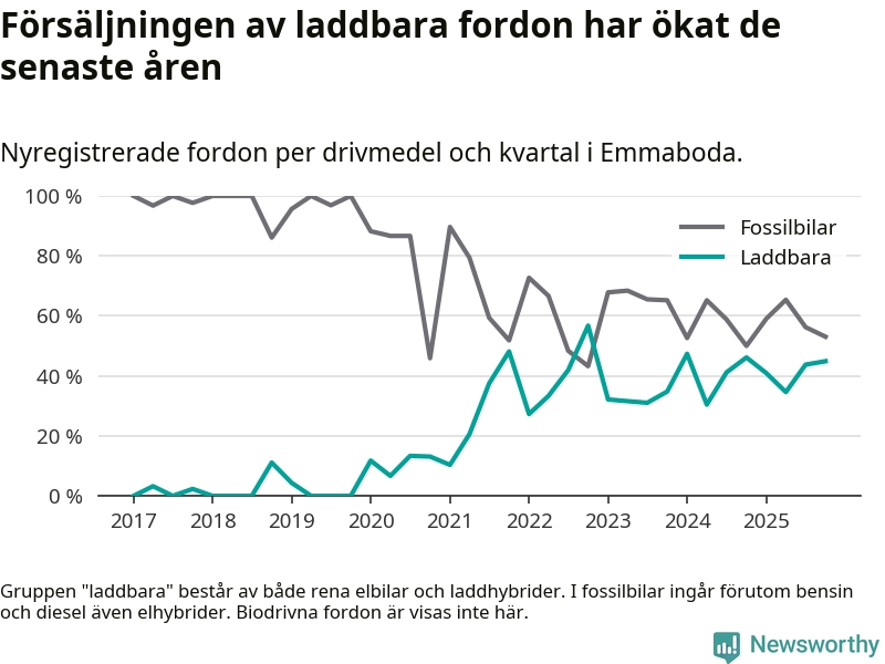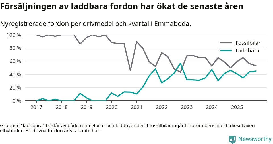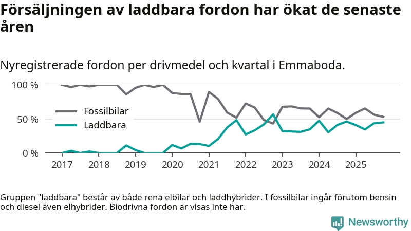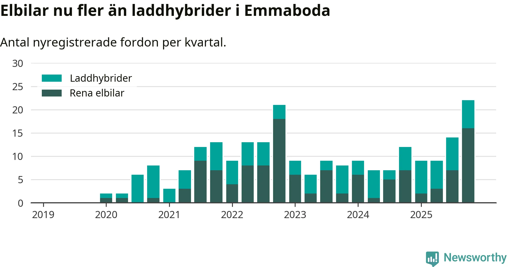 Under fjärde kvartalet 2025 var 45 procent av alla nyregistrerade personbilar i Emmaboda laddbara (sammanlagt registrerades 49 nya bilar). Merparten av de laddbara bilarna var rena elbilar (33 procent av alla).