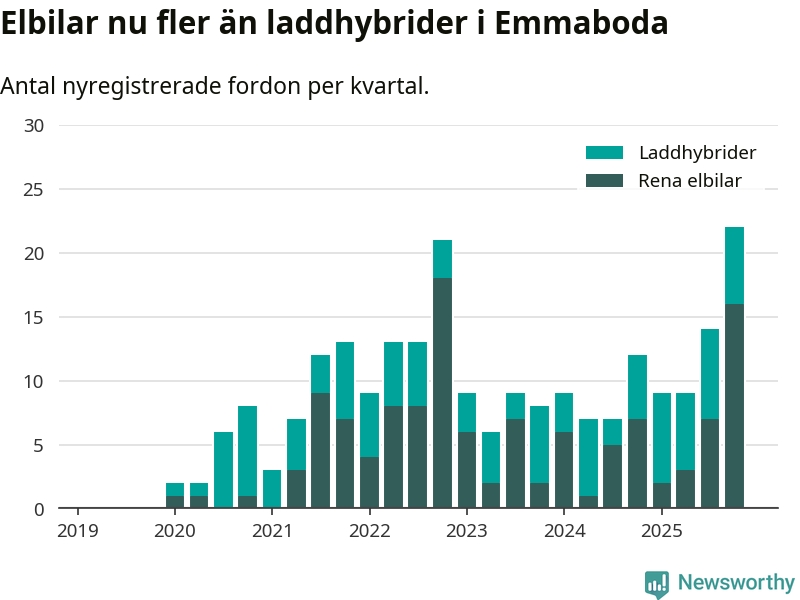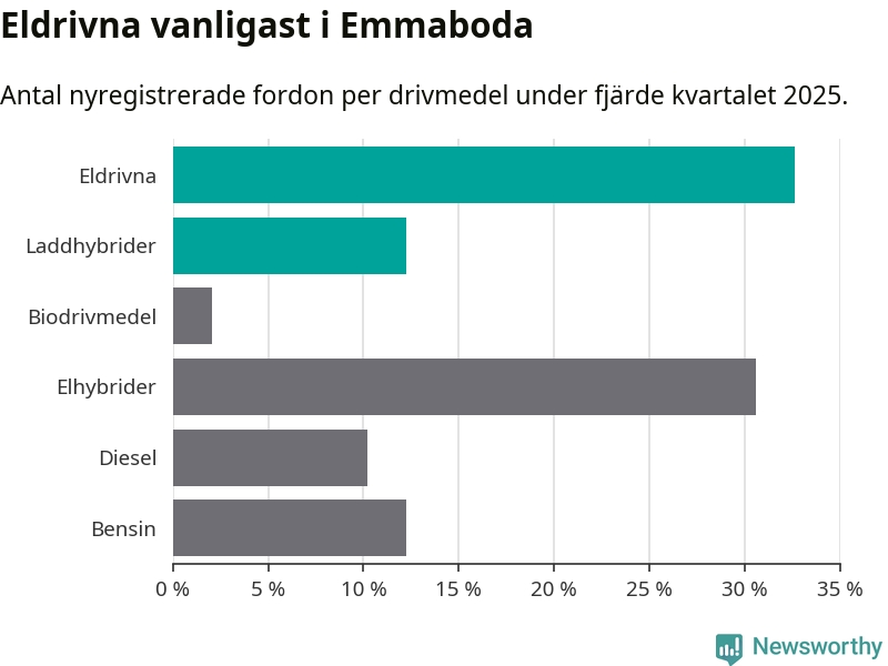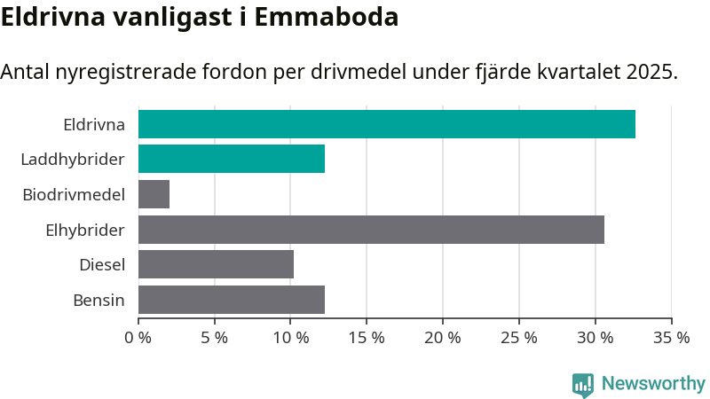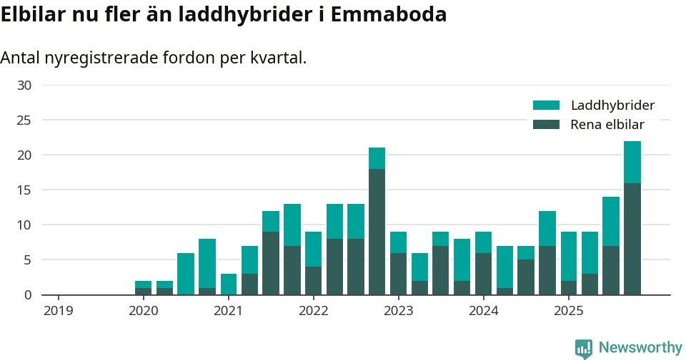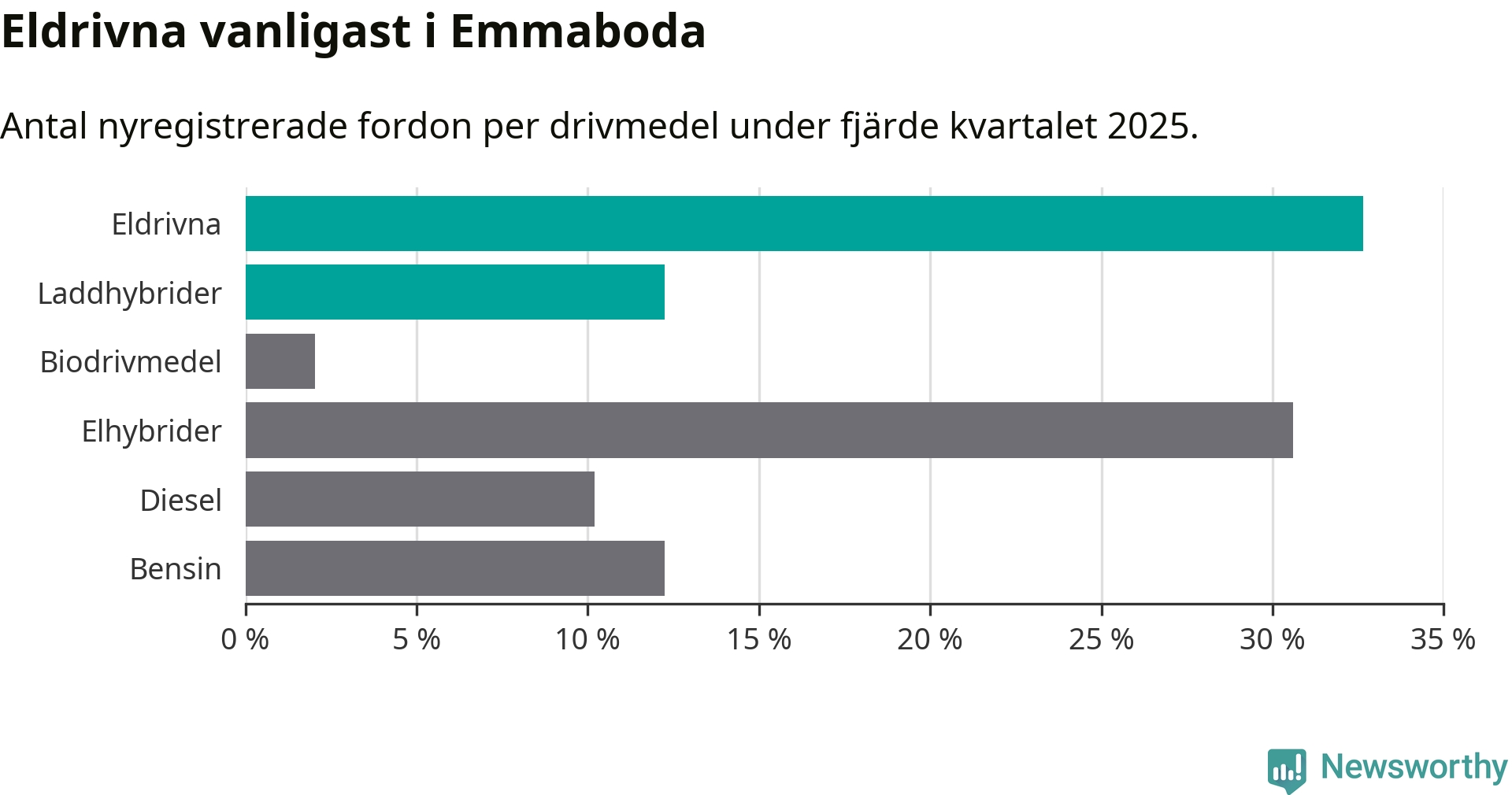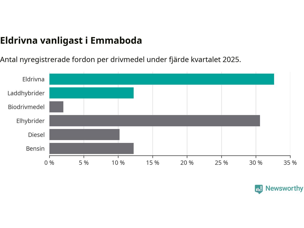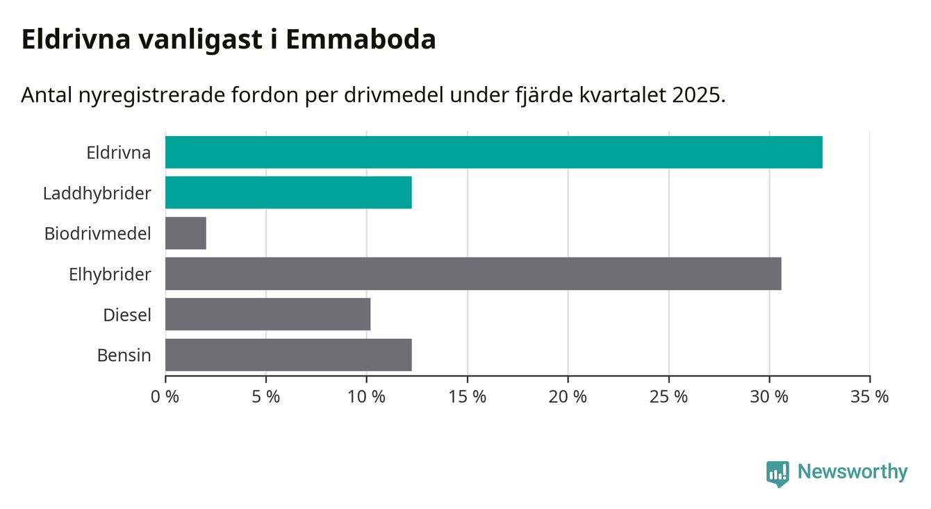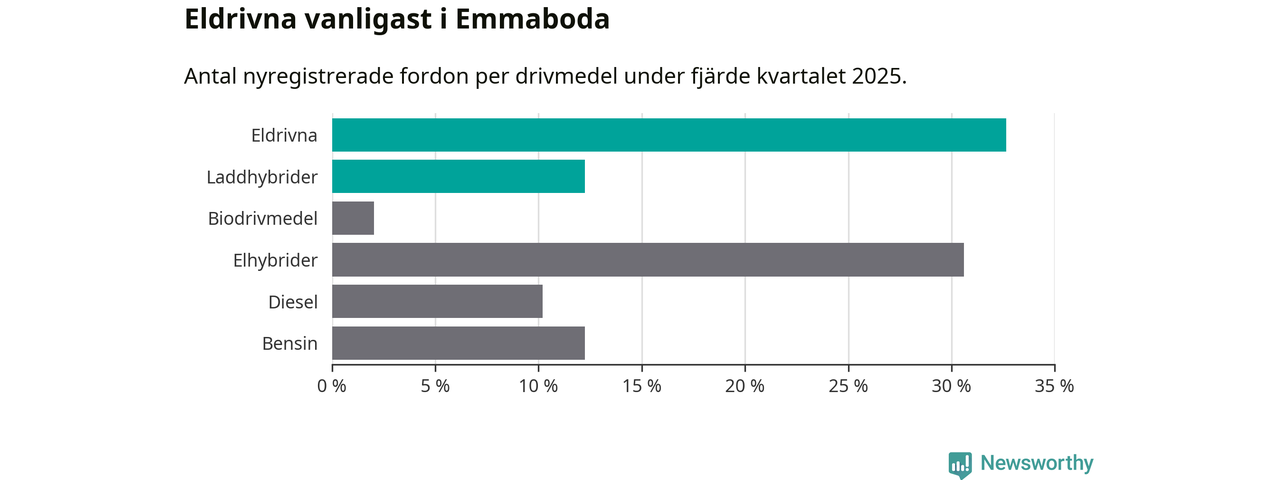 Under fjärde kvartalet 2025 var 45 procent av alla nyregistrerade personbilar i Emmaboda laddbara (sammanlagt registrerades 49 nya bilar). Merparten av de laddbara bilarna var rena elbilar (33 procent av alla).