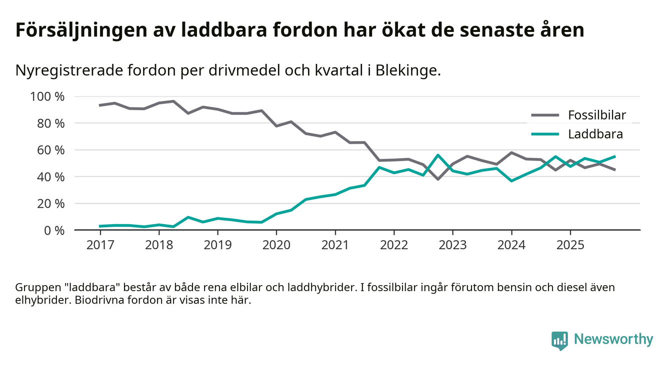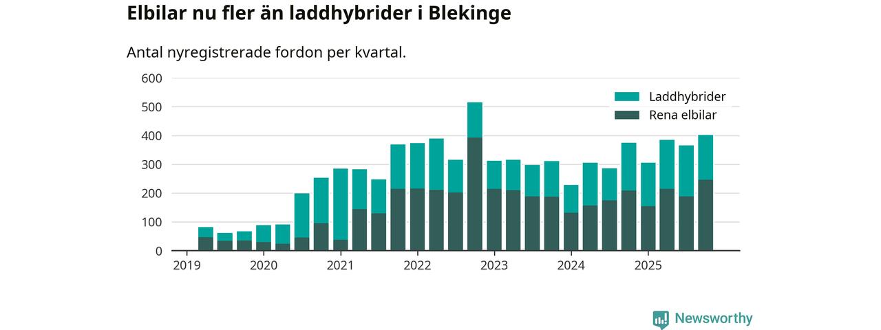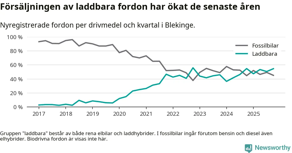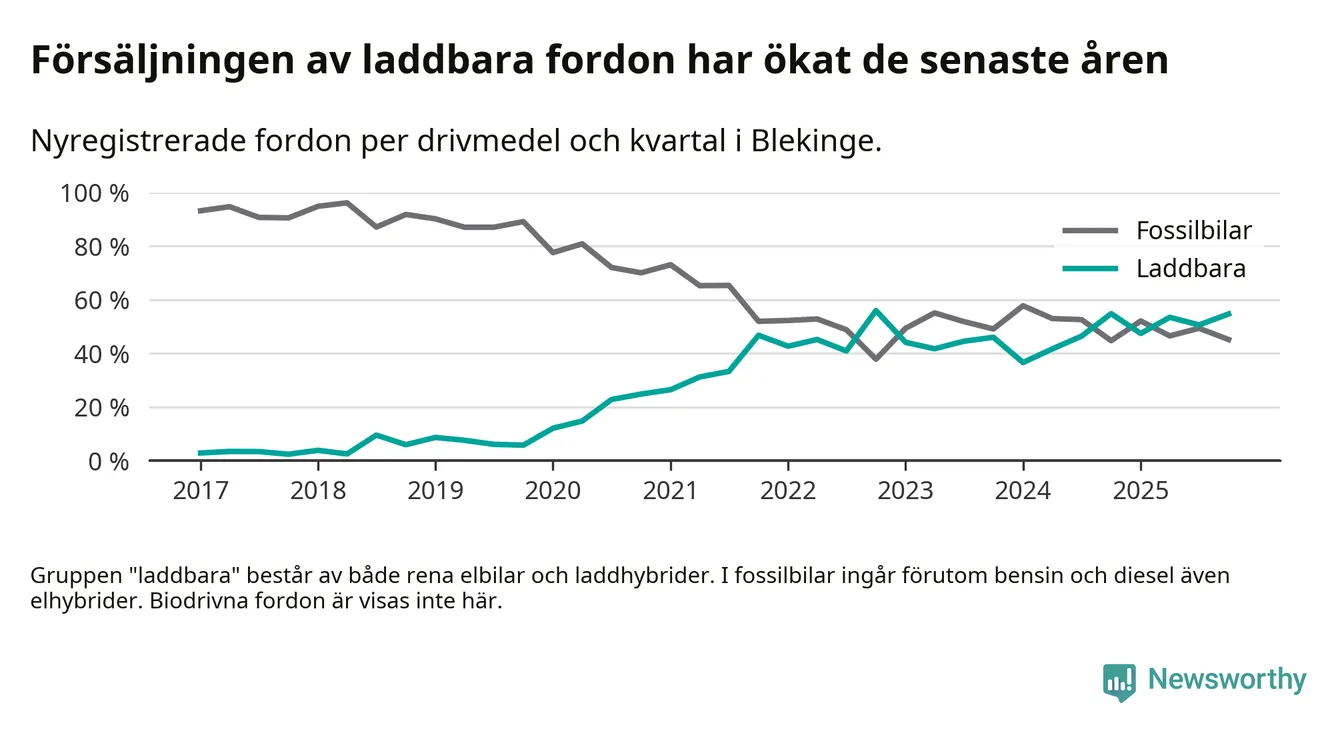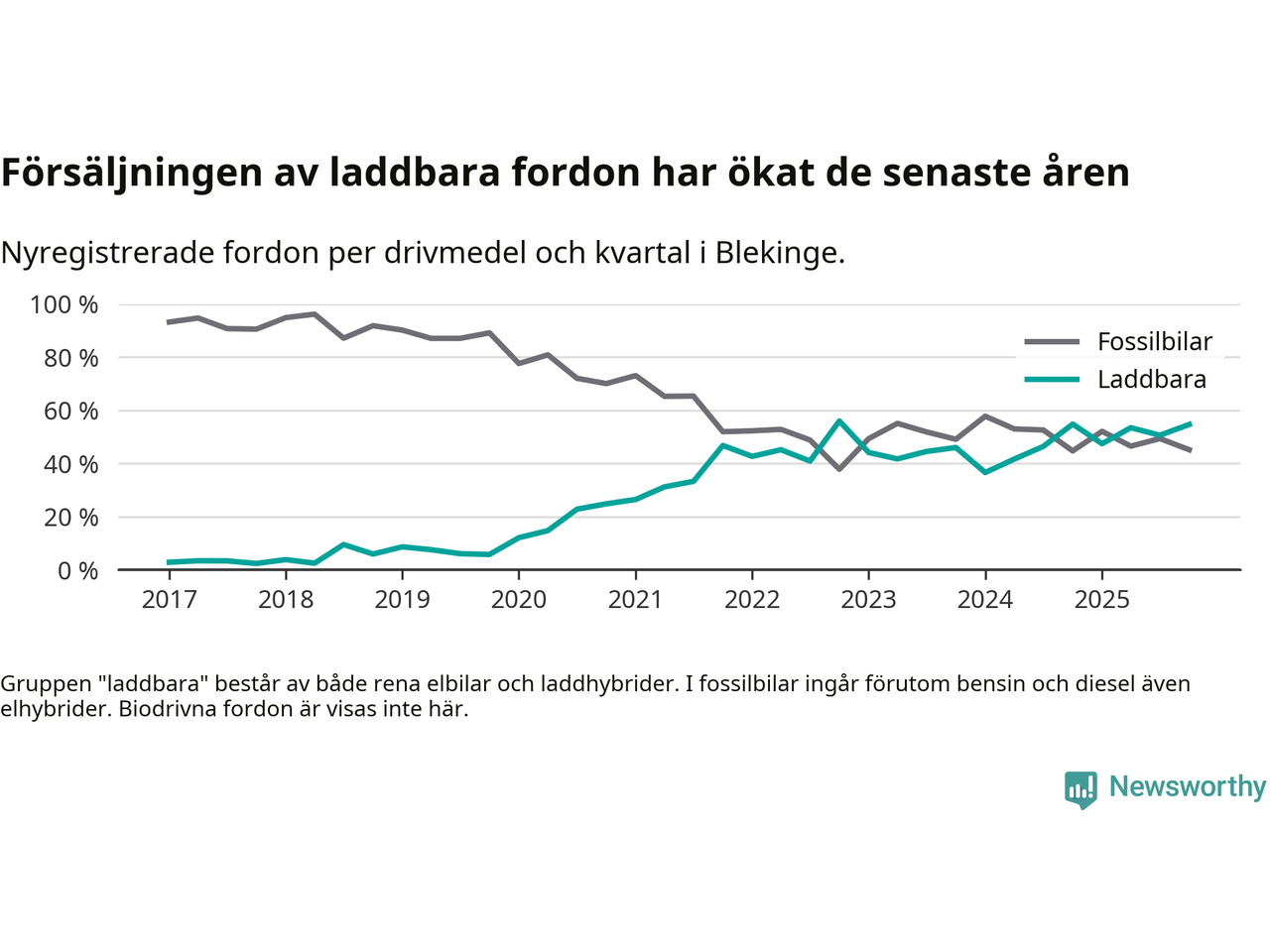 Under fjärde kvartalet 2025 var 55 procent av alla nyregistrerade personbilar i Blekinge laddbara (sammanlagt registrerades 735 nya bilar). Merparten av de laddbara bilarna var rena elbilar (33 procent av alla).