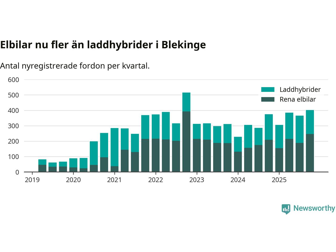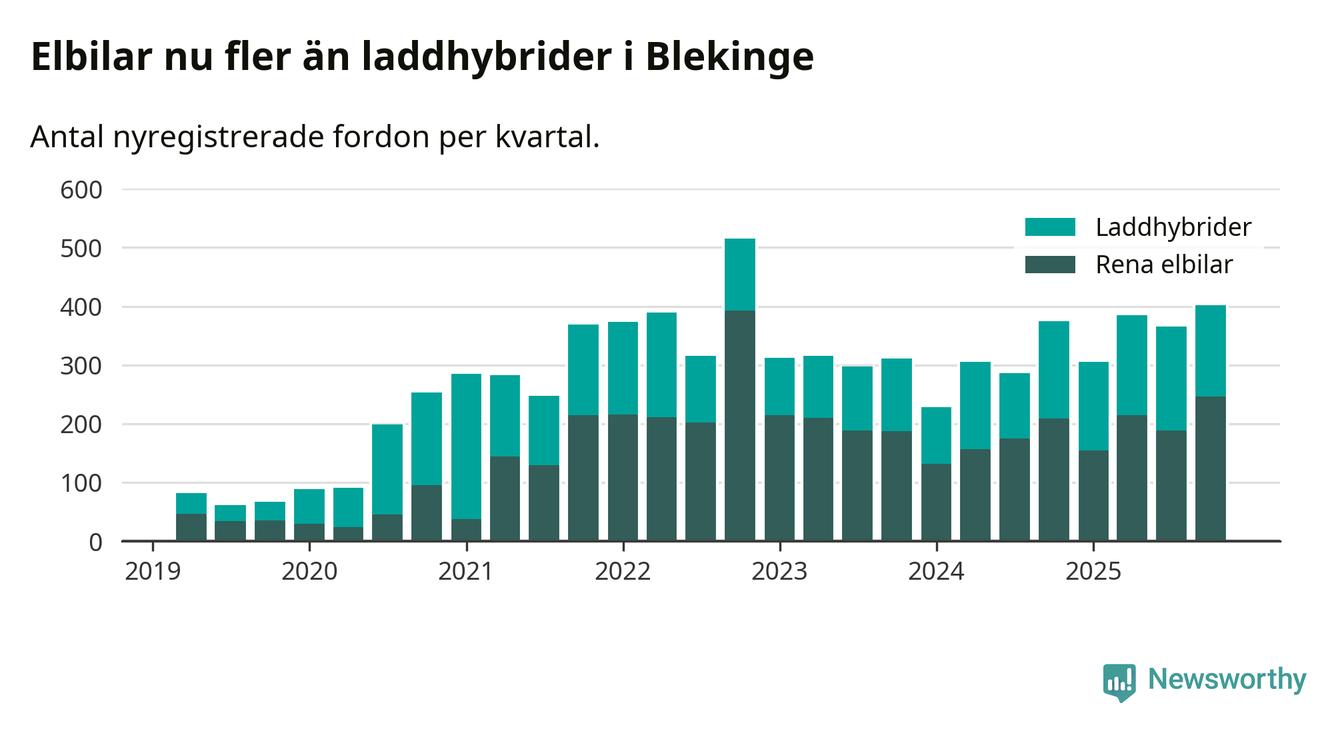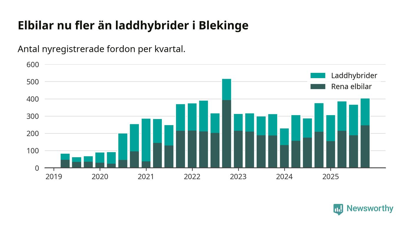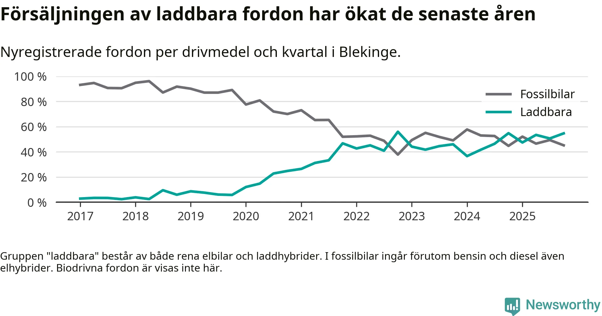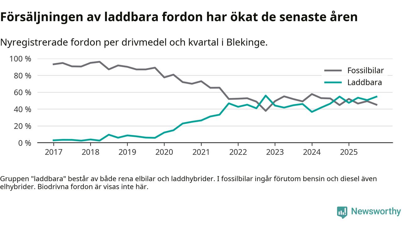 Under fjärde kvartalet 2025 var 55 procent av alla nyregistrerade personbilar i Blekinge laddbara (sammanlagt registrerades 735 nya bilar). Merparten av de laddbara bilarna var rena elbilar (33 procent av alla).