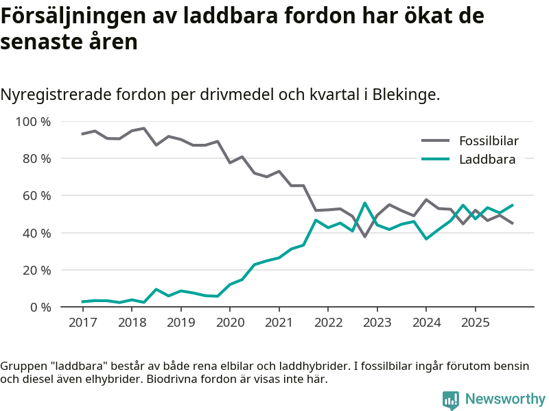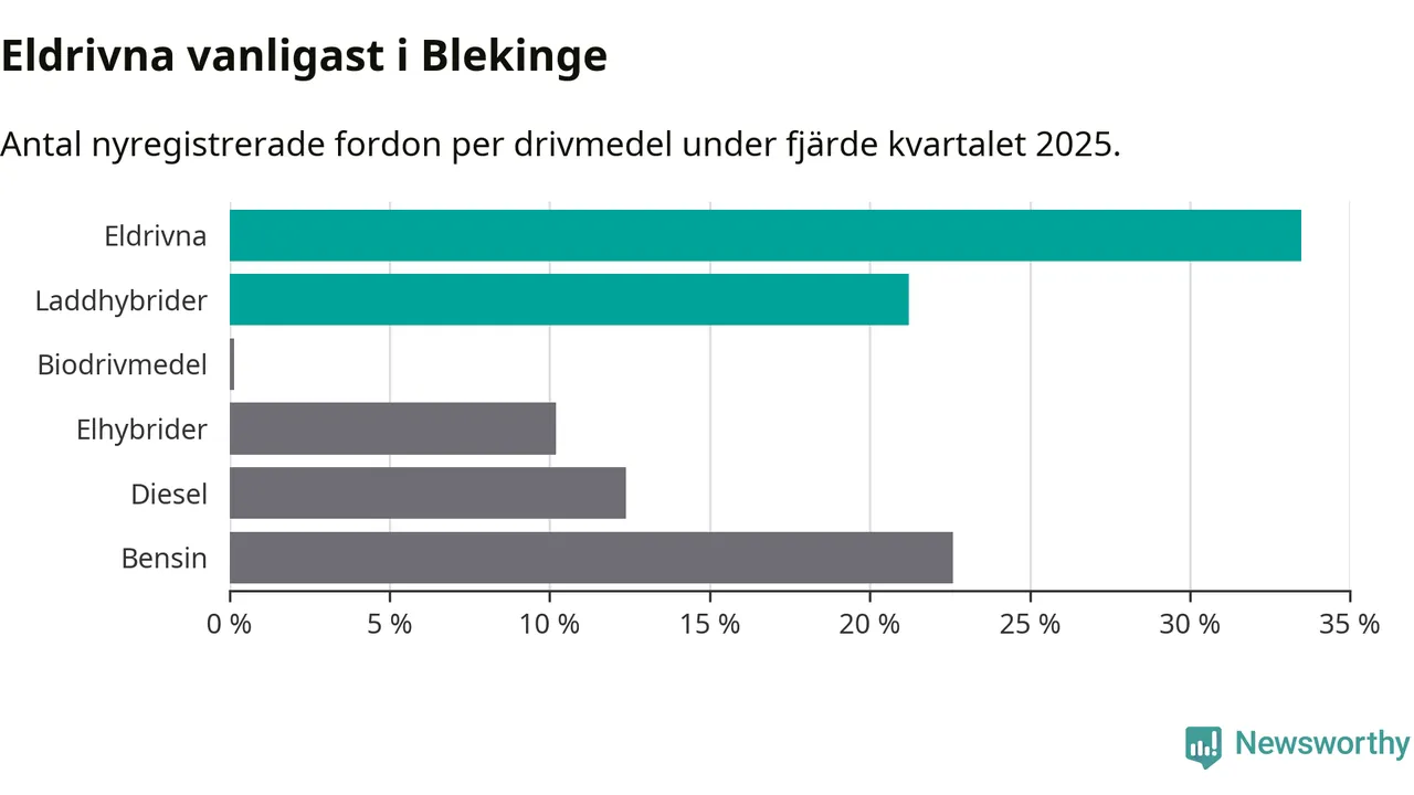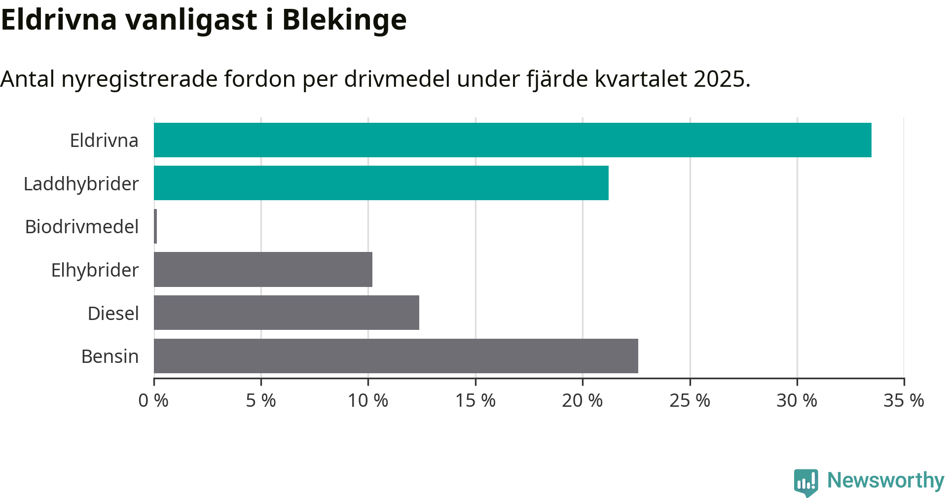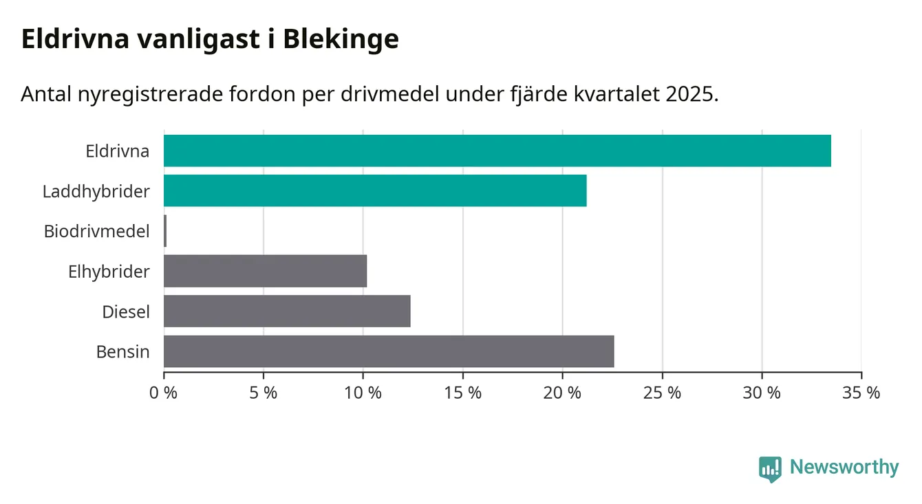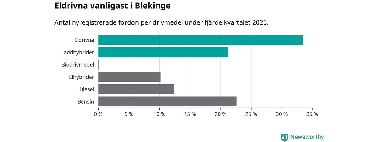 Under fjärde kvartalet 2025 var 55 procent av alla nyregistrerade personbilar i Blekinge laddbara (sammanlagt registrerades 735 nya bilar). Merparten av de laddbara bilarna var rena elbilar (33 procent av alla).