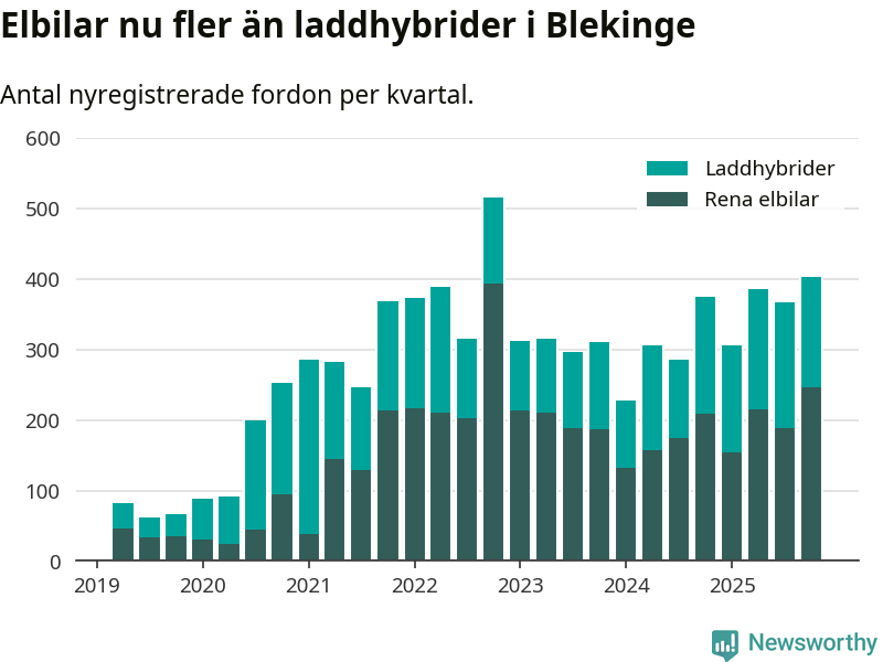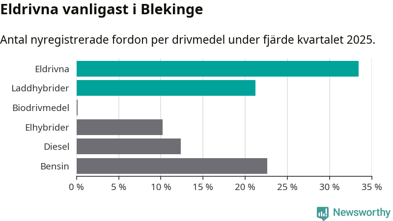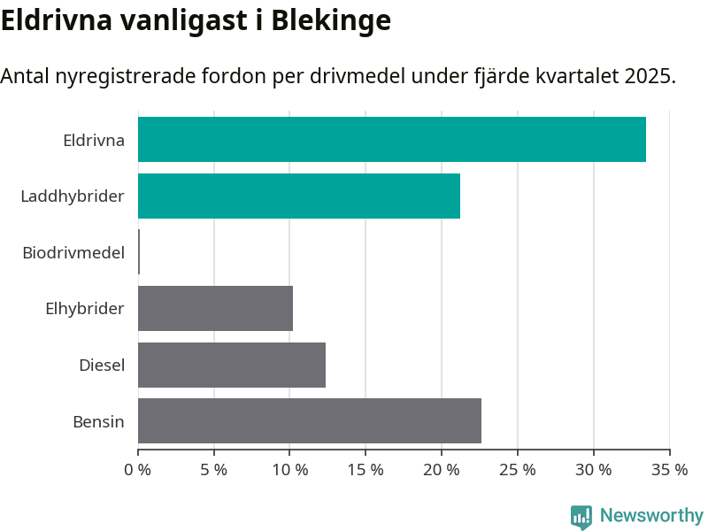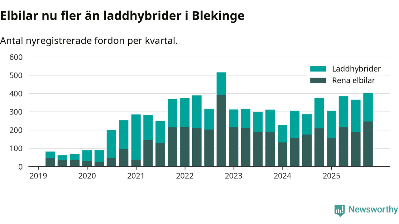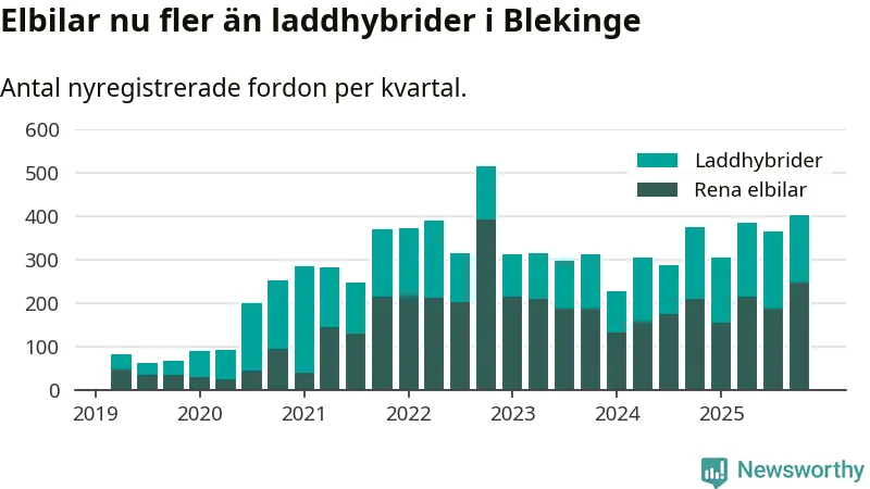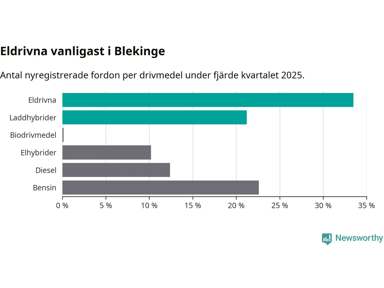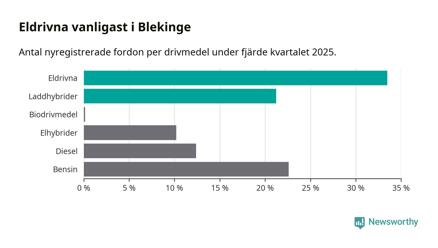 Under fjärde kvartalet 2025 var 55 procent av alla nyregistrerade personbilar i Blekinge laddbara (sammanlagt registrerades 735 nya bilar). Merparten av de laddbara bilarna var rena elbilar (33 procent av alla).