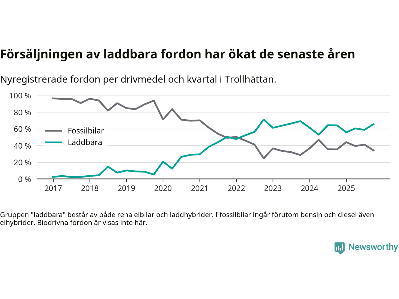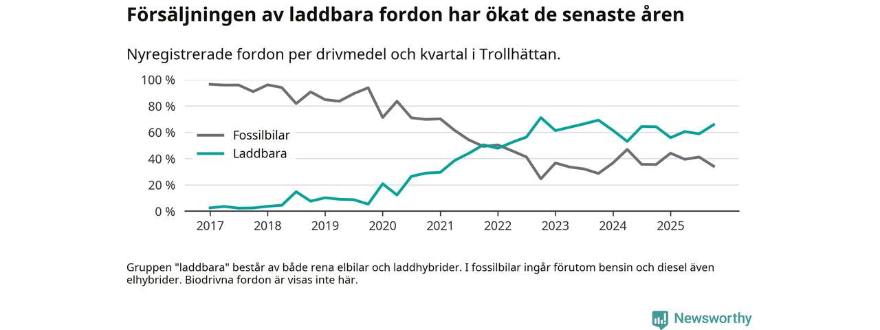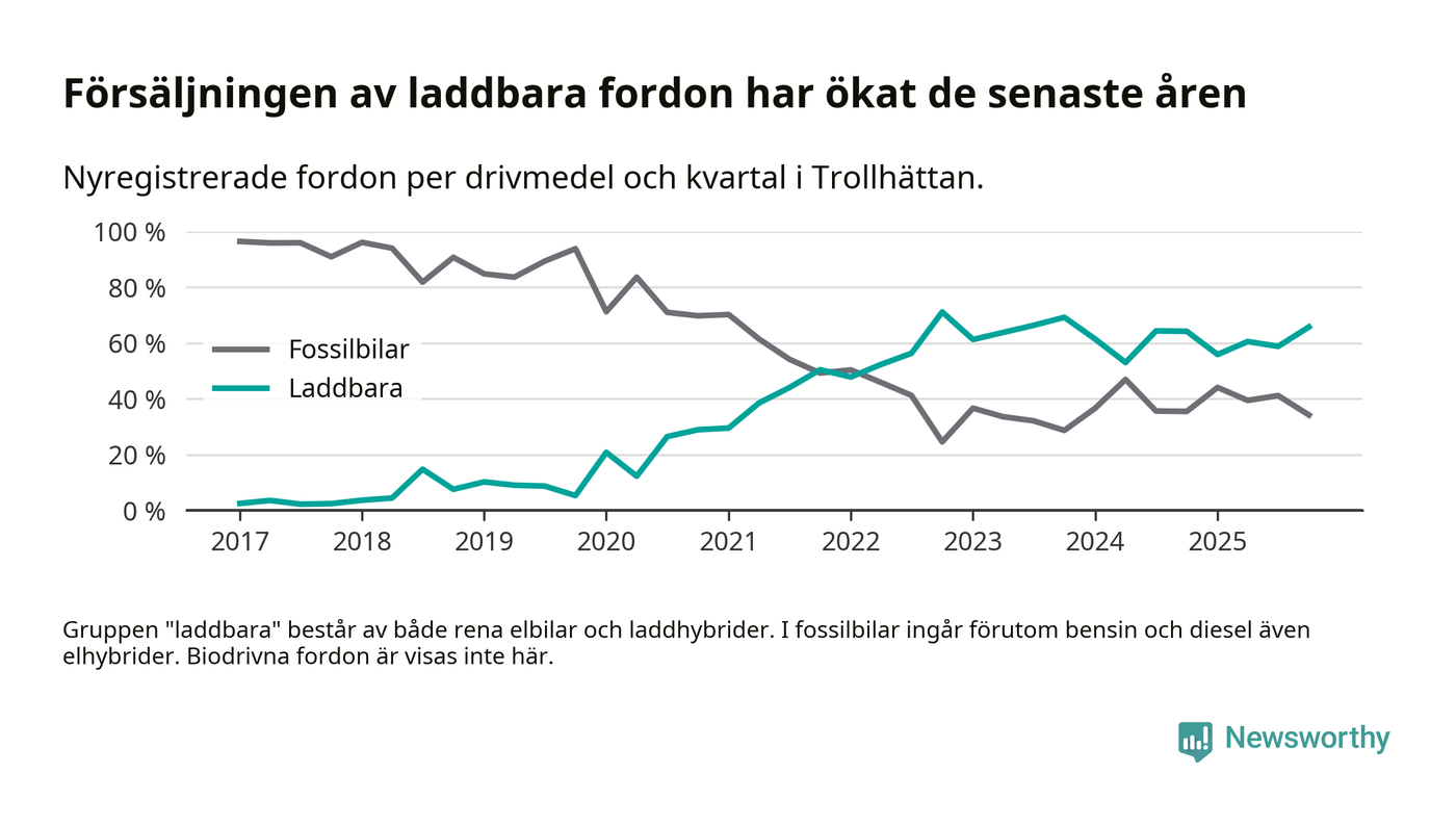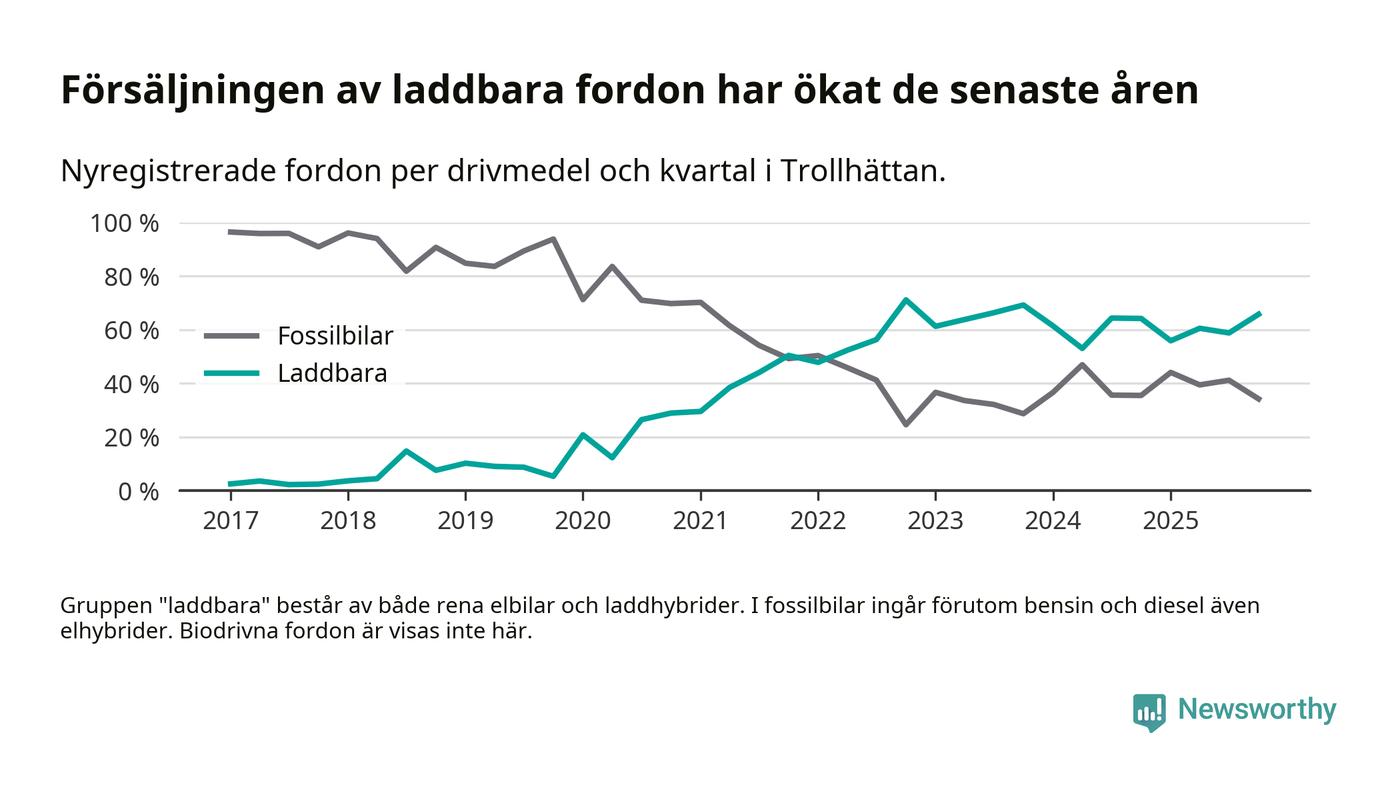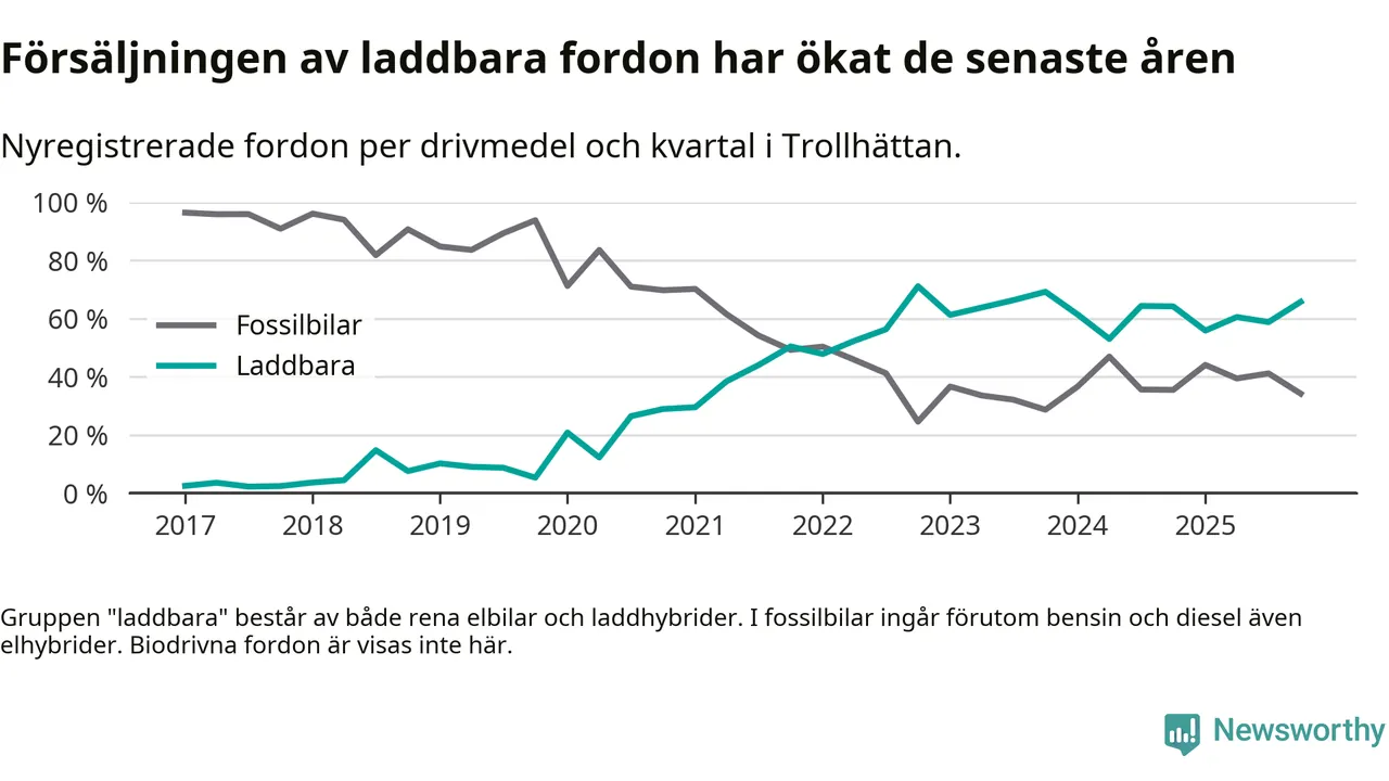 Under fjärde kvartalet 2025 var 66 procent av alla nyregistrerade personbilar i Trollhättan laddbara (sammanlagt registrerades 342 nya bilar). Merparten av de laddbara bilarna var rena elbilar (46 procent av alla).