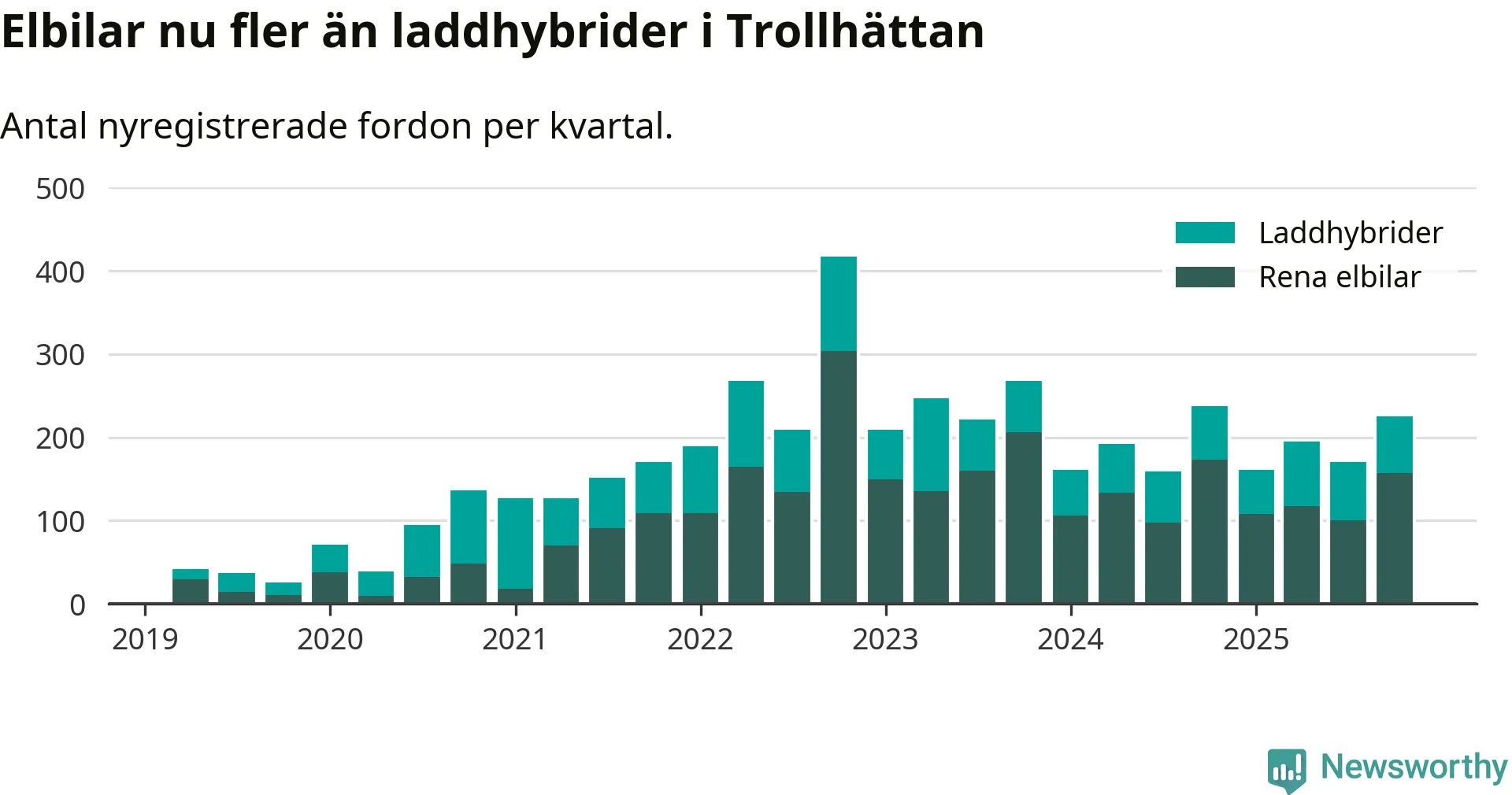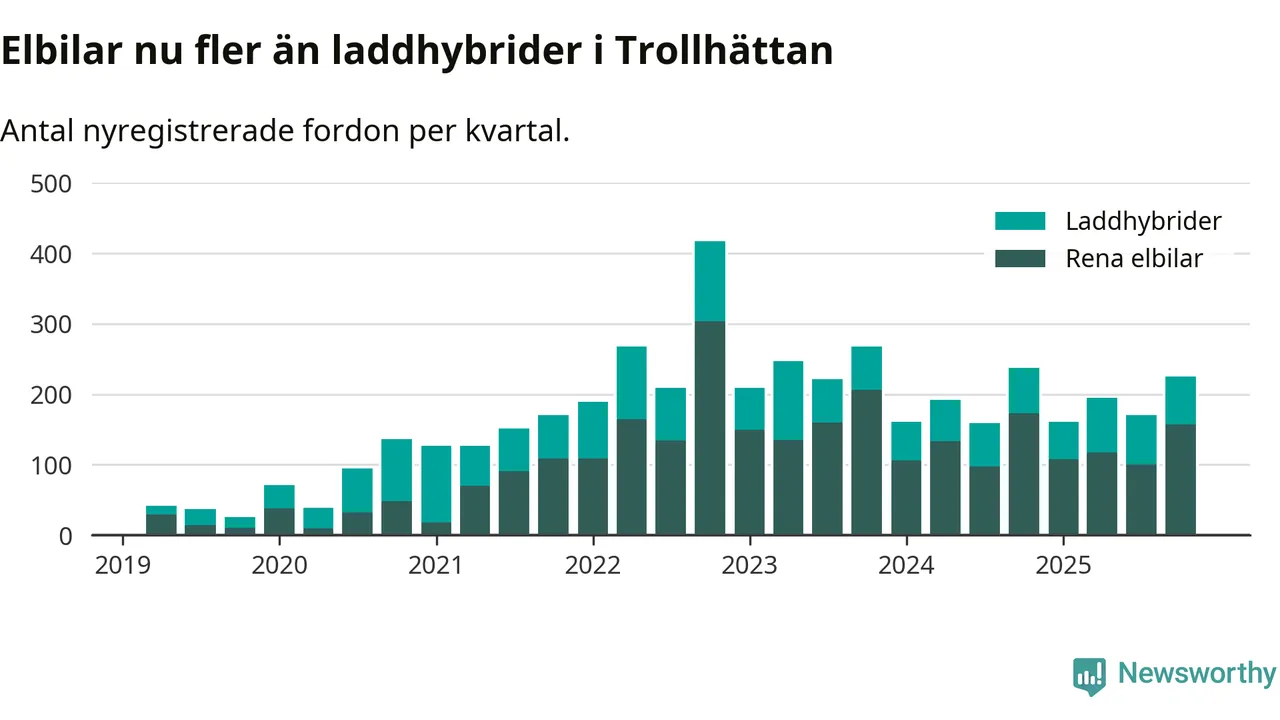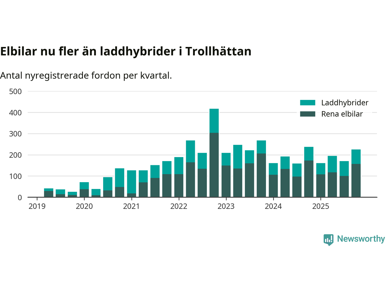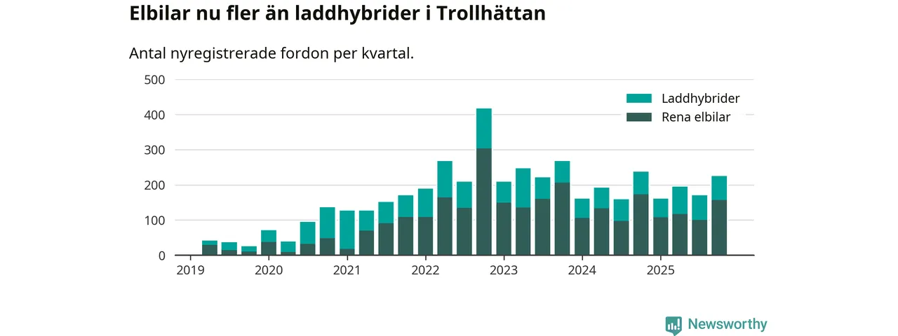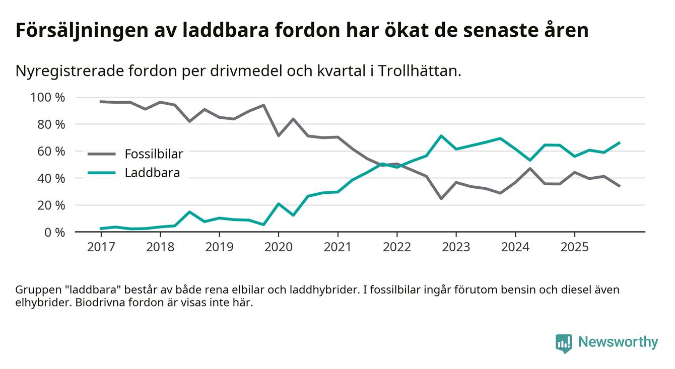Under fjärde kvartalet 2025 var 66 procent av alla nyregistrerade personbilar i Trollhättan laddbara (sammanlagt registrerades 342 nya bilar). Merparten av de laddbara bilarna var rena elbilar (46 procent av alla).
