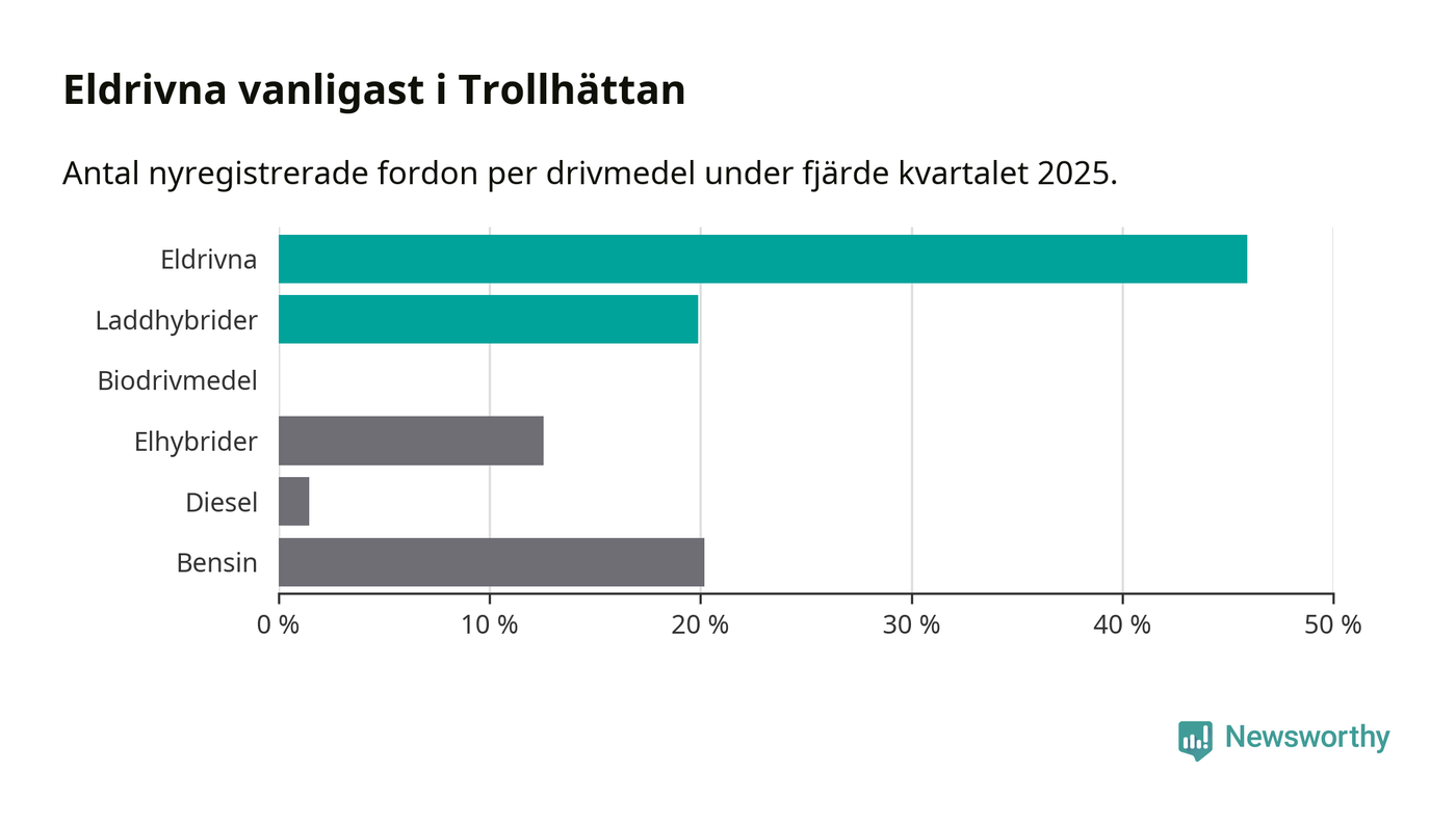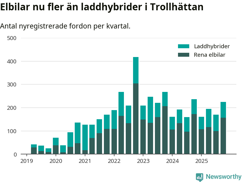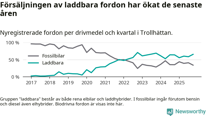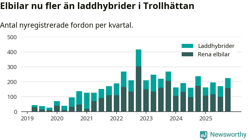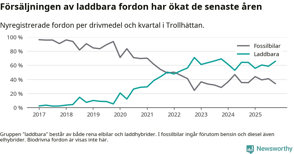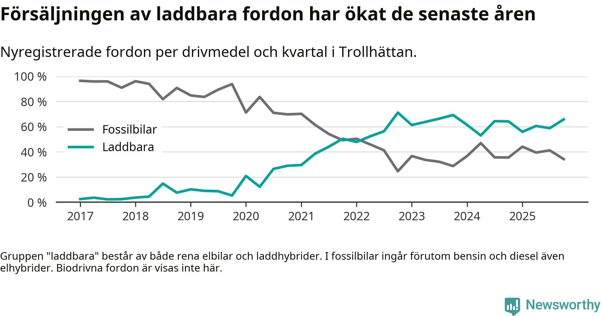 Under fjärde kvartalet 2025 var 66 procent av alla nyregistrerade personbilar i Trollhättan laddbara (sammanlagt registrerades 342 nya bilar). Merparten av de laddbara bilarna var rena elbilar (46 procent av alla).